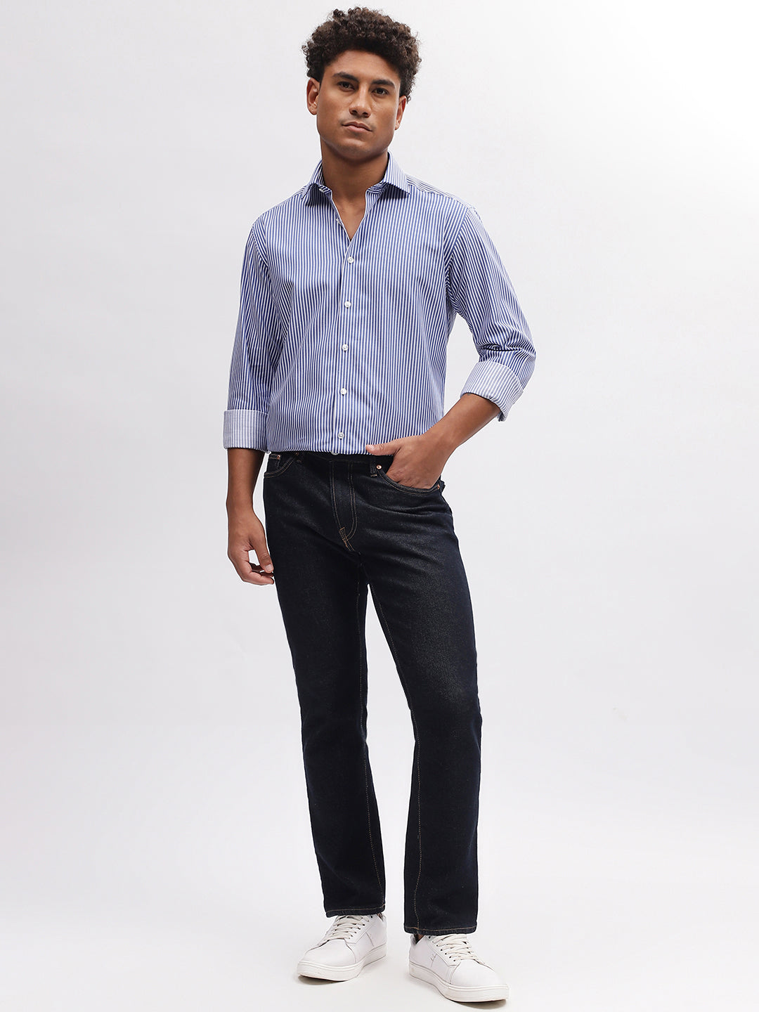 Men Blue Striped Cutaway Collar Full Sleeves Shirt