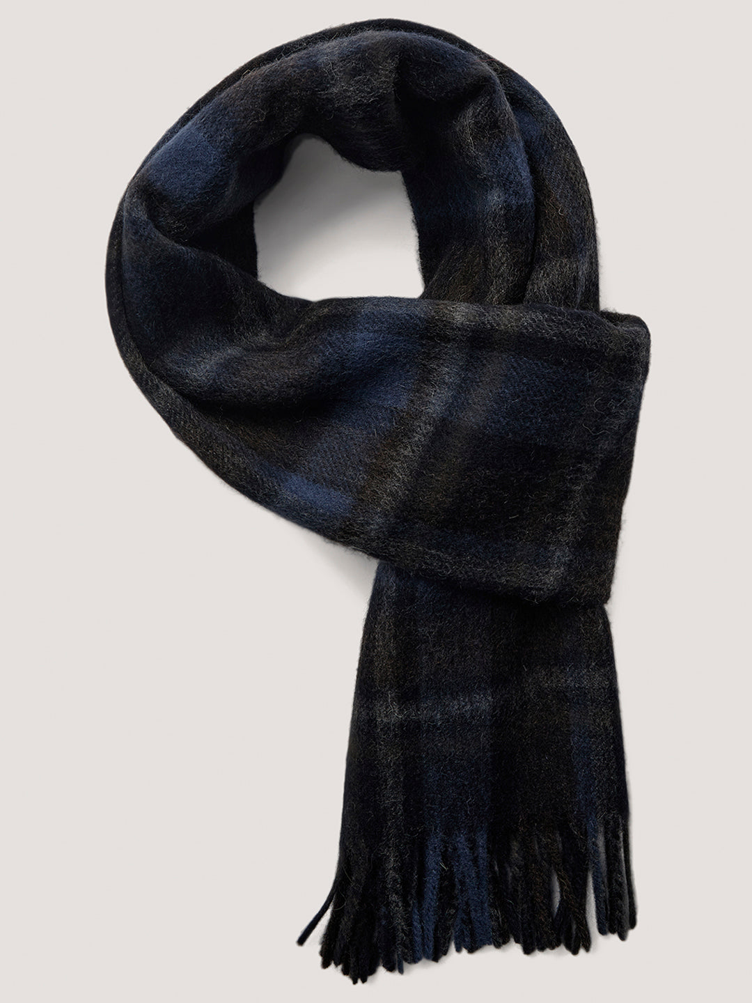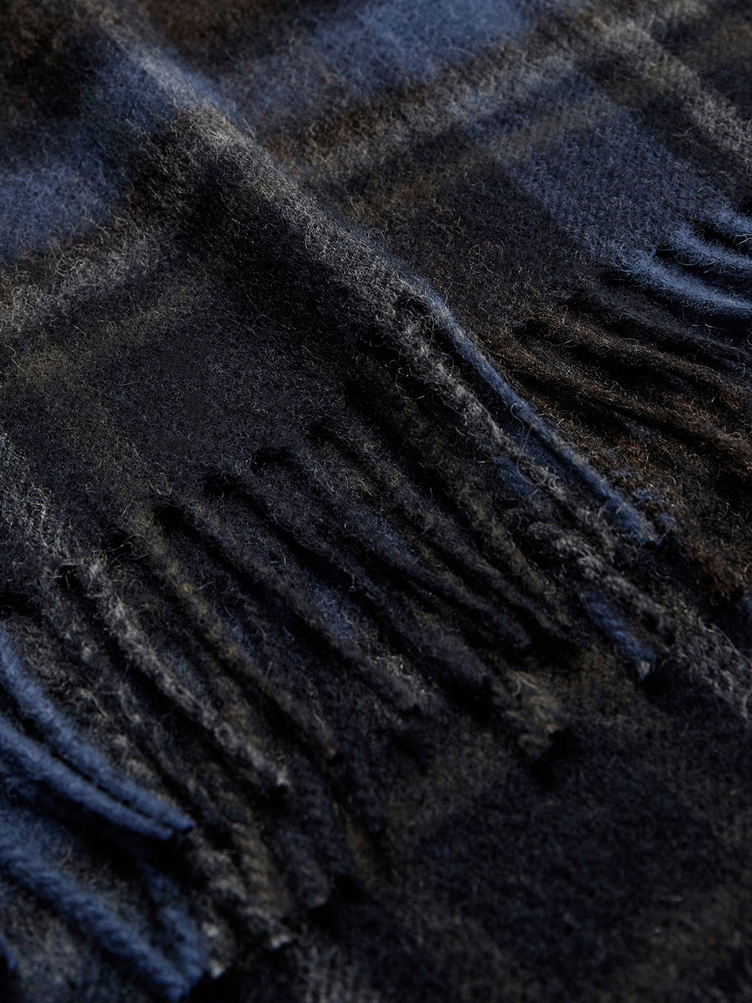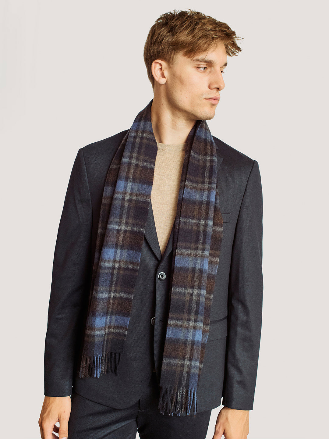 A bold statement in blue wool, this fringed muffler features a classic checked pattern, adding a touch of rugged sophistication to any winter ensemble.