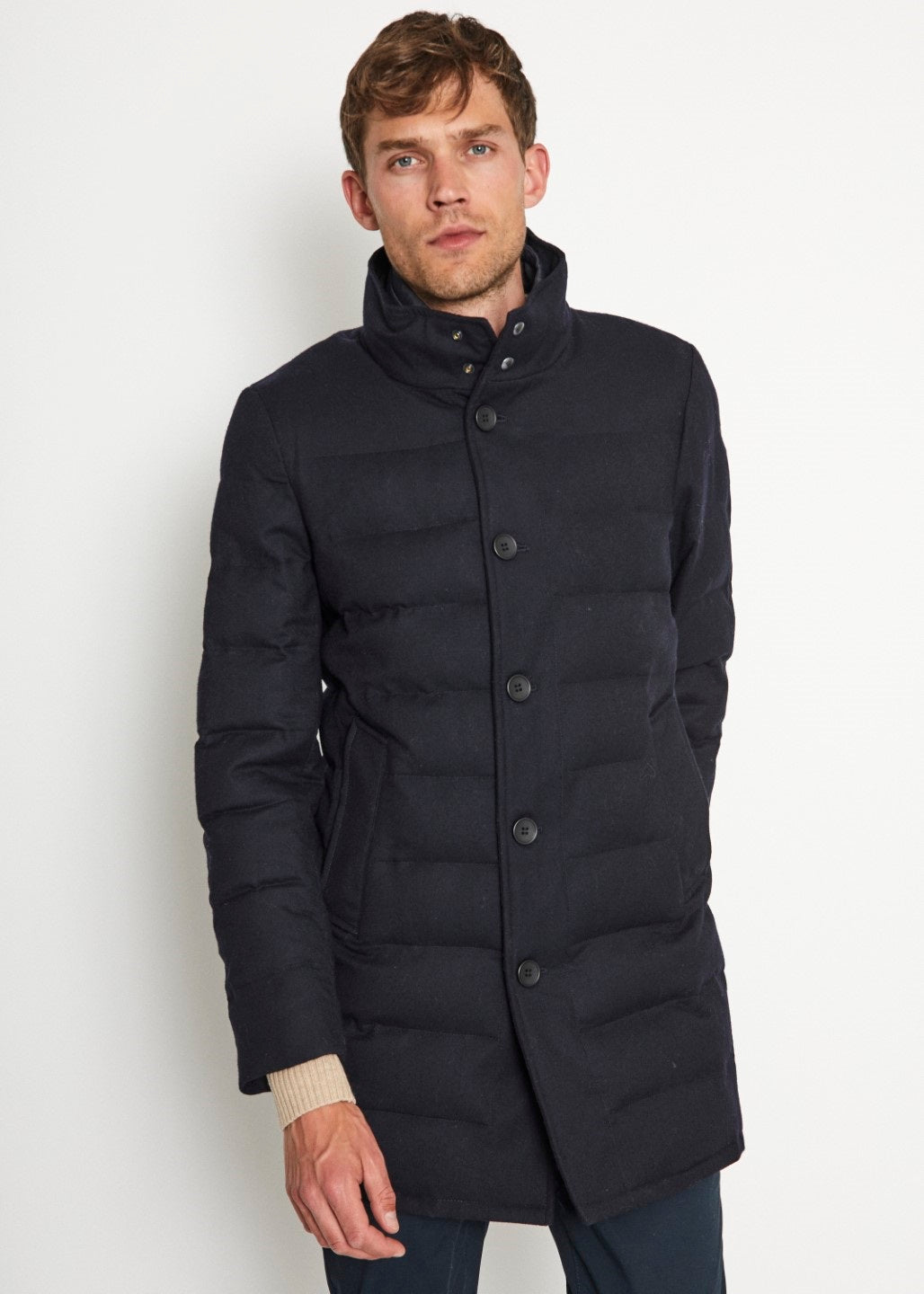 The bruun & stengade men blue solid Stand collar long sleeves overcoat is a stylish and sophisticated outerwear option for the modern man. Made from high-quality materials, this overcoat features a classic Stand collar and long sleeves, making it a versatile and timeless addition to any wardrobe. Perfect for both formal and casual occasions.