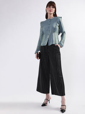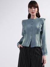 A breezy blue haven. This textured rayon top with full sleeves and a classic round neck offers comfort and style. The button closure adds a touch of elegance, making it perfect for casual days or dressed-up evenings.