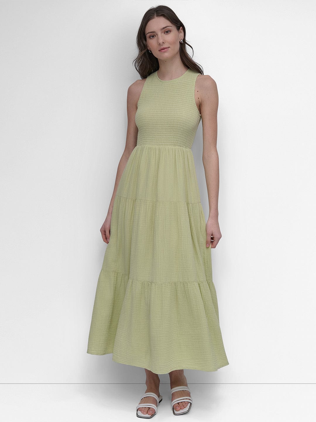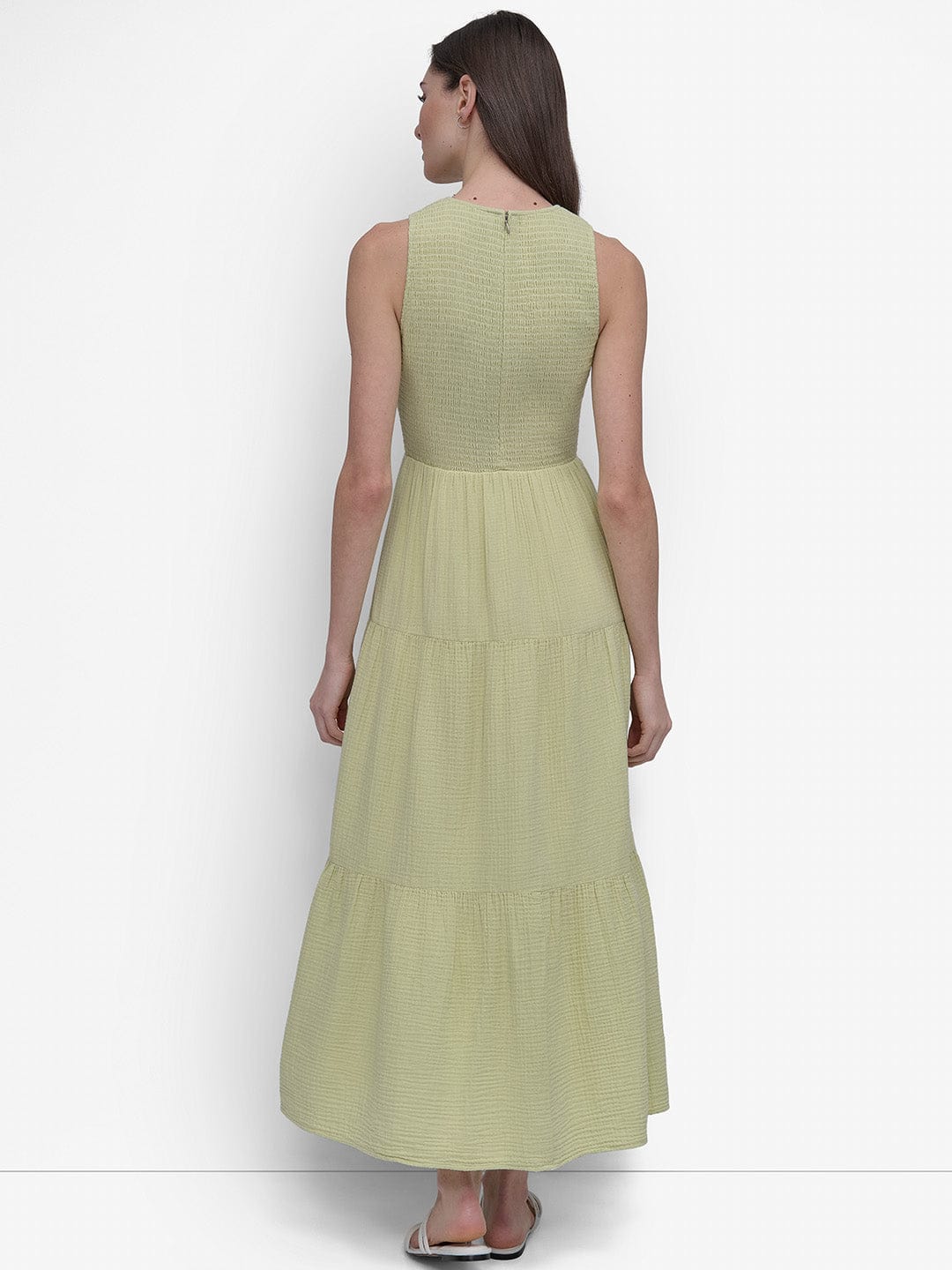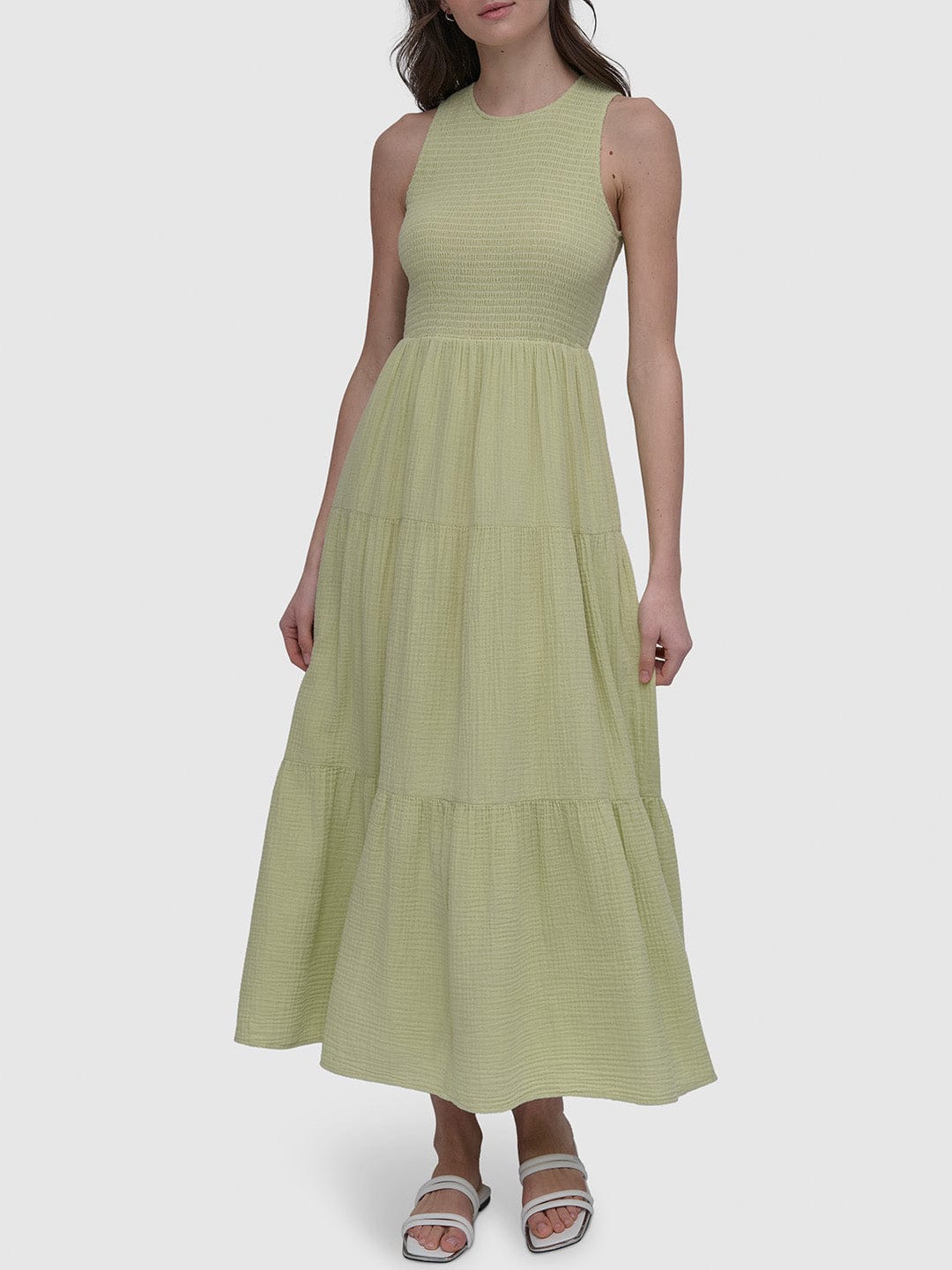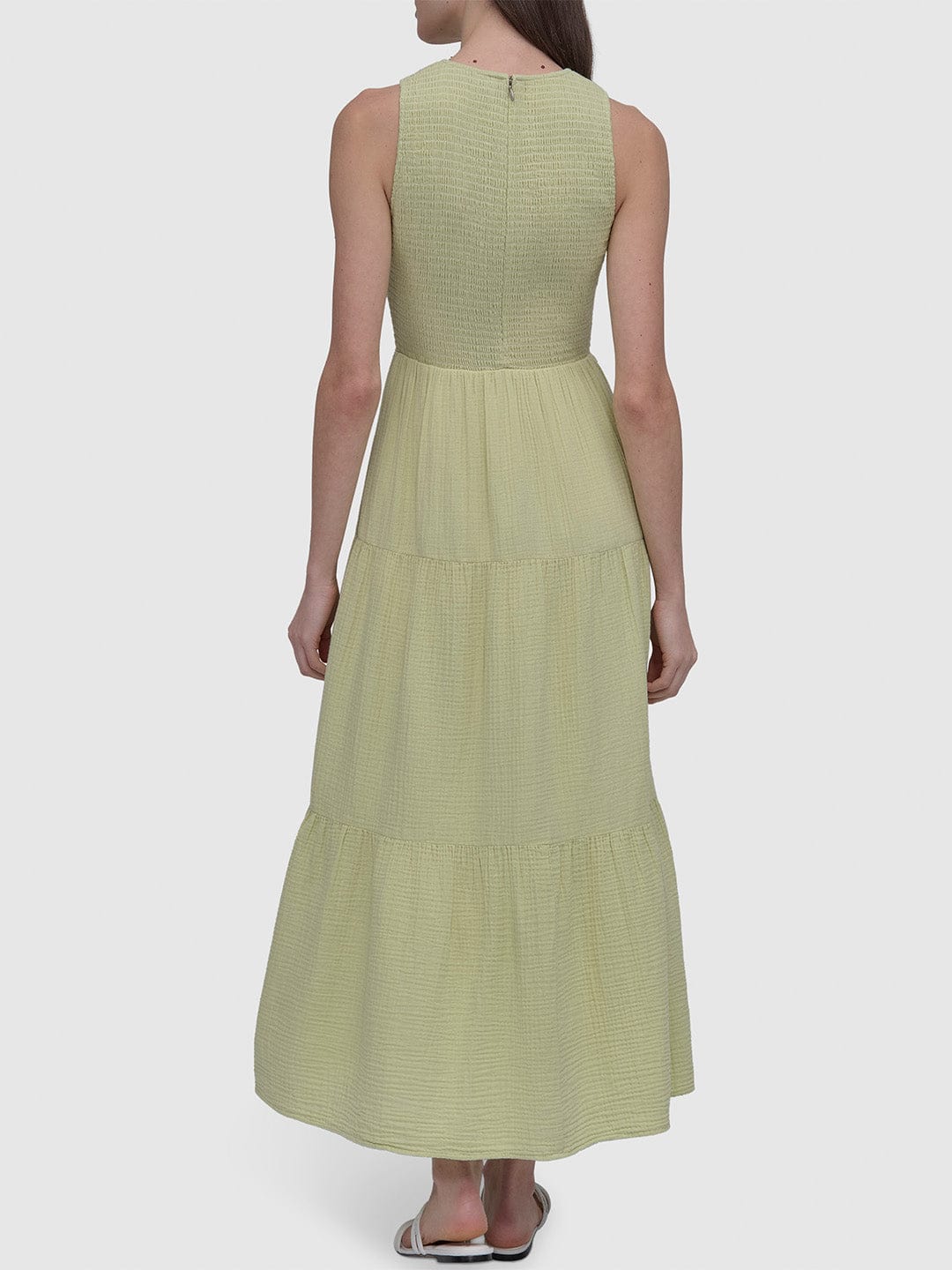 Discover the perfect blend of elegance and comfort with our tiered dress in a refreshing green hue. This fit and flare design features a textured pattern that adds a touch of sophistication to your wardrobe. Crafted from pure cotton fabric, it ensures breathability and ease for all-day wear. The sleeveless cut and round neck offer a classic silhouette, while the solid smocked detailing adds a unique twist. A discreet zipper closure at the back ensures a seamless fit. Ideal for both casual outings and special occasions, this dress is your go-to choice for effortless style and grace.