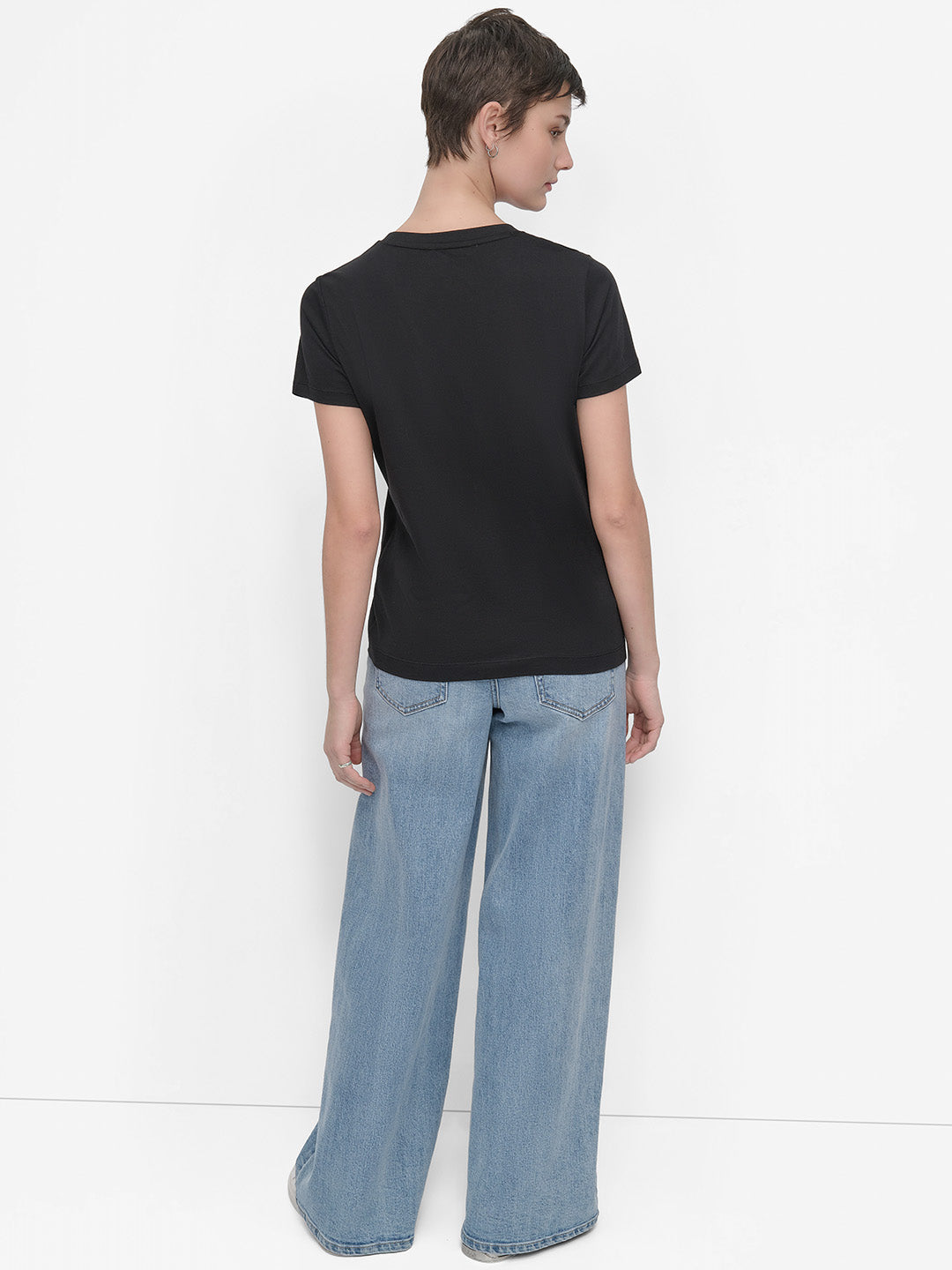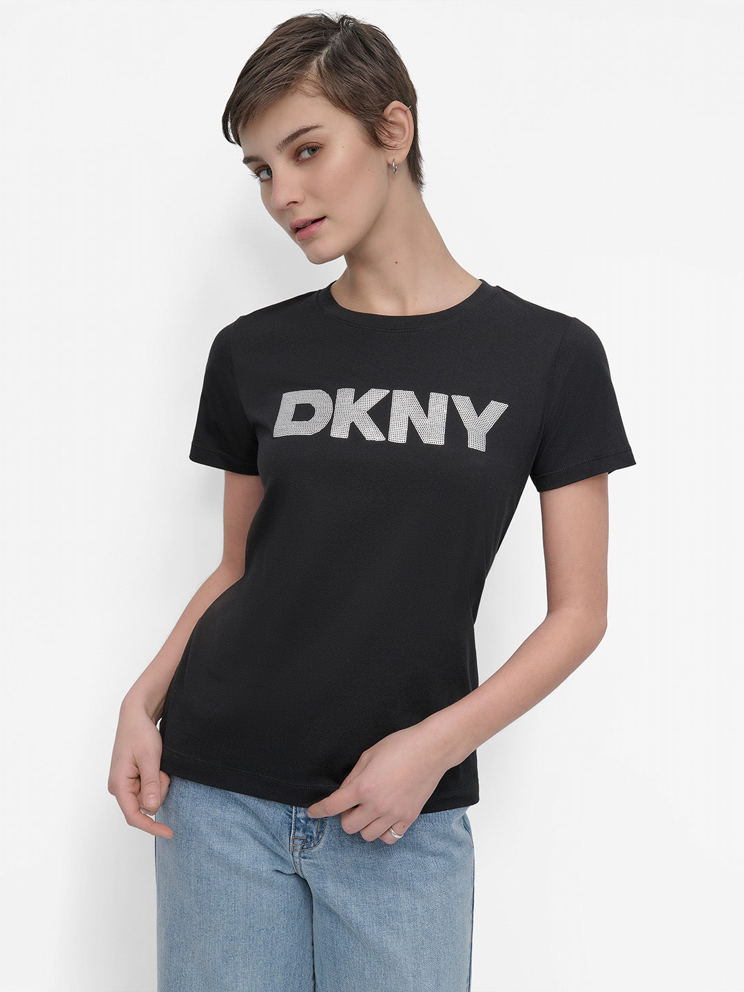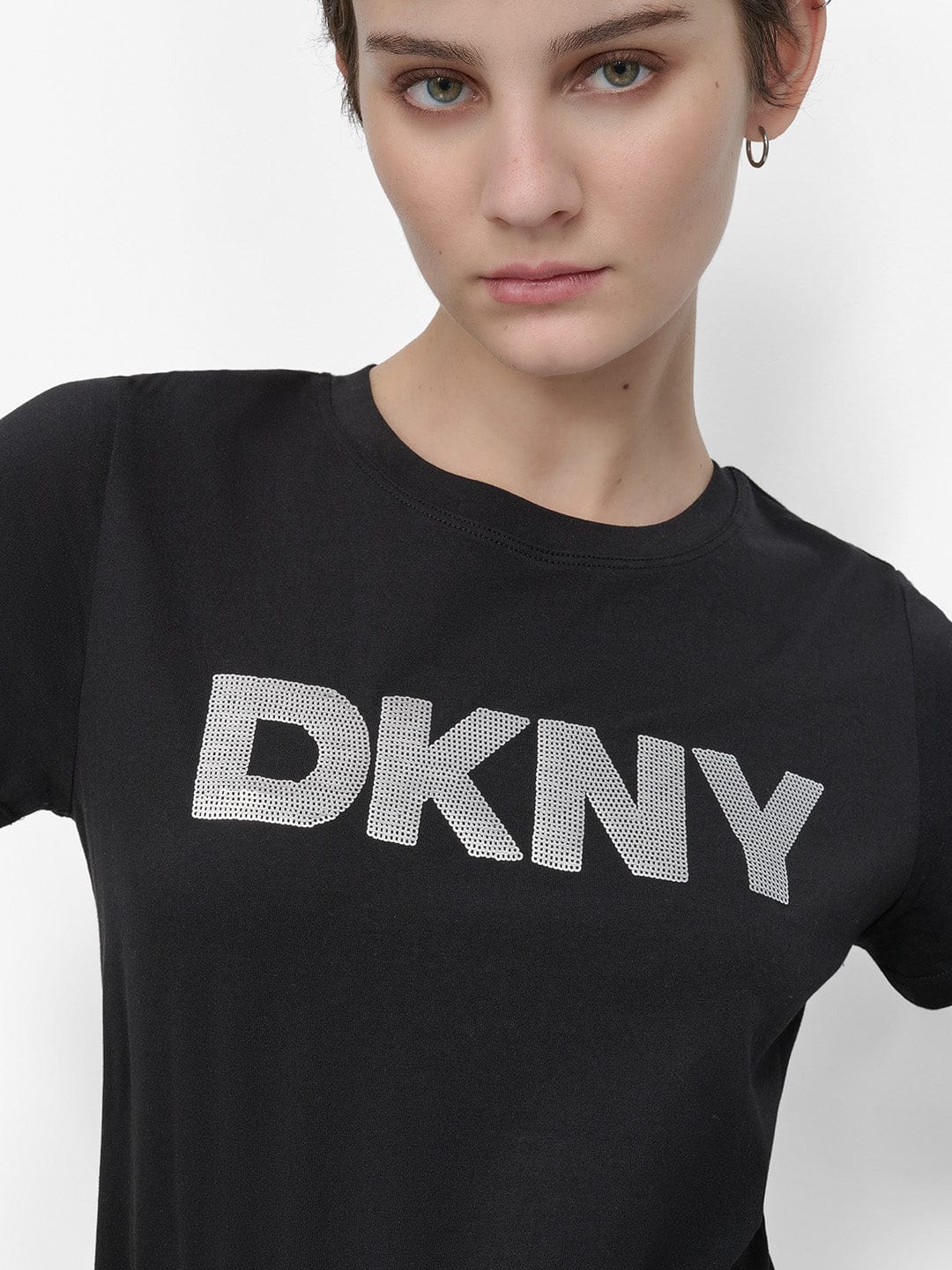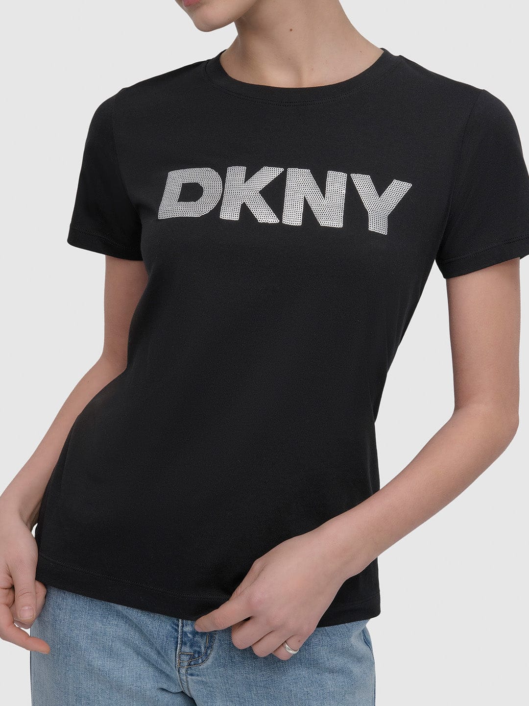 Discover the perfect blend of comfort and style with our women's black t-shirt. Crafted from a premium cotton blend fabric, this regular fit tee offers a soft touch and breathable wear. Featuring a classic round neck and short sleeves, it's designed for everyday ease with a convenient pull-on closure. The solid pattern is elevated by a chic sequin logo, adding a touch of sparkle to your look. Its stretchable material ensures a flattering fit that moves with you, making it an ideal choice for both casual outings and relaxed weekends. Embrace effortless elegance with this versatile wardrobe staple.