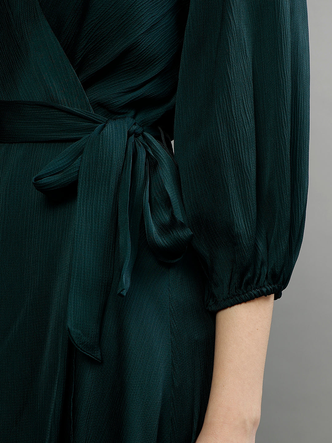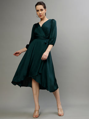 Introducing our stunning green dress with a flattering V-neckline and regular sleeves. Its flared fit accentuates your curves, while the solid color adds a touch of elegance. Perfect for any occasion, this dress is a must-have addition to your wardrobe.