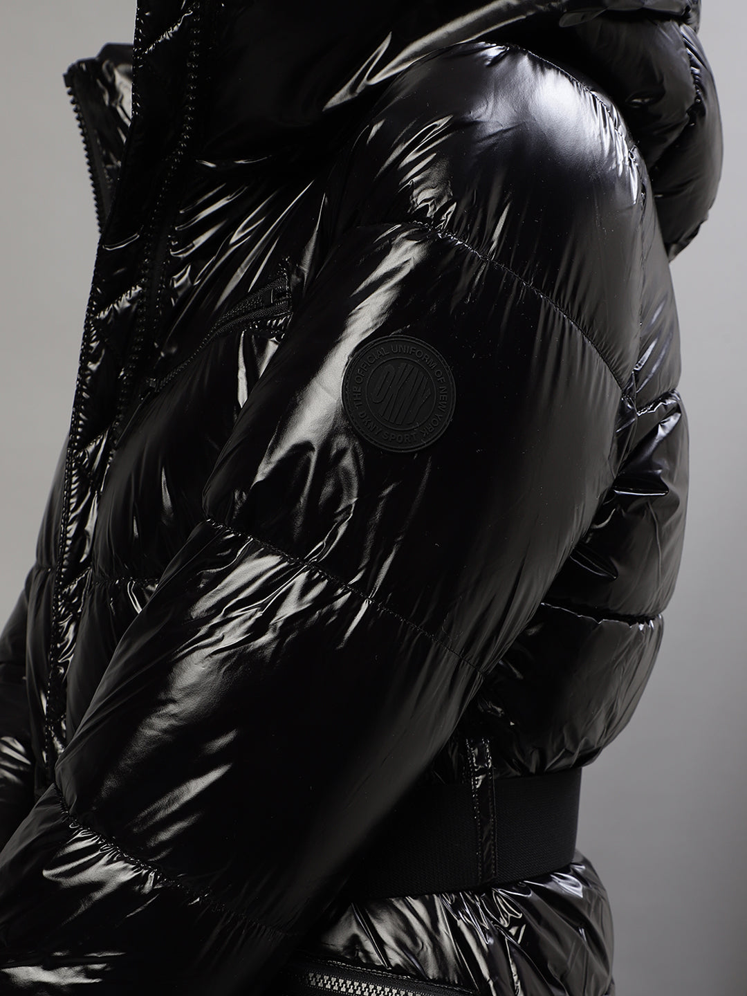 Introducing our sleek and stylish black puffer jacket, designed with a regular fit for ultimate comfort. Featuring a hooded neckline and regular sleeves, this jacket is perfect for any weather. Its solid black color adds a touch of sophistication to your outfit. Stay warm and fashionable with this must-have wardrobe essential.