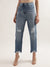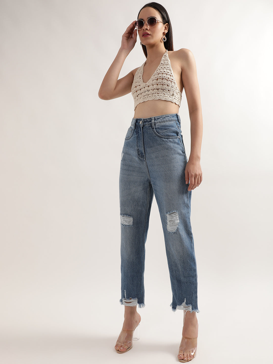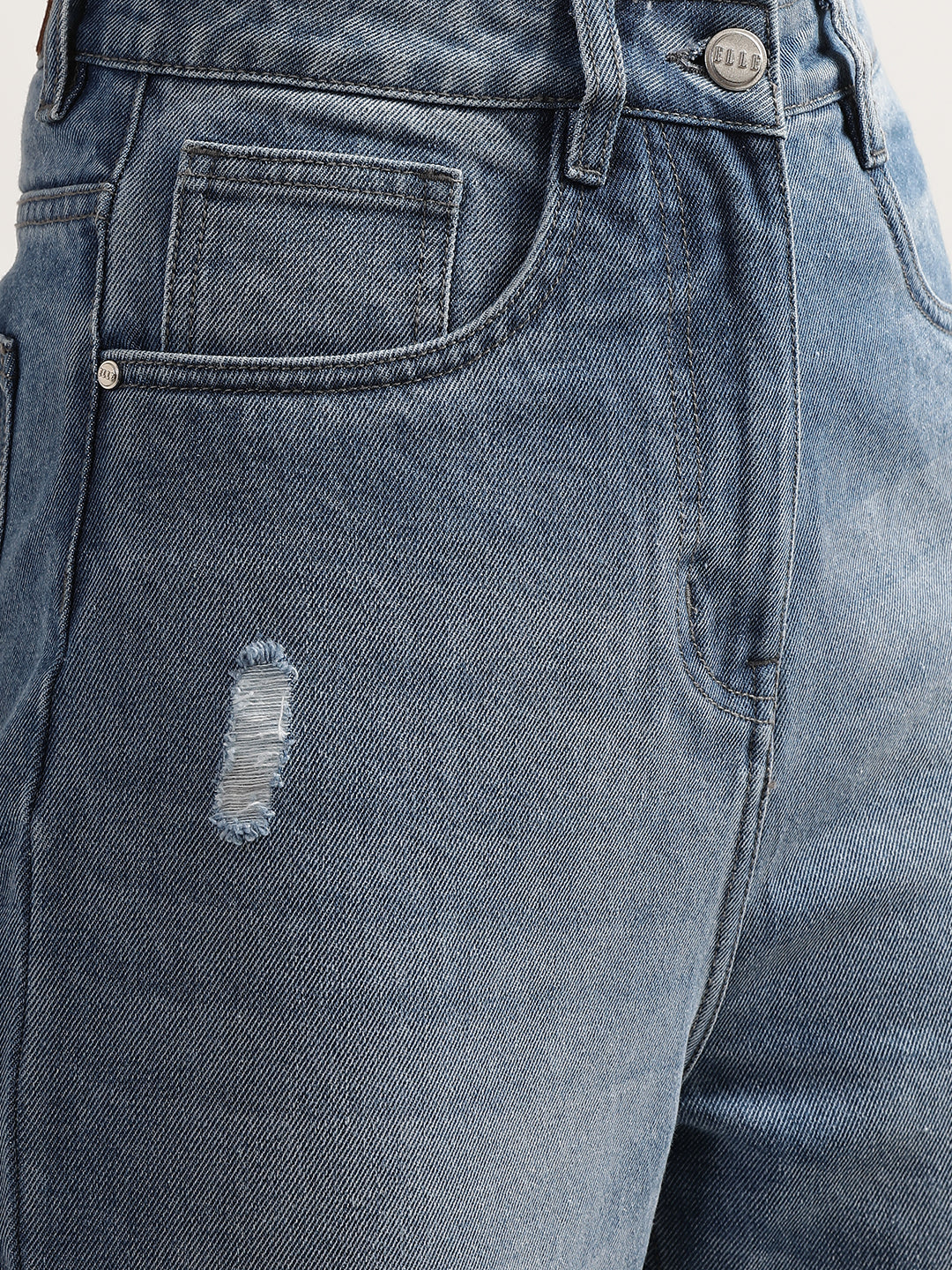 Introducing Elle Women's Mid Blue Solid Regular Fit Jeans, crafted from 100% cotton for a comfortable and iconic fit. These jeans feature a distressed detail at the hem and near the pocket, adding a stylish touch to your look. The classic button and zipper closure ensures a secure fit.
