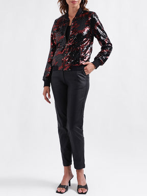 Steal the spotlight in this embellished full-sleeved collar jacket. Crafted from high-quality polyester, it offers a refined silhouette with a touch of sparkle. The timeless black shade serves as a canvas for its exquisite detailing, making it a showstopper for any occasion.