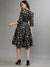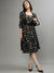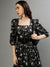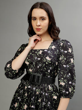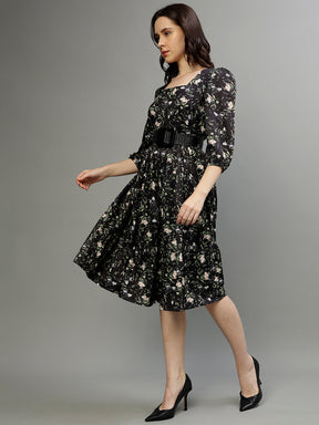 Introducing our stunning black dress with a square neckline and 3/4th sleeves. Its fit and flare design accentuates your curves, while the printed pattern adds a touch of elegance. Perfect for any occasion, this dress is a must-have addition to your wardrobe.