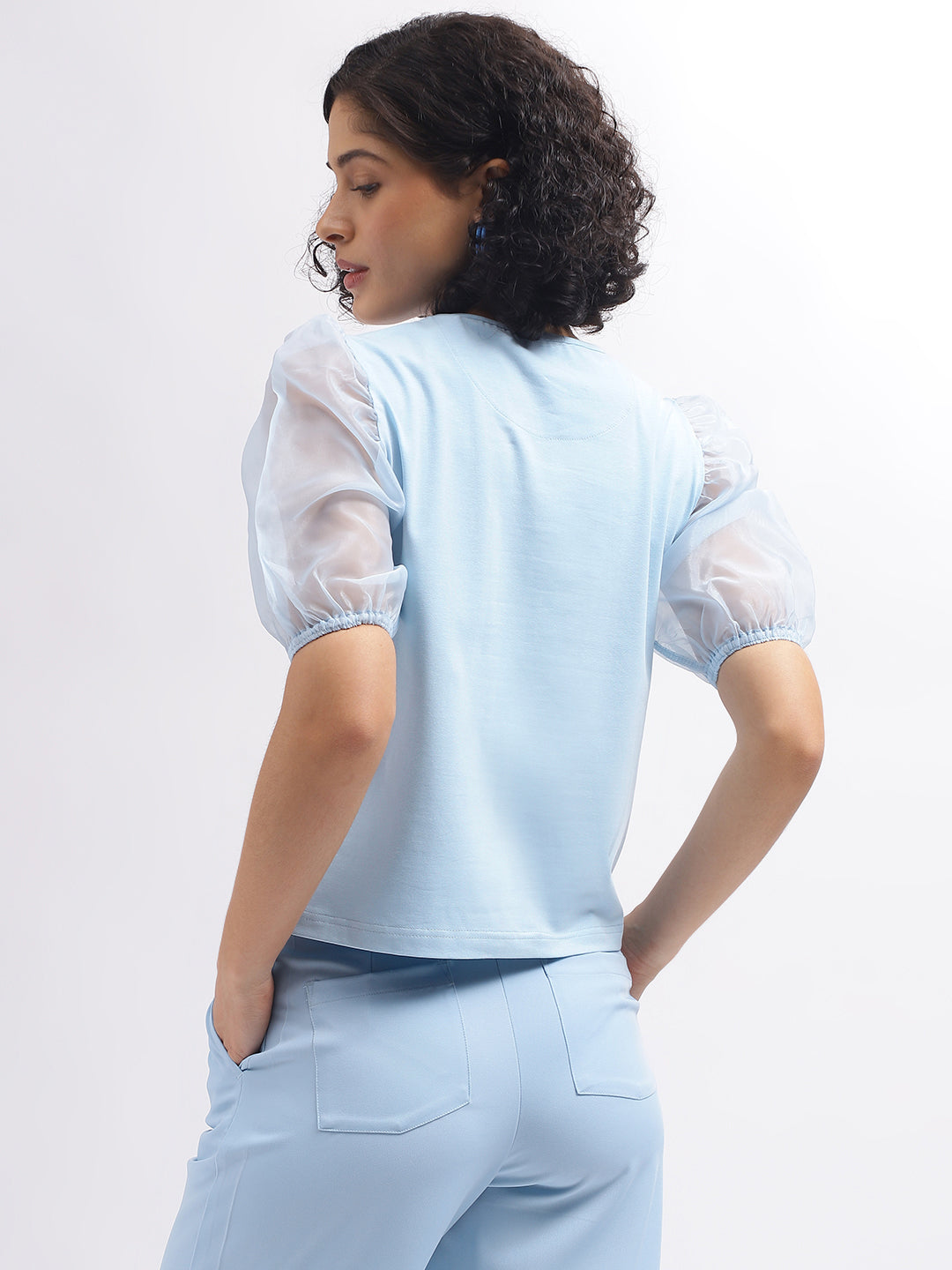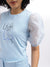 Elle Women Blue Printed Round Neck Short Sleeves Top