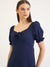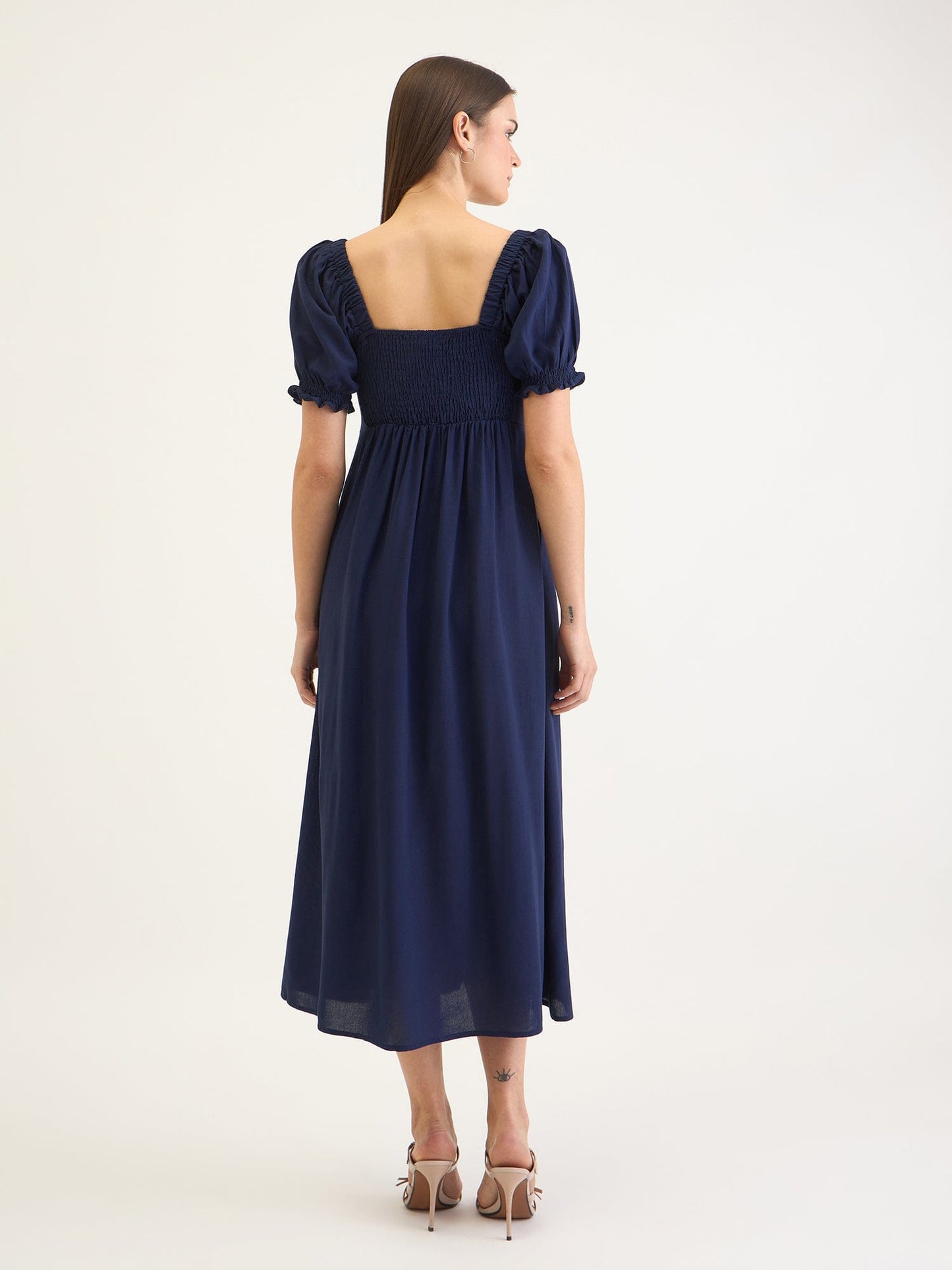 Introducing our stunning blue flared dress, designed to elevate your wardrobe with its elegant fit and flare silhouette. Crafted from soft viscose fabric, this dress features a solid pattern and a flattering sweetheart neckline that beautifully complements the short sleeves. The pull-on closure ensures ease of wear, while the ankle-length design adds a touch of sophistication. For added charm, the dress boasts puffed balloon sleeves and a playful ruffle at the hem. A tie-up detail in front completes this versatile piece, perfect for any occasion where style and comfort are key.