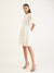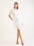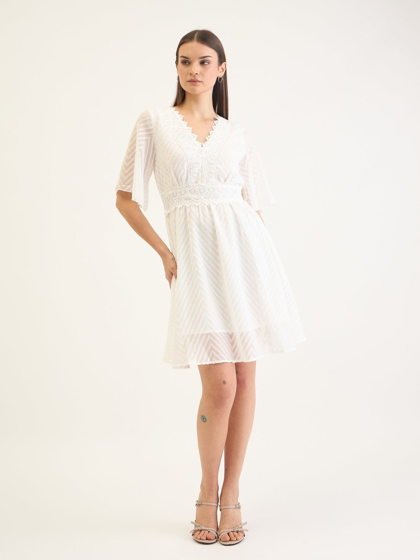Discover elegance with our stunning white cocktail dress, designed to make a statement at any event. This fit and flare dress features a textured pattern that adds depth and sophistication to your look. The short sleeves and v-neckline create a flattering silhouette, perfect for showcasing your style. Crafted from high-quality polyester fabric, it offers comfort and durability. The dress is adorned with delicate lace patches, adding a touch of femininity and charm. A discreet zipper closure ensures a seamless fit, making it easy to slip into this timeless piece. Ideal for weddings, parties, or any special occasion.