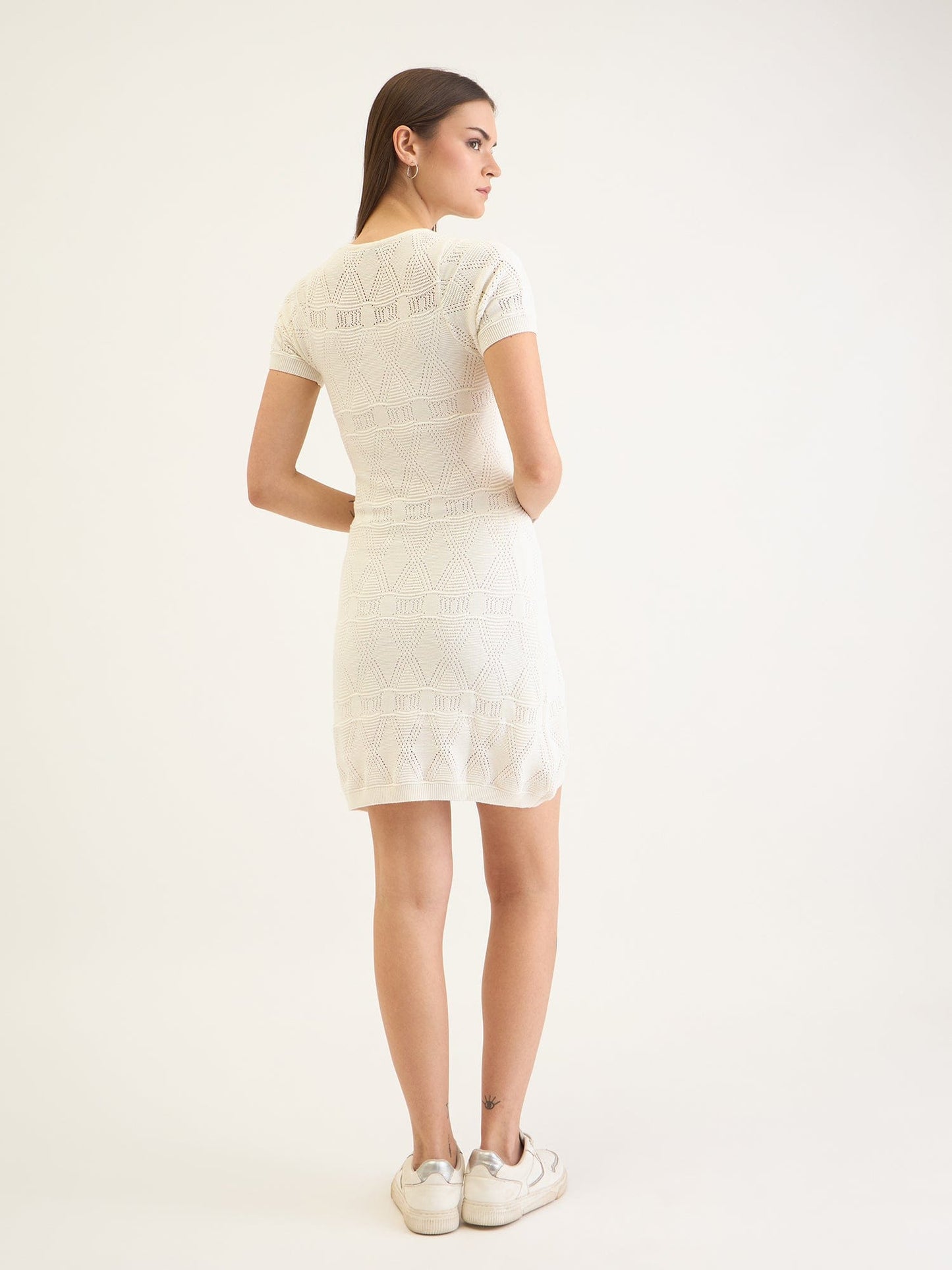 Discover effortless style with our white t-shirt dress, designed for the modern woman. Crafted from high-quality polyester fabric, this dress features a fitted silhouette with a unique stretchable textured knitting that offers both comfort and elegance. The short sleeves and round neck add a classic touch, making it perfect for any occasion. Its pull-on closure ensures easy wearability, while the breathable material keeps you cool throughout the day. Whether you're heading to brunch or a casual outing, this versatile dress is your go-to choice for chic simplicity and timeless appeal.