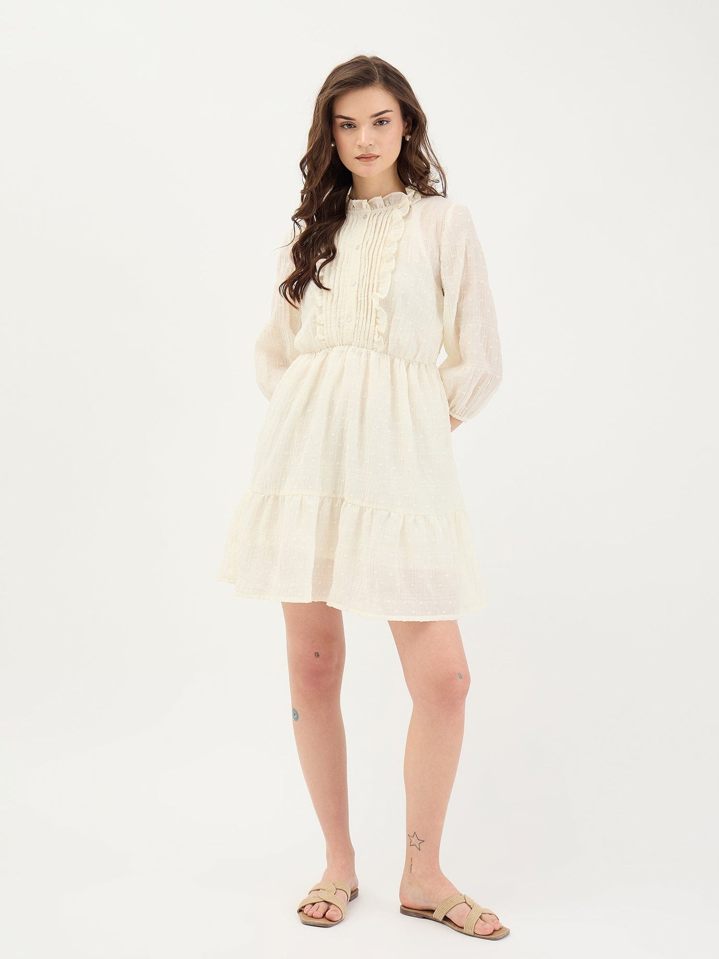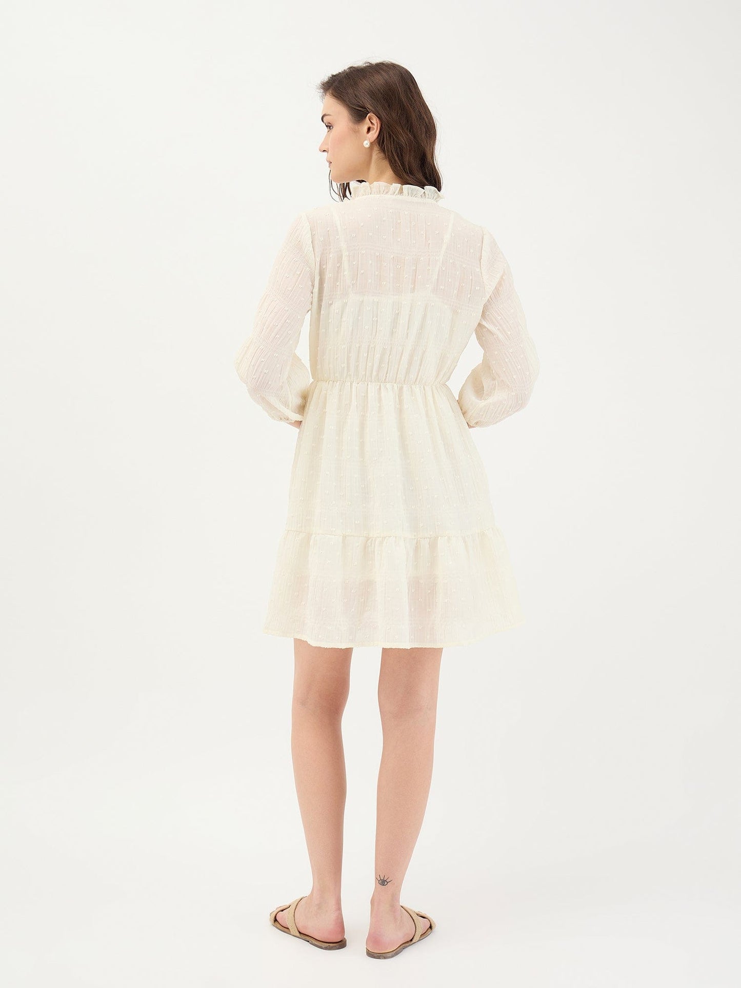 Discover effortless elegance with our tiered dress in a classic white hue. Crafted from soft polyester fabric, this dress features a relaxed fit with a textured pattern that adds depth and charm. The 3/4th sleeves and round neck offer a timeless silhouette, while the button closure ensures ease of wear. Delicate ruffles and pleats cascade down the tiers, creating a graceful flow with every step. Perfect for any occasion, this dress combines comfort and style, making it a versatile addition to your wardrobe.