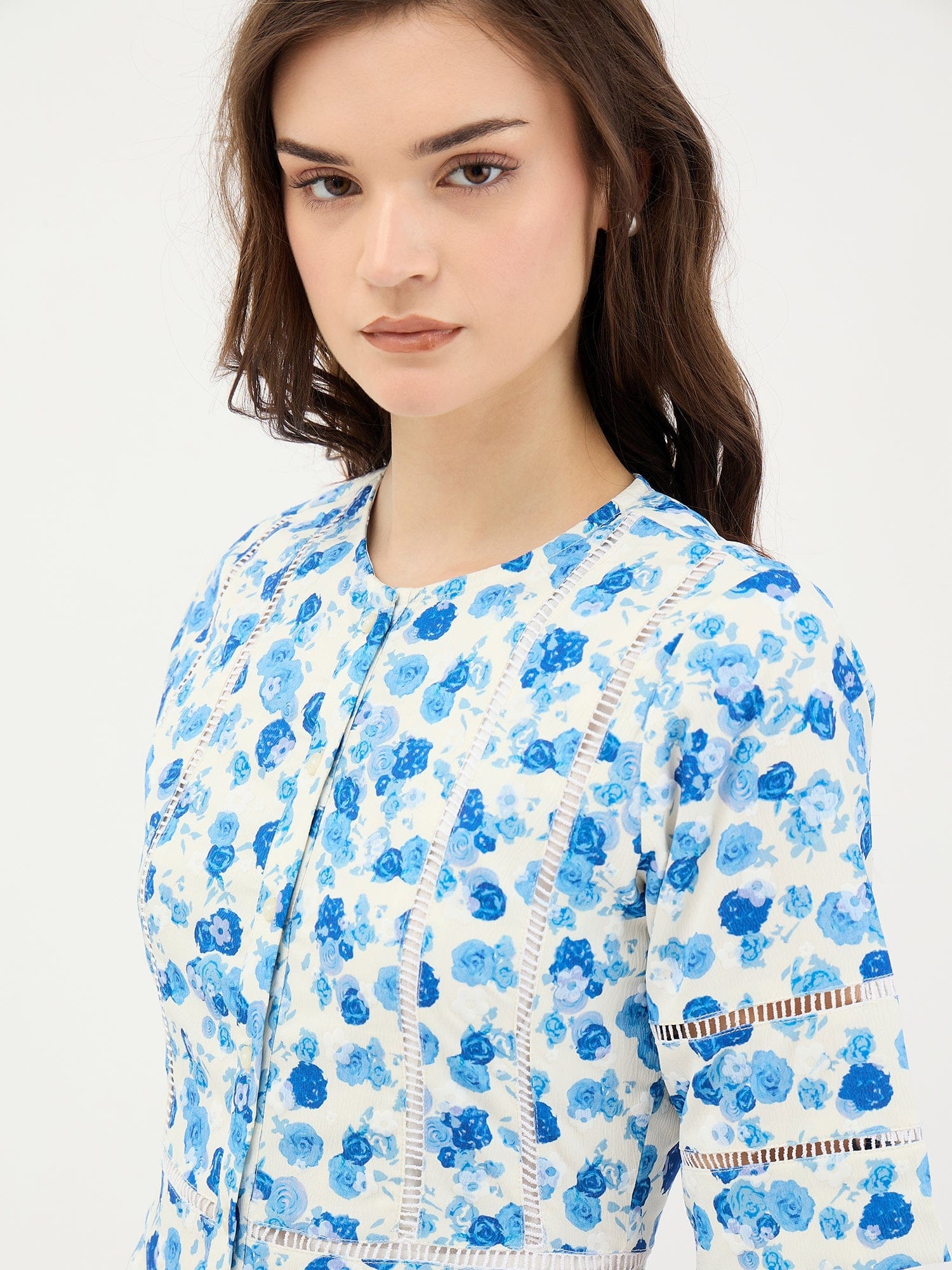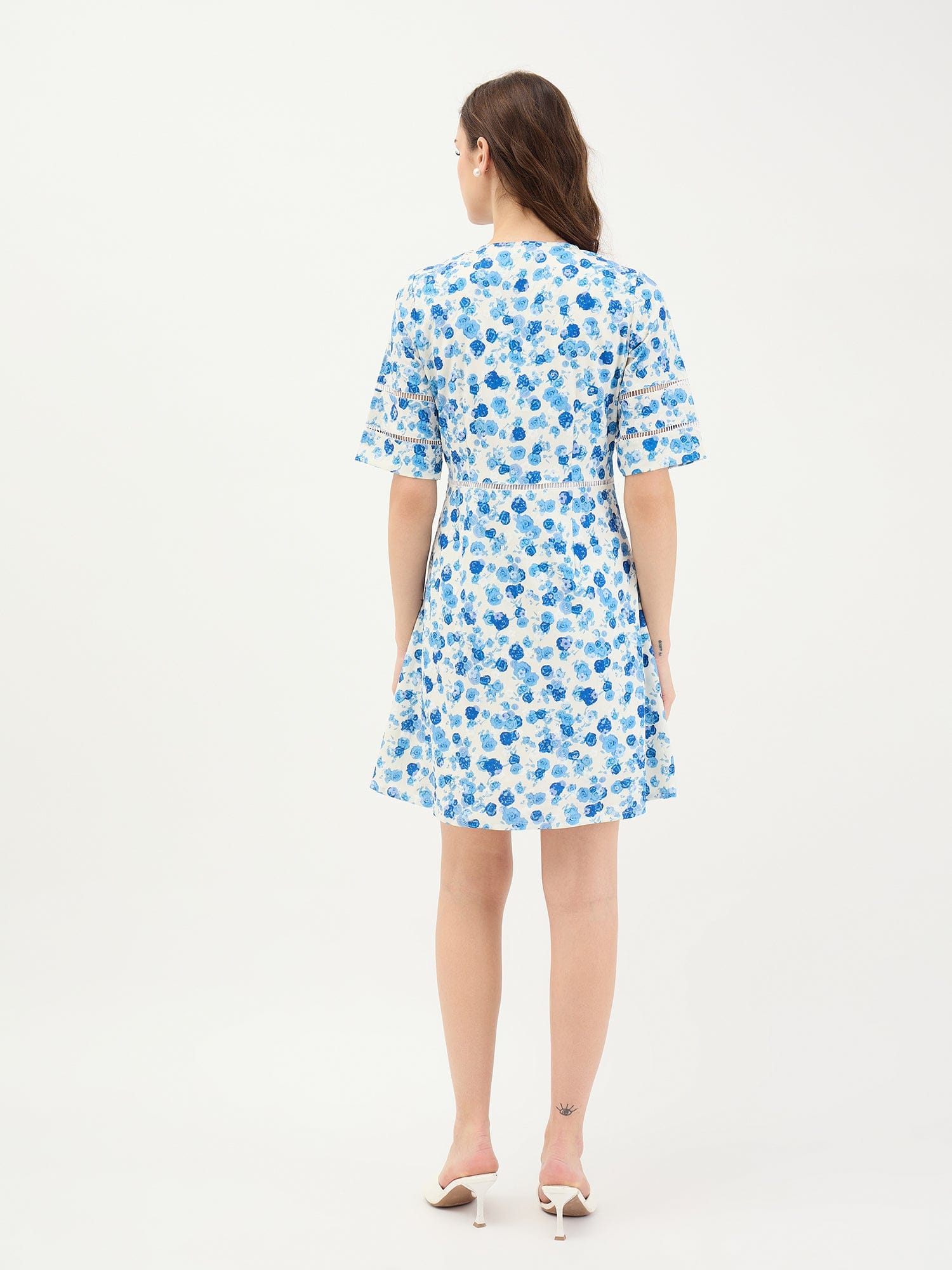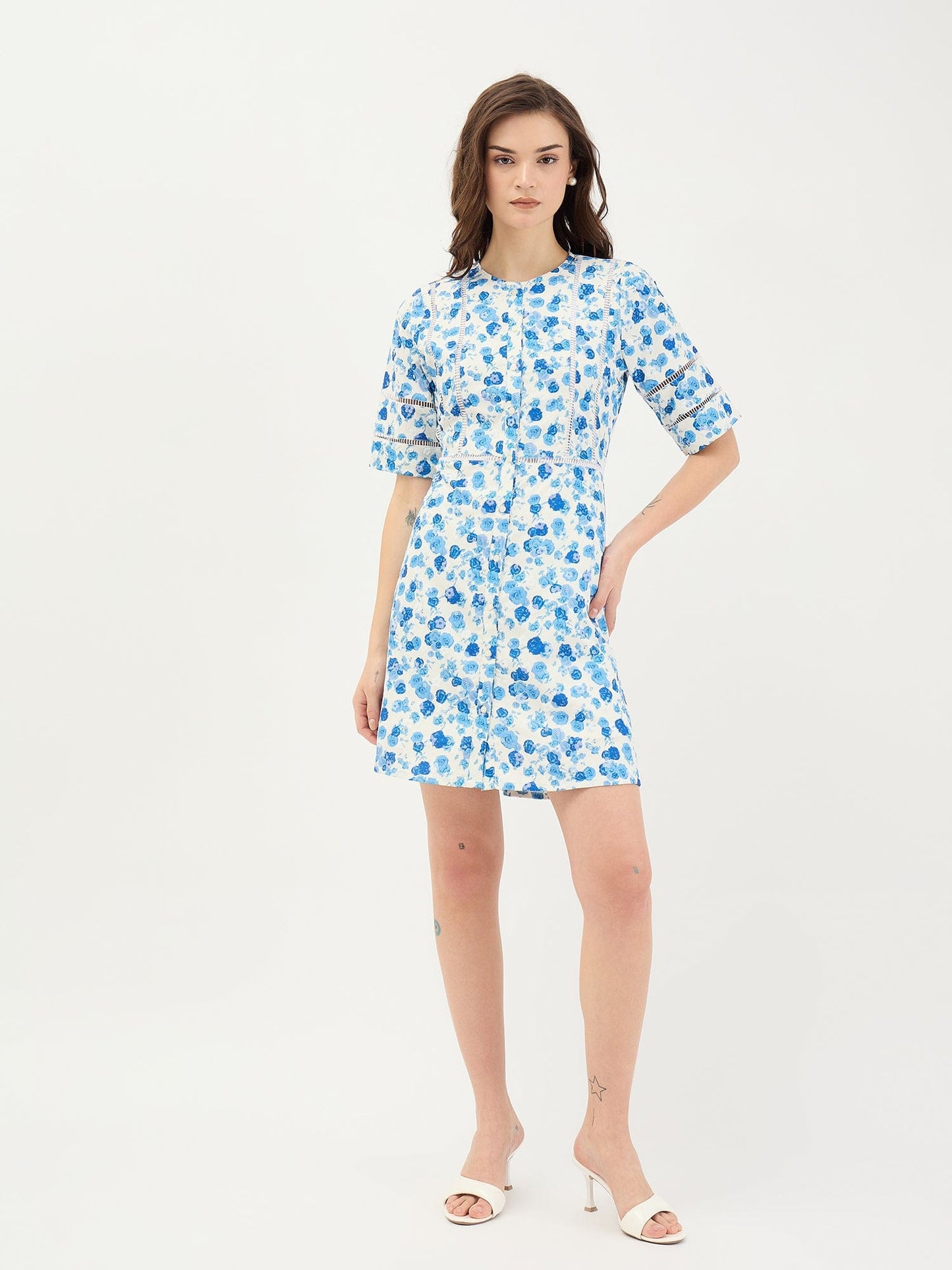 Discover effortless elegance with our A-line dress in a serene blue hue, adorned with a charming floral pattern. Crafted from high-quality polyester, this dress offers a relaxed fit that drapes beautifully. The half sleeves and round neck provide a classic touch, while the button closure ensures ease of wear. Delicate lace inserts add a hint of sophistication, making it perfect for any occasion. Whether you're attending a garden party or a casual outing, this dress promises comfort and style in every step.