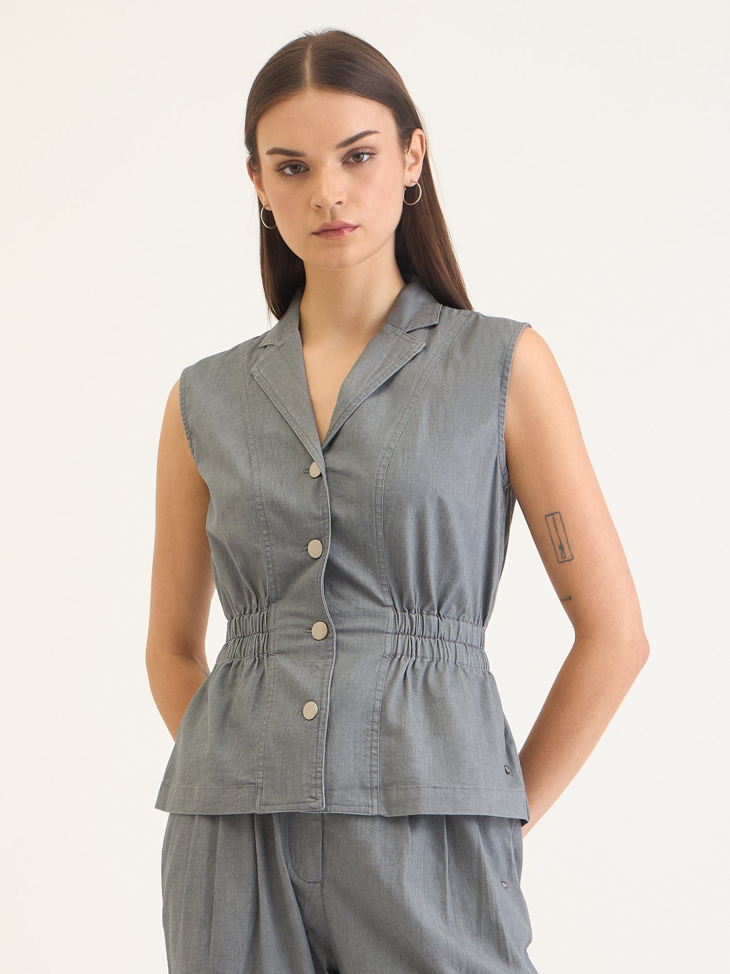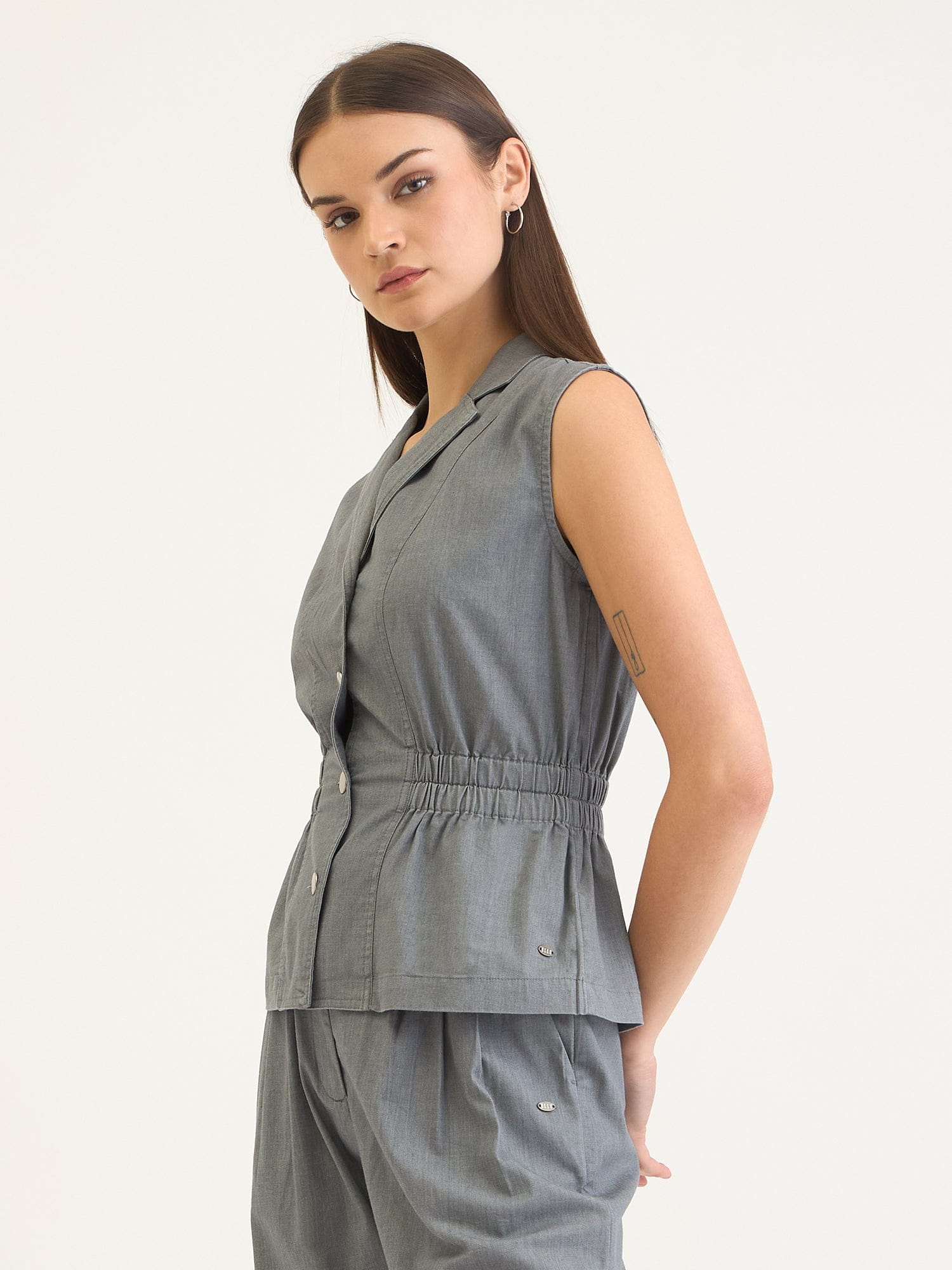 Elevate your wardrobe with this chic grey top, designed for the modern woman who values both style and comfort. Crafted from high-quality cotton fabric, this sleeveless top offers a relaxed fit that drapes beautifully over any silhouette. The sophisticated lapel collar adds a touch of elegance, making it perfect for both casual outings and more formal occasions. Featuring a solid pattern, this versatile piece is adorned with striking silver buttons that provide a subtle yet eye-catching detail. The button closure ensures ease of wear while maintaining a polished look. Ideal for pairing with your favorite jeans or skirts, this top is a must-have addition to your collection.