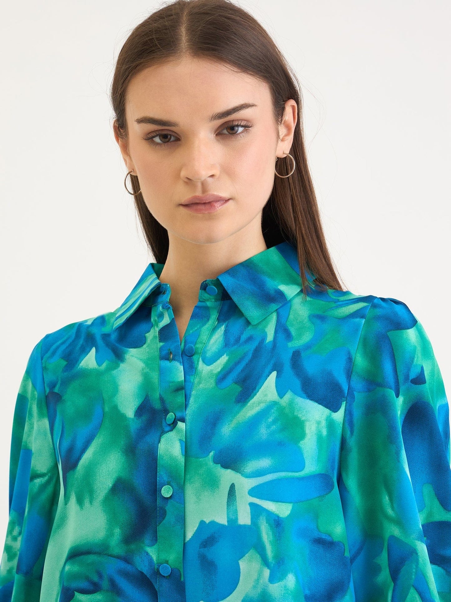 Discover effortless elegance with our blue floral patterned shirt, designed for the modern woman who values both style and comfort. This relaxed fit shirt features a classic shirt collar and full-length balloon sleeves with elongated cuffs, adding a touch of sophistication to your wardrobe. Crafted from high-quality polyester fabric, it ensures durability and a soft feel against the skin. The all-over print (AOP) design enhances its visual appeal, while the button opening in front offers easy wearability. Perfect for any occasion, this versatile piece pairs beautifully with jeans or skirts for a chic look.