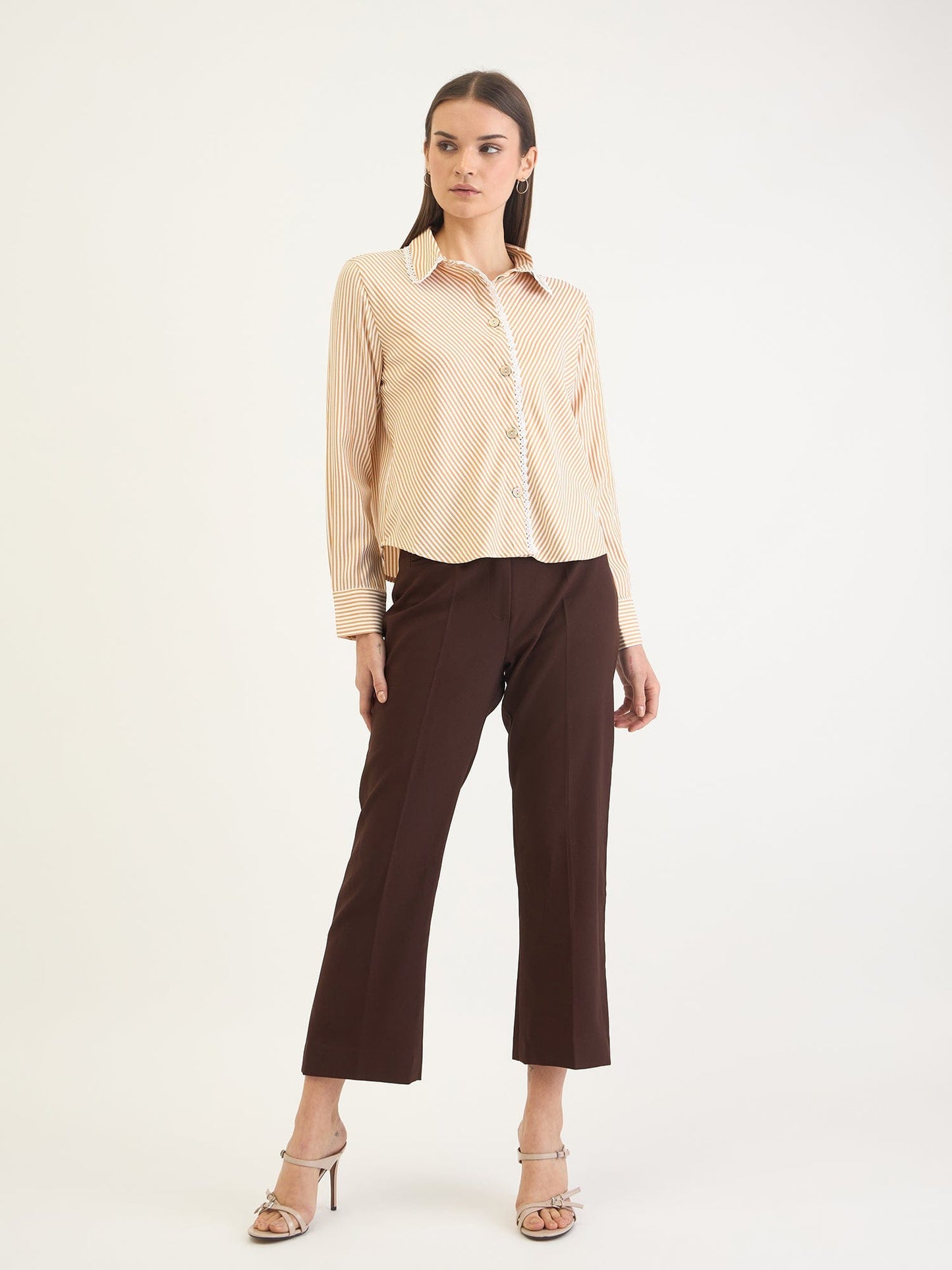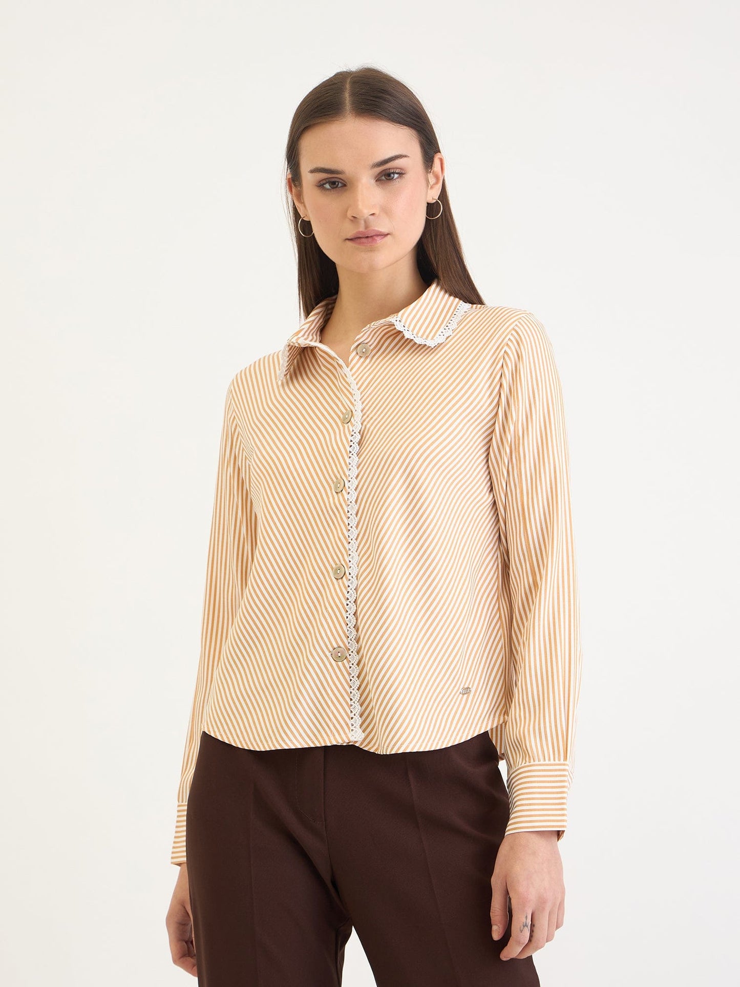 Elevate your wardrobe with our stylish yellow striped shirt, designed for women who appreciate both comfort and elegance. This relaxed-fit shirt features a classic full sleeve design and a timeless shirt collar adorned with delicate lace, adding a touch of femininity to your ensemble. Crafted from high-quality cotton fabric, it ensures breathability and softness for all-day wear. The button closure provides ease of use while maintaining a polished look. Perfect for both casual outings and more formal occasions, this versatile piece effortlessly combines style and practicality. Embrace the charm of stripes with this must-have addition to your collection.