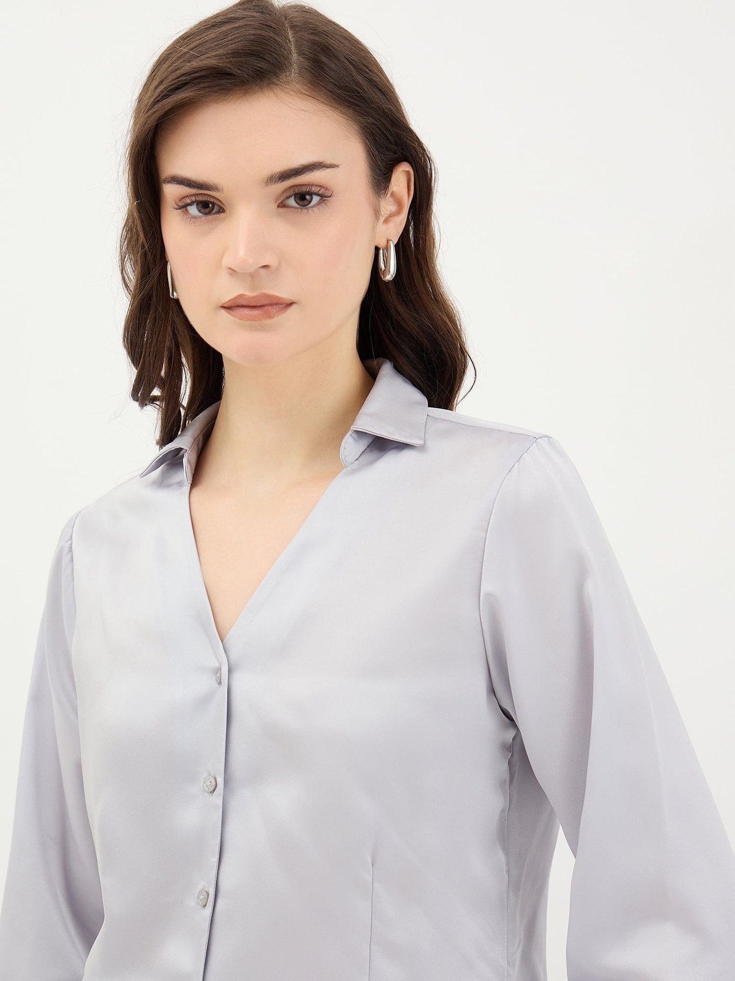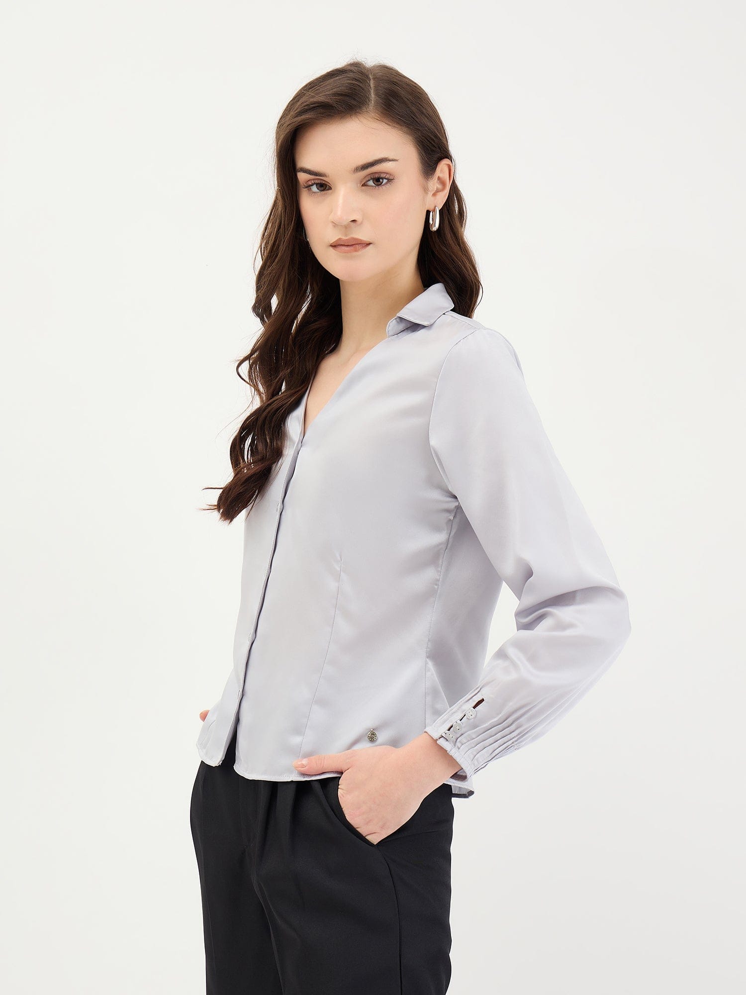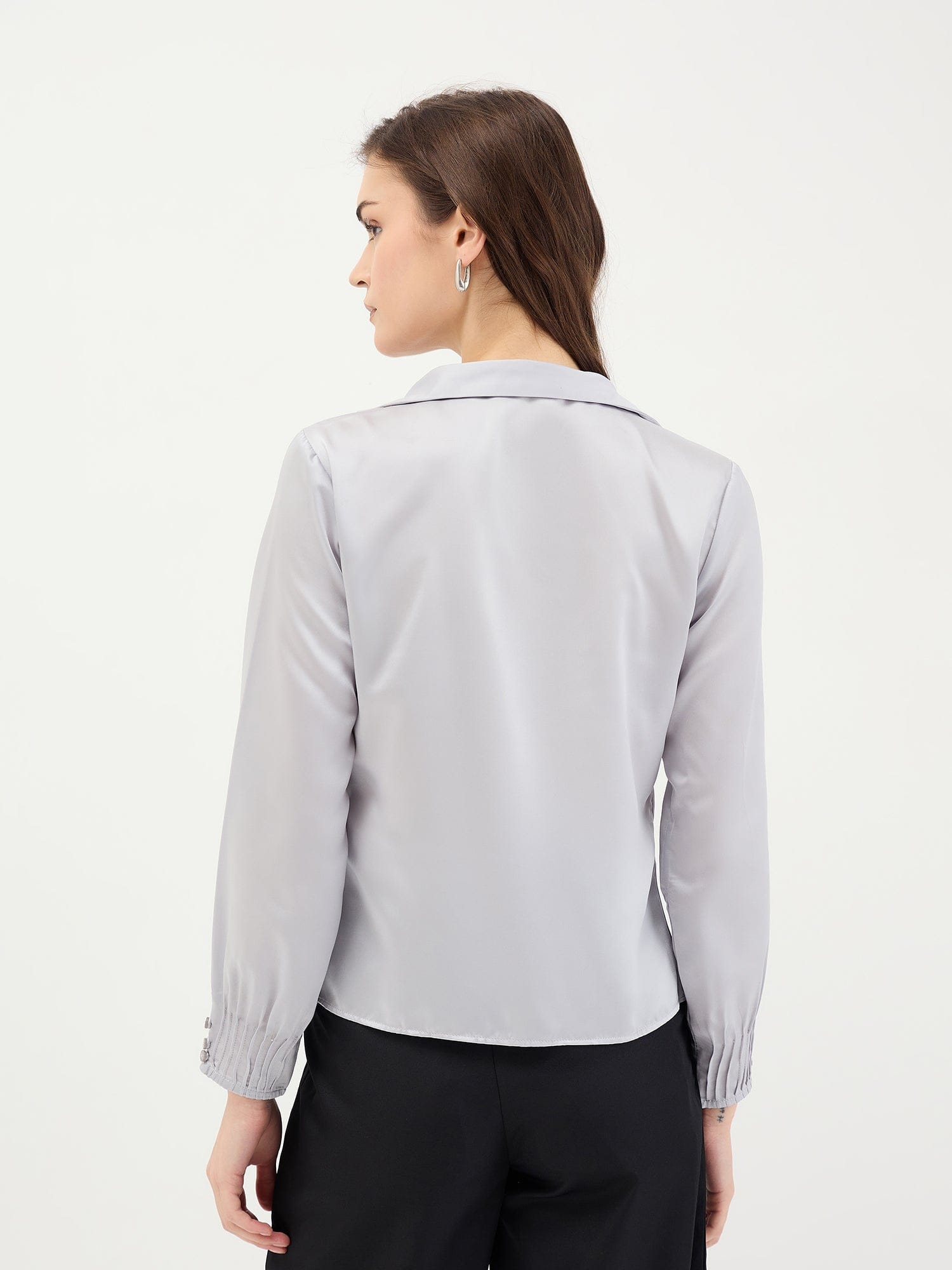 Discover the perfect blend of comfort and style with our grey full-sleeve shirt for women. Crafted from pure cotton, this shirt offers a relaxed fit that drapes beautifully, ensuring all-day comfort. The solid pattern provides a versatile look, while the spread collar adds a touch of sophistication. Featuring elegant satin pintuck detailing, this shirt elevates your everyday wardrobe. The button closure ensures a secure fit, making it an ideal choice for both casual outings and professional settings.