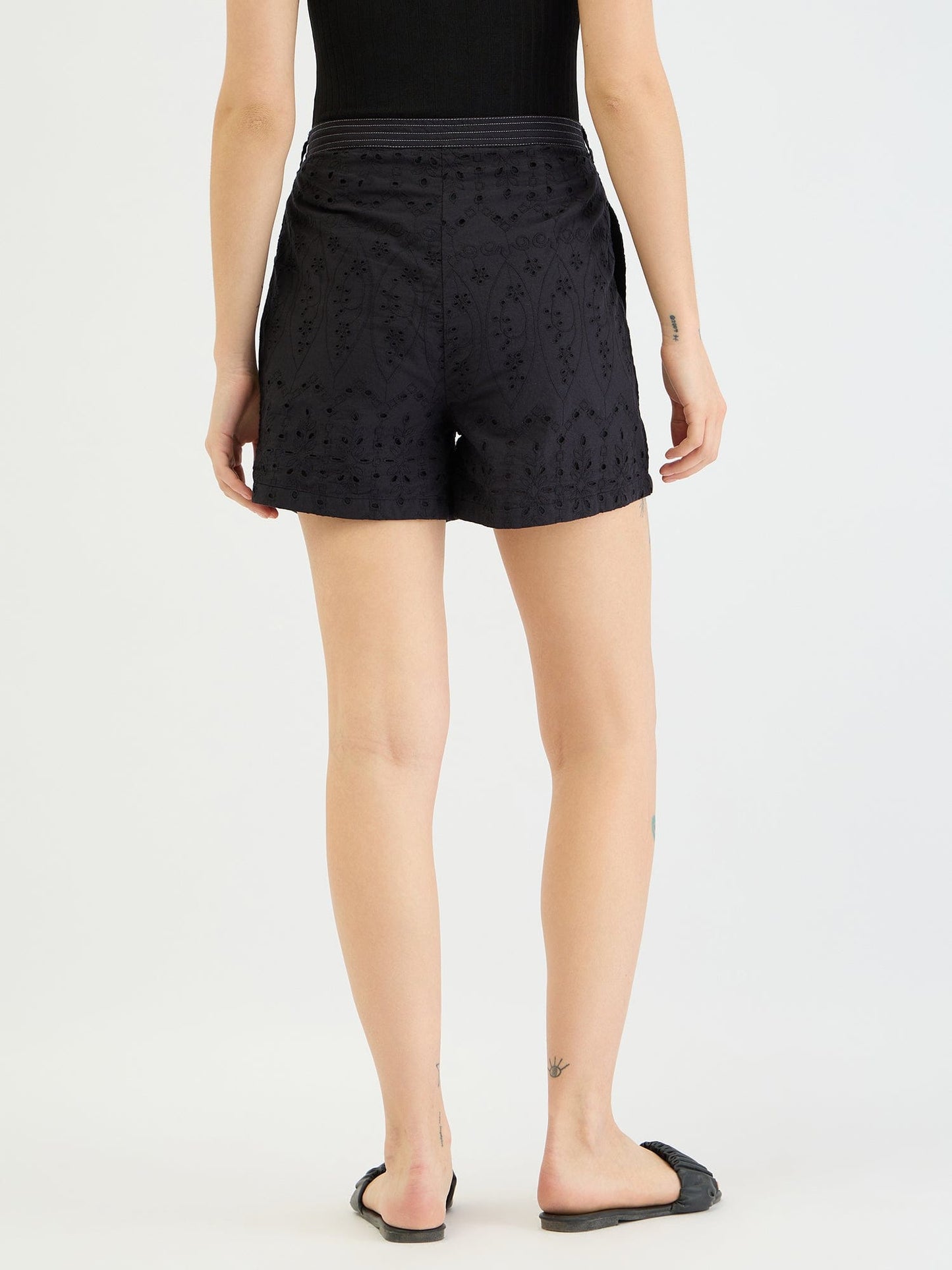 Embrace effortless style with these black structured shorts. Crafted from soft cotton, they feature a relaxed fit for ultimate comfort. The intricate Schiffli embroidery adds a touch of elegance, while the mid-rise waist and hook & eye closure ensure a flattering and secure fit. Perfect for casual outings or a chic evening look.