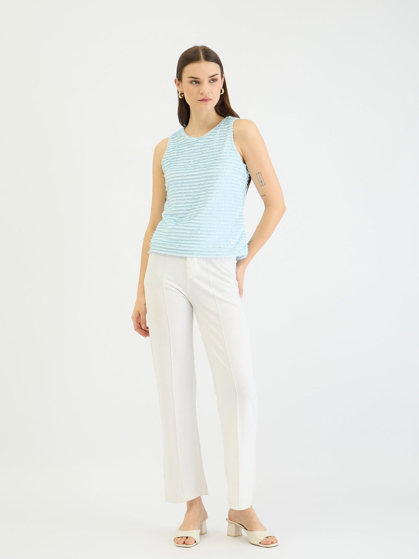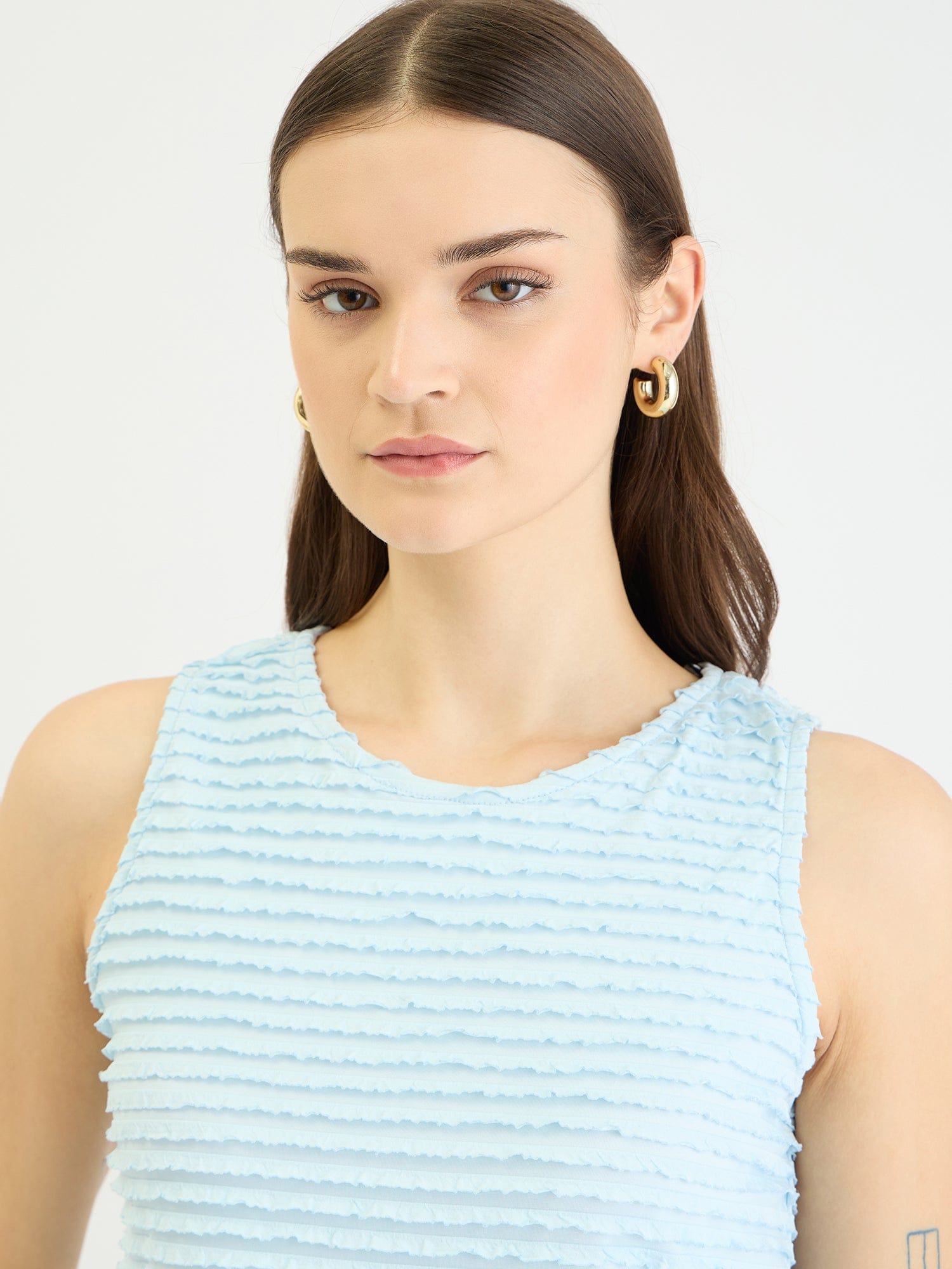 This sleeveless tank top is a must-have for your summer wardrobe. Made from soft and breathable polyester, it features a fitted silhouette with a textured pattern that adds a touch of style. The round neckline and slip-on closure make it easy to wear, while the blue color is both versatile and flattering. Perfect for casual outings, errands, or lounging around the house, this tank top is sure to become a favorite.