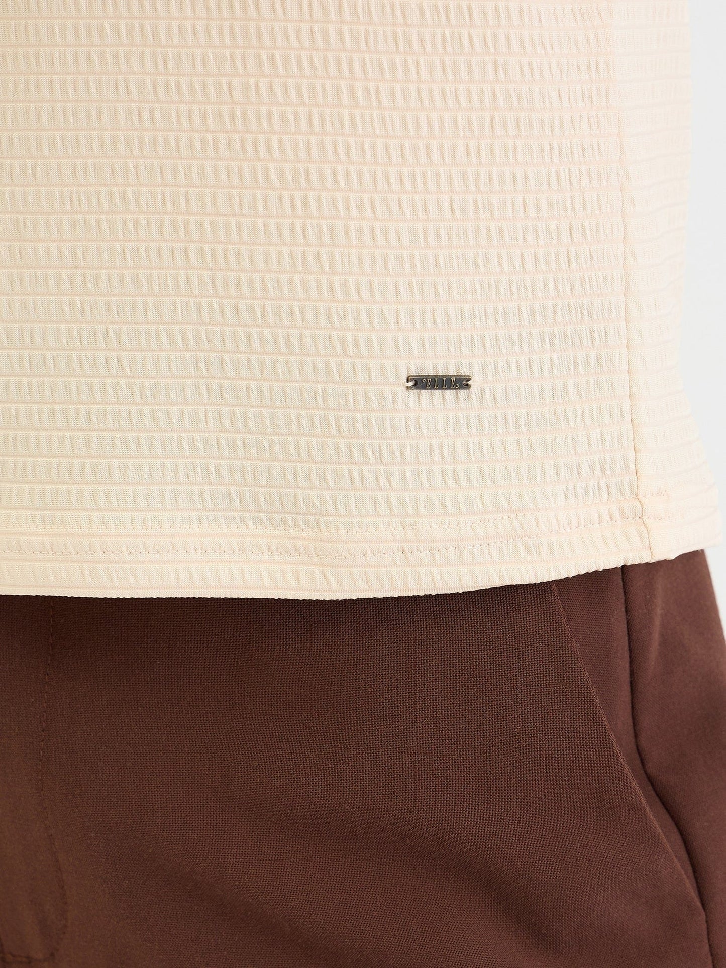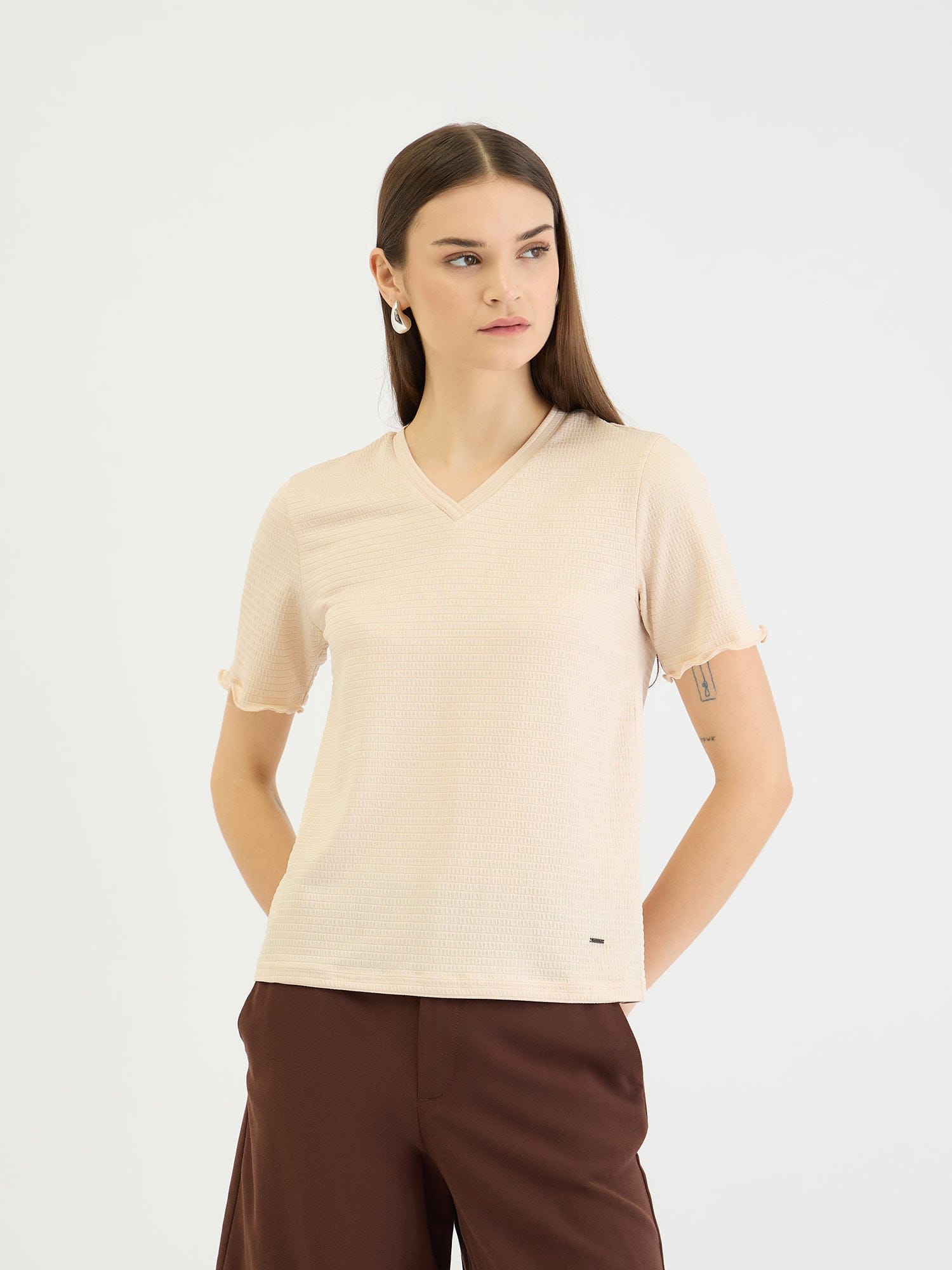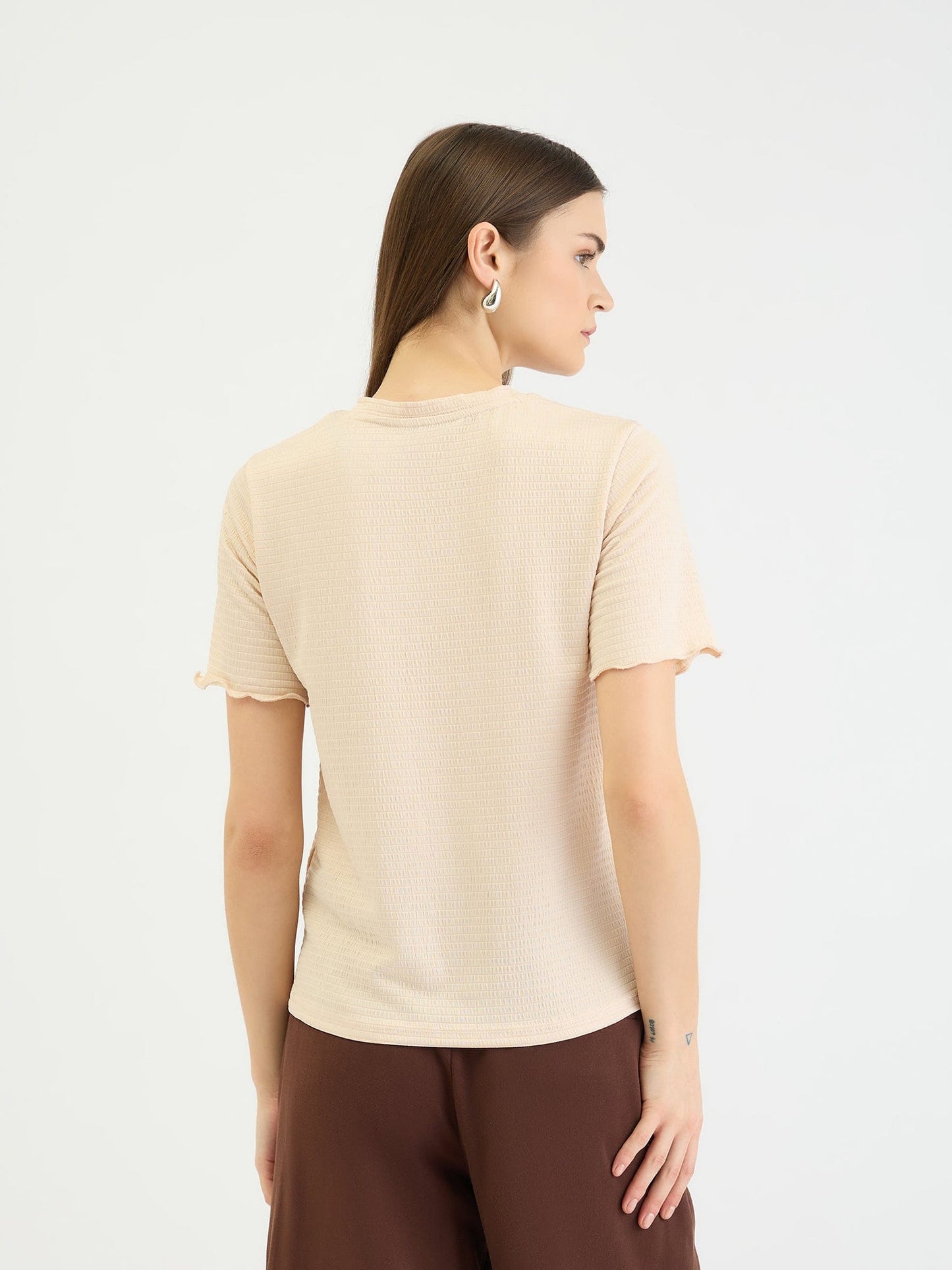 Embrace effortless style with this beige textured t-shirt. Crafted from a soft polyester blend, this fitted tee features a comfortable crew neck and short sleeves for a flattering and versatile look. The textured pattern adds a touch of dimension, while the slip-on closure ensures easy wear. Perfect for casual outings, weekend adventures, or layering under jackets and cardigans.