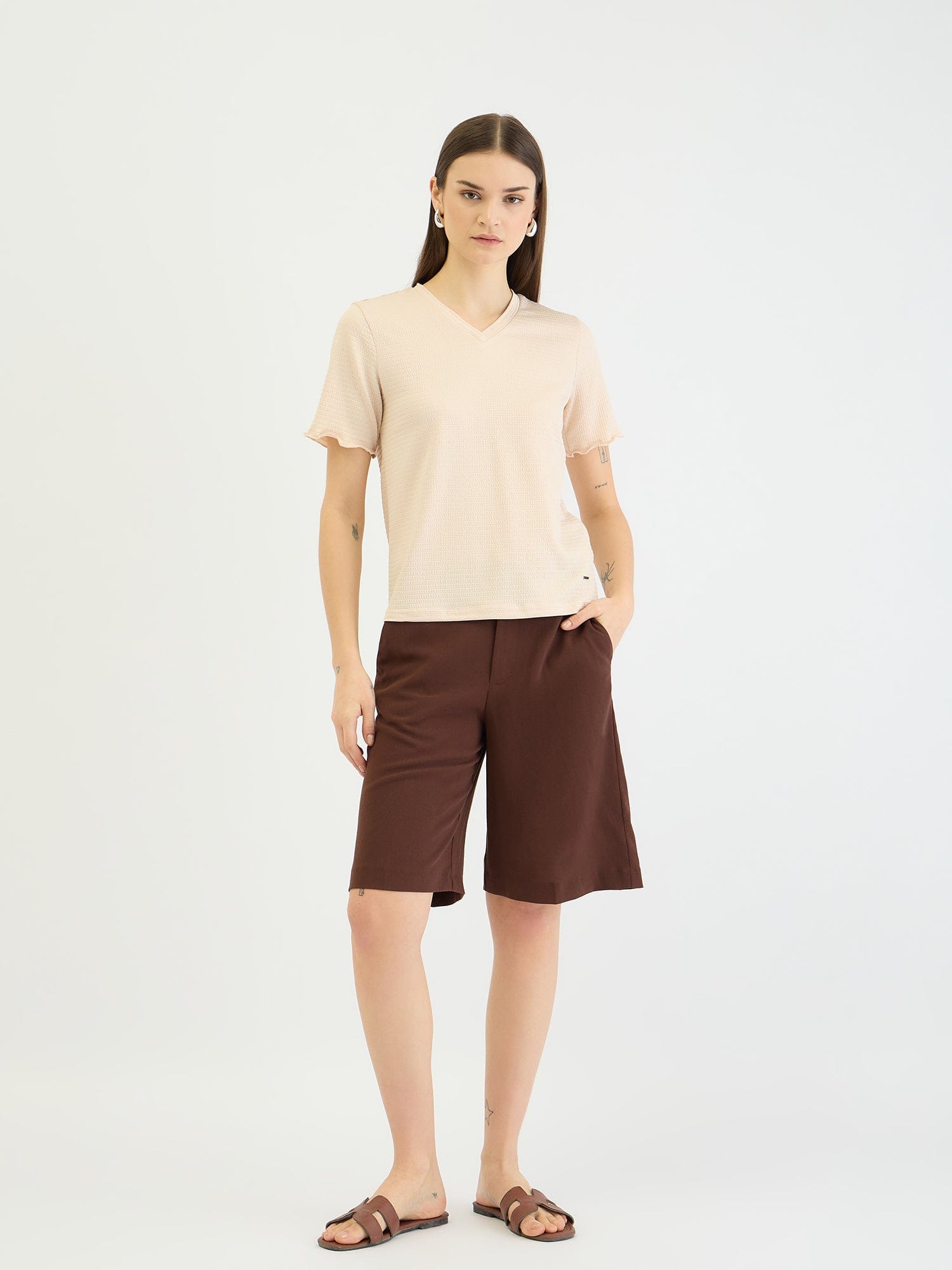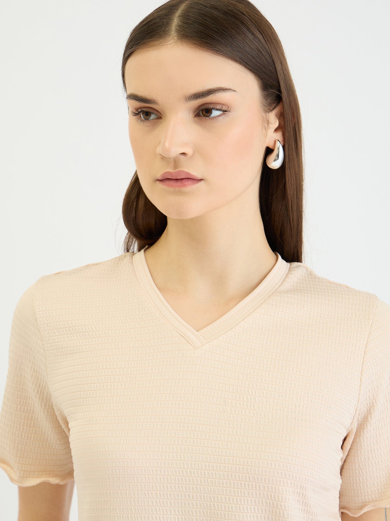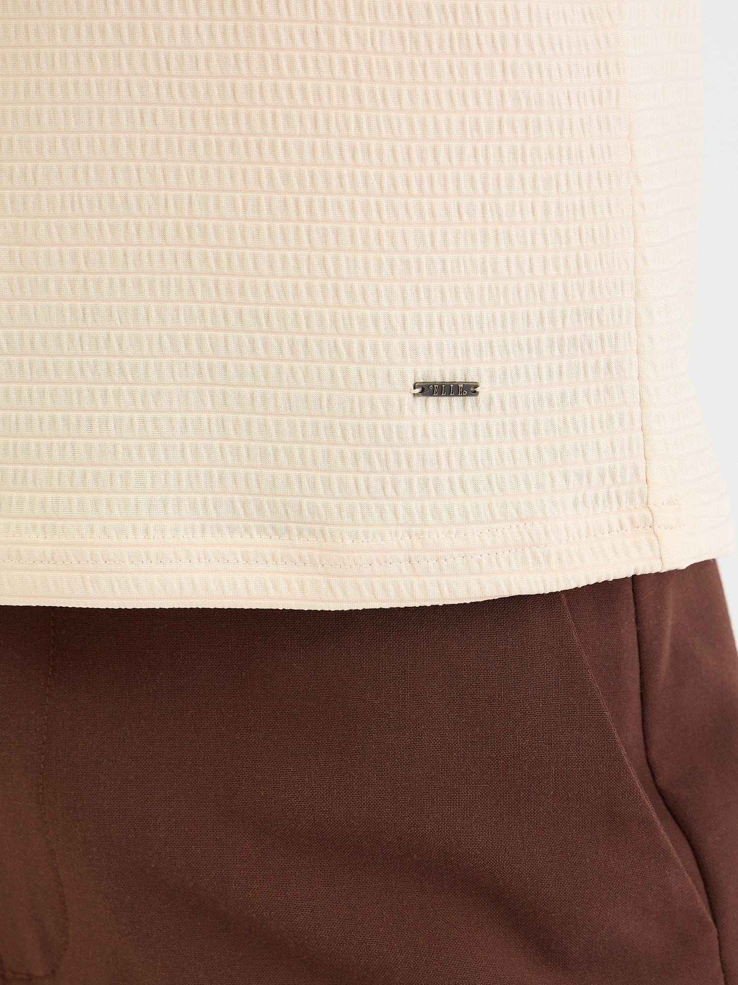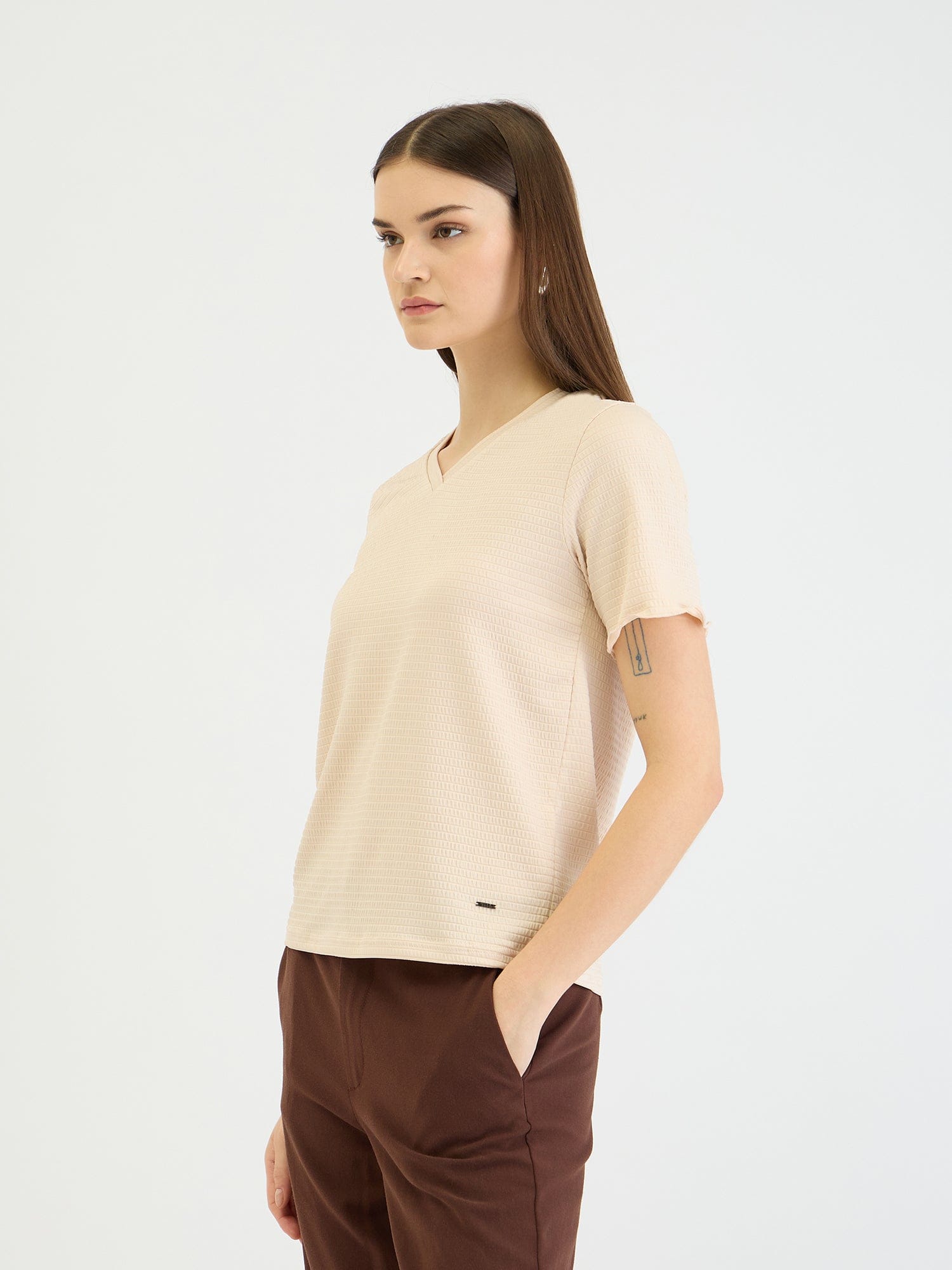 Embrace effortless style with this beige textured t-shirt. Crafted from a soft polyester blend, this fitted tee features a comfortable crew neck and short sleeves for a flattering and versatile look. The textured pattern adds a touch of dimension, while the slip-on closure ensures easy wear. Perfect for casual outings, weekend adventures, or layering under jackets and cardigans.