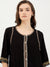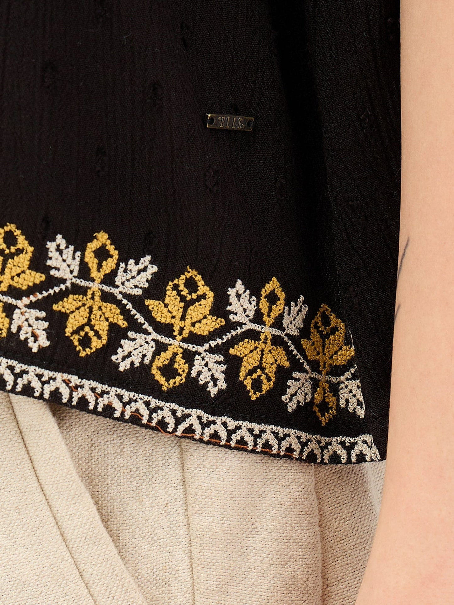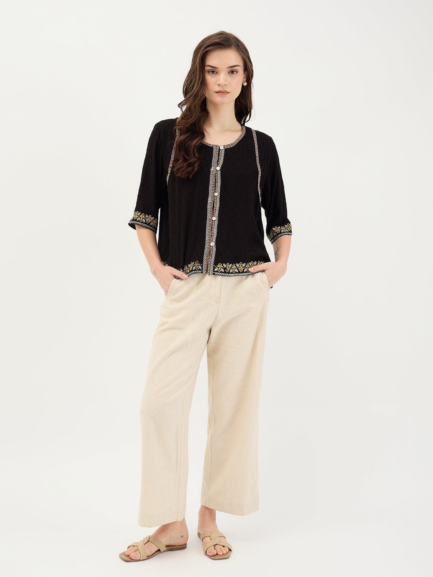Discover effortless style with our black regular top, designed for the modern woman. This chic piece features a relaxed embroidered pattern that adds a touch of elegance to your wardrobe. Crafted from high-quality polyester fabric, it ensures comfort and durability. The half sleeves and round neck offer a classic silhouette, while the button closure provides a secure fit. Made with dobby fabric, this top boasts a subtle texture that enhances its sophisticated appeal. Perfect for any occasion, pair it with your favorite jeans or skirt for a polished look.