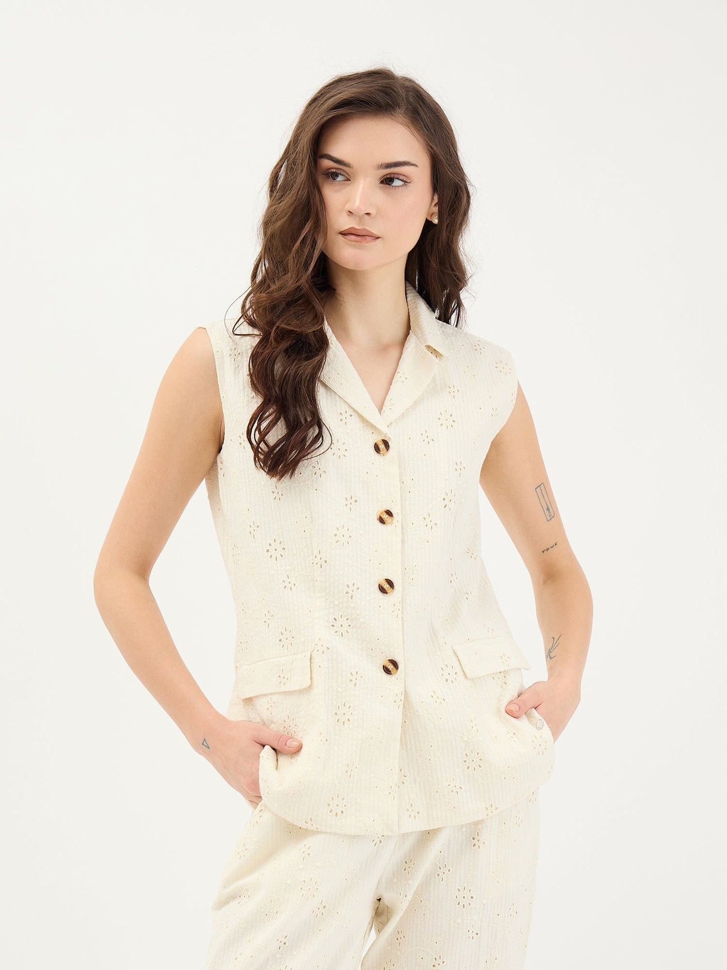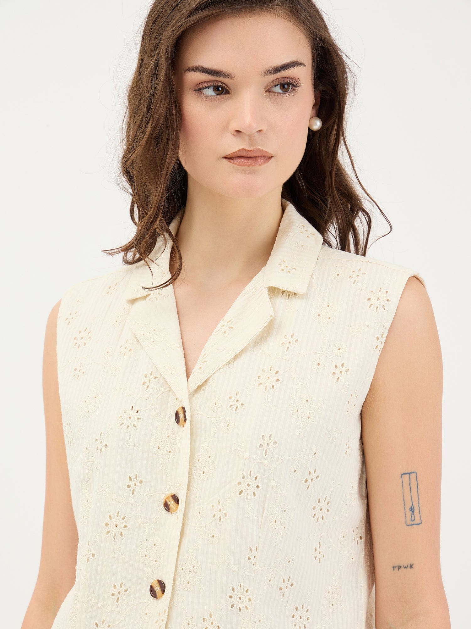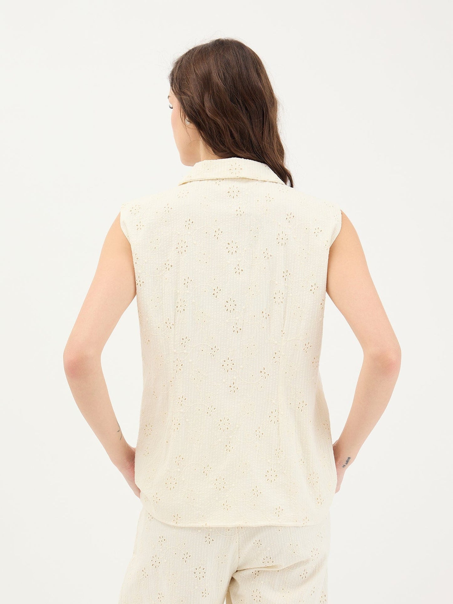 Discover effortless style with our white sleeveless top, crafted from pure cotton for ultimate comfort. This relaxed-fit piece features an elegant embroidered pattern, adding a touch of sophistication to your wardrobe. The notch collar design offers a modern twist, while the button closure ensures ease of wear. Perfect for warm days or layering under a jacket, this versatile top is a must-have for any fashion-forward woman. Pair it with your favorite jeans or a skirt for a chic, polished look.