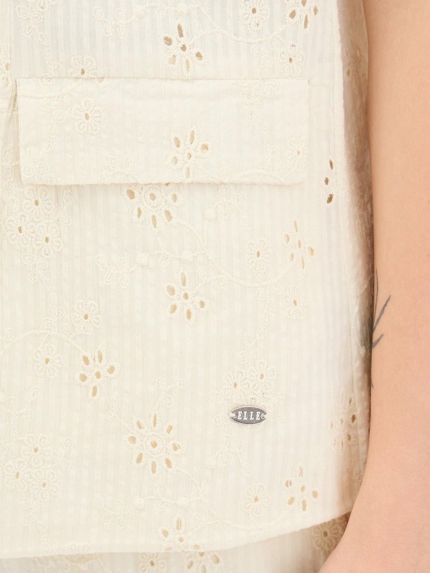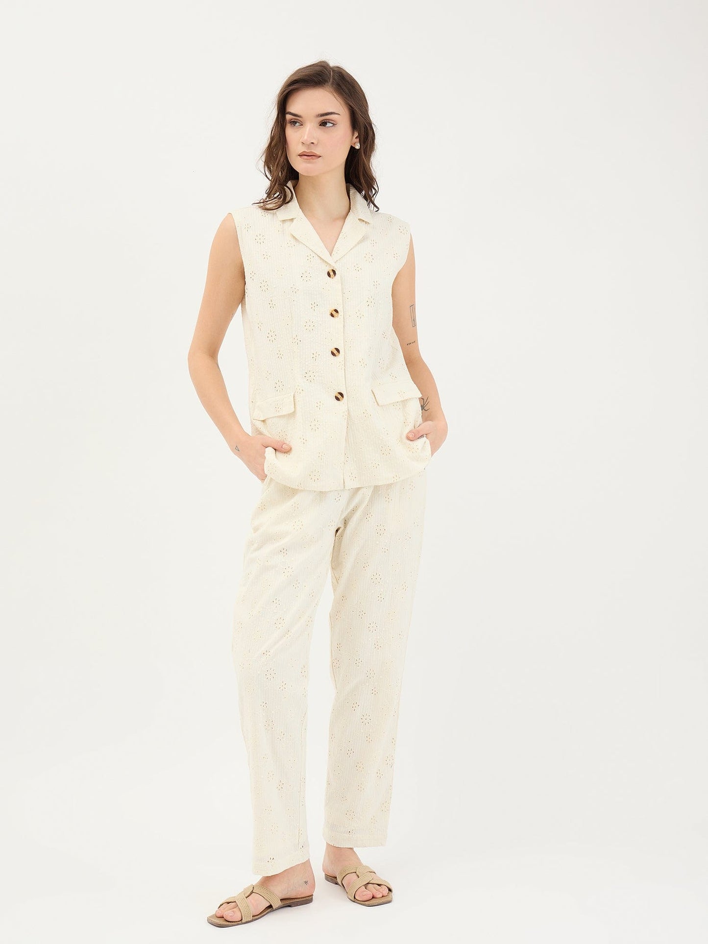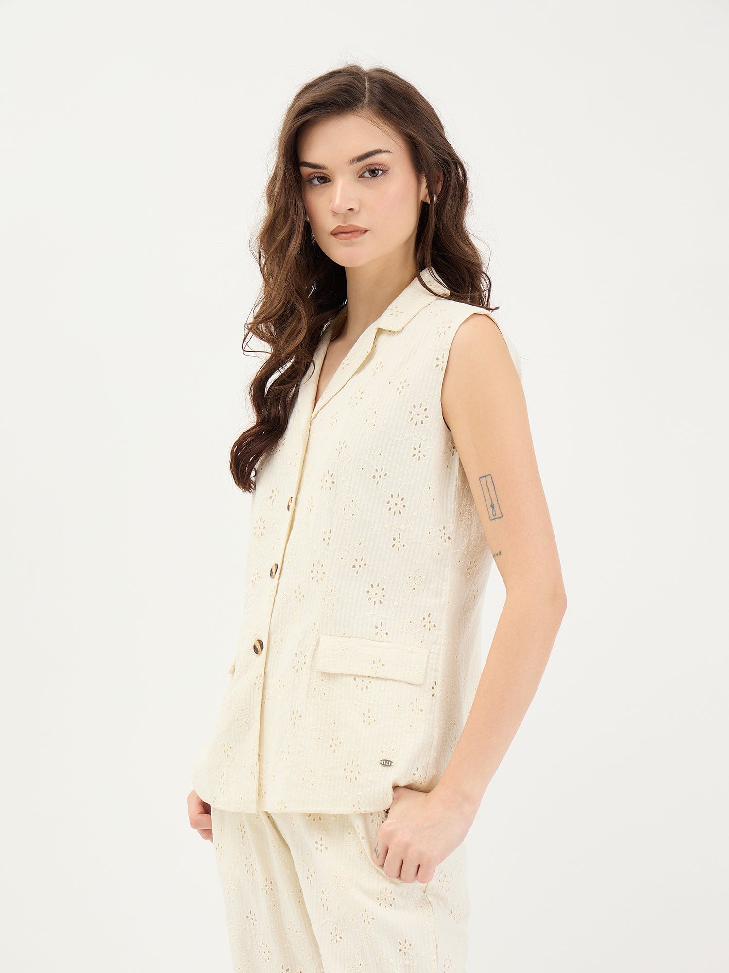 Discover effortless style with our white sleeveless top, crafted from pure cotton for ultimate comfort. This relaxed-fit piece features an elegant embroidered pattern, adding a touch of sophistication to your wardrobe. The notch collar design offers a modern twist, while the button closure ensures ease of wear. Perfect for warm days or layering under a jacket, this versatile top is a must-have for any fashion-forward woman. Pair it with your favorite jeans or a skirt for a chic, polished look.