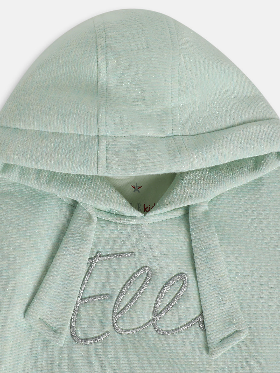 Introducing our girls sea green solid hooded pullover sweatshirt – a stylish choice for chilly days. Crafted from a cozy blend of 70% polyester and 30% cotton, it offers both warmth and comfort. With full sleeves and a trendy hood, this sweatshirt combines fashion and functionality seamlessly. Stay snug and fashionable in sea green.