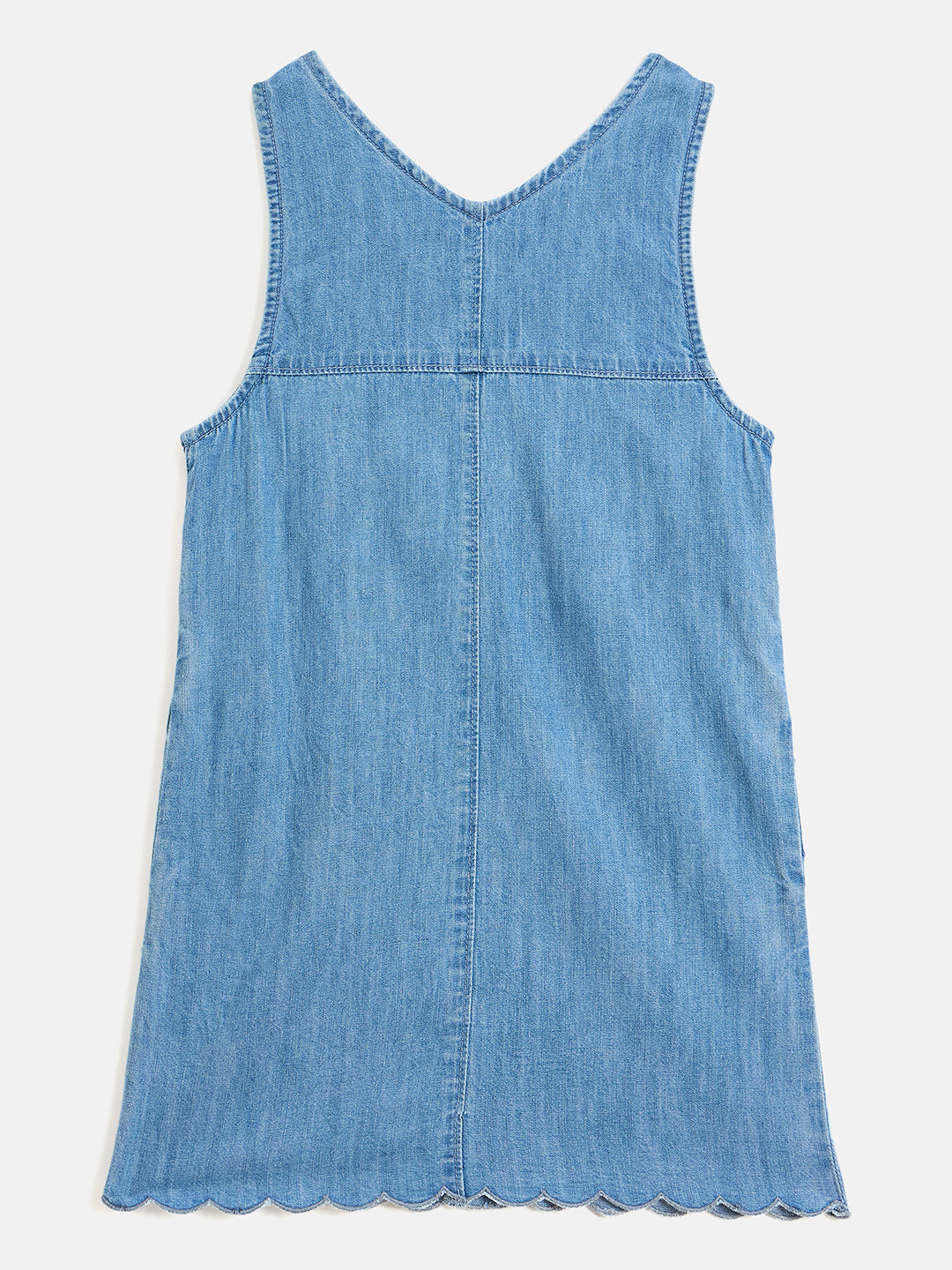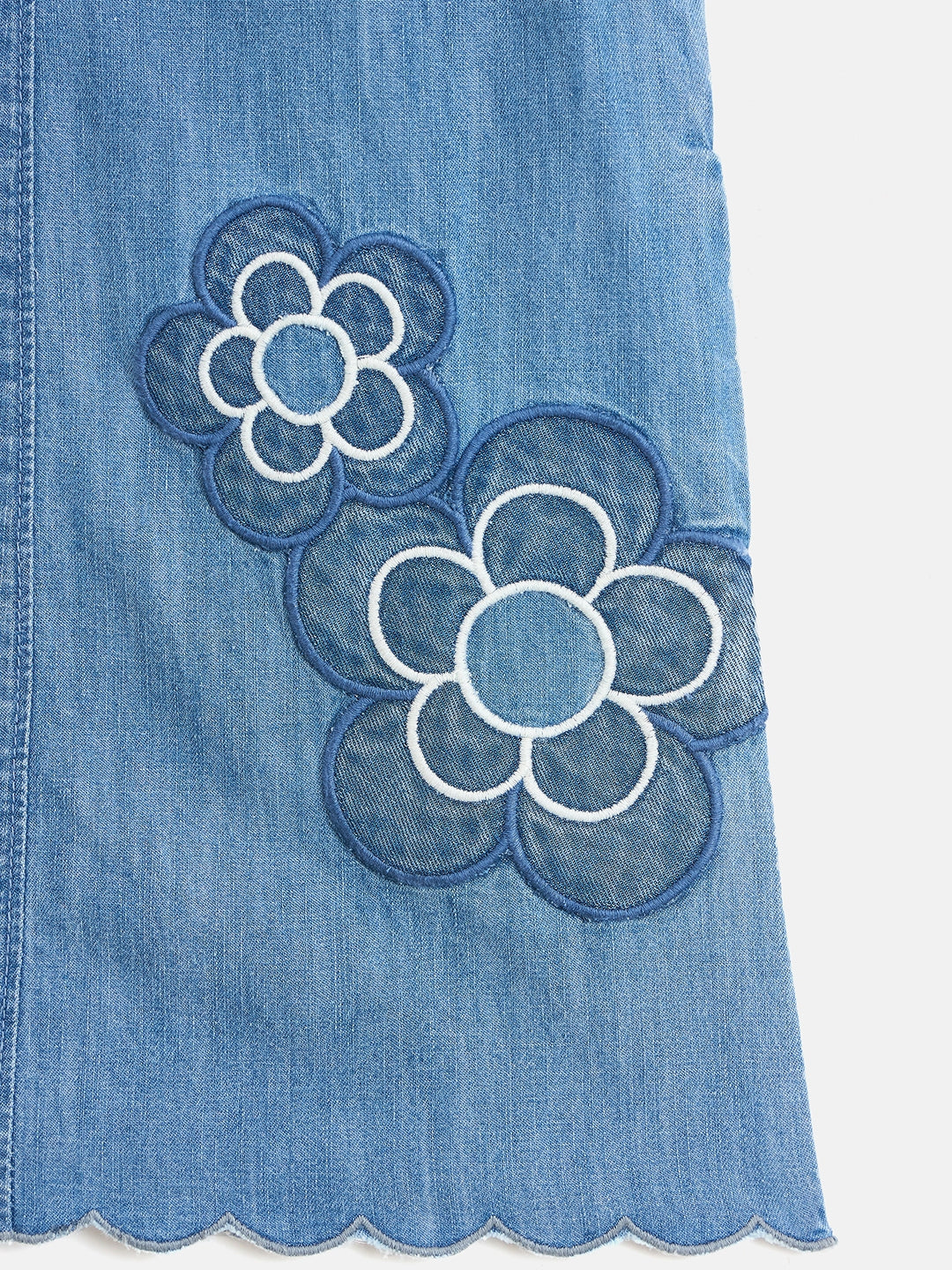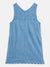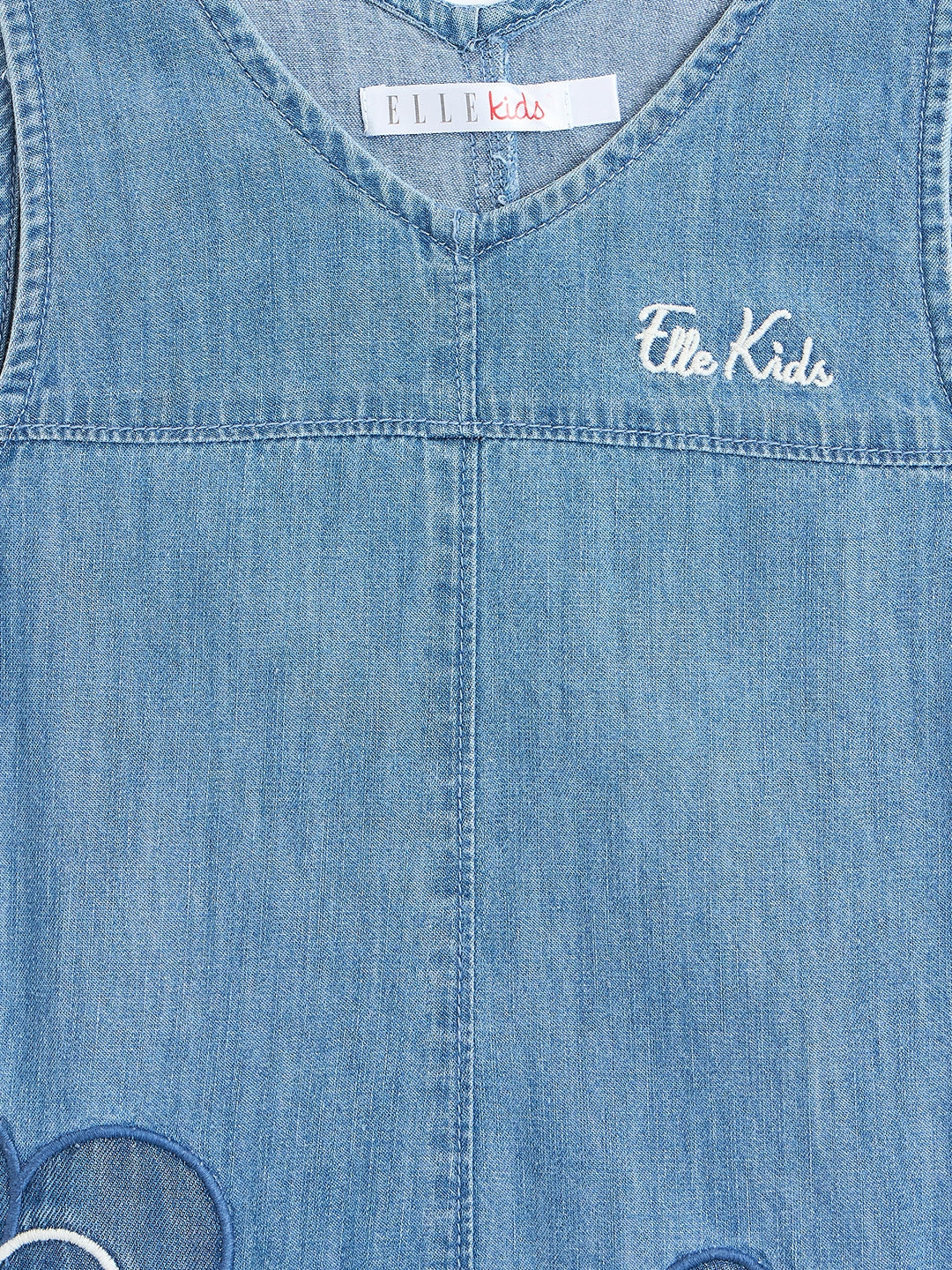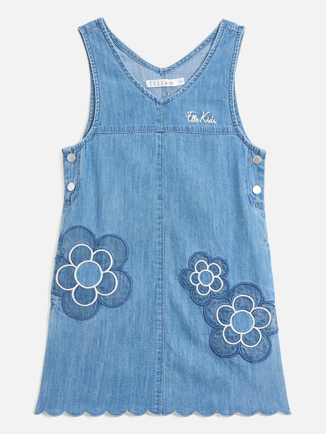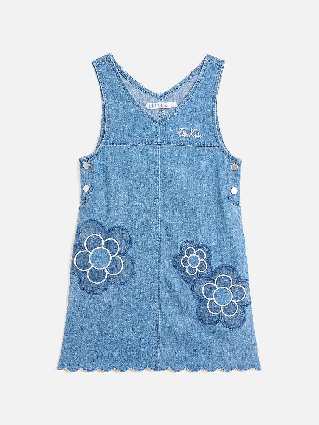 Discover the perfect blend of style and comfort with our blue pinafore denim dress for girls. Crafted from pure cotton, this dress ensures a soft and breathable fit for all-day wear. The charming a-line silhouette is adorned with a delightful floral applique pattern, adding a touch of whimsy to her wardrobe. Featuring a flattering v-neck and convenient button closure, this dress is easy to wear and versatile for any occasion. Ideal for playdates or family outings, it's a must-have for every young fashionista.