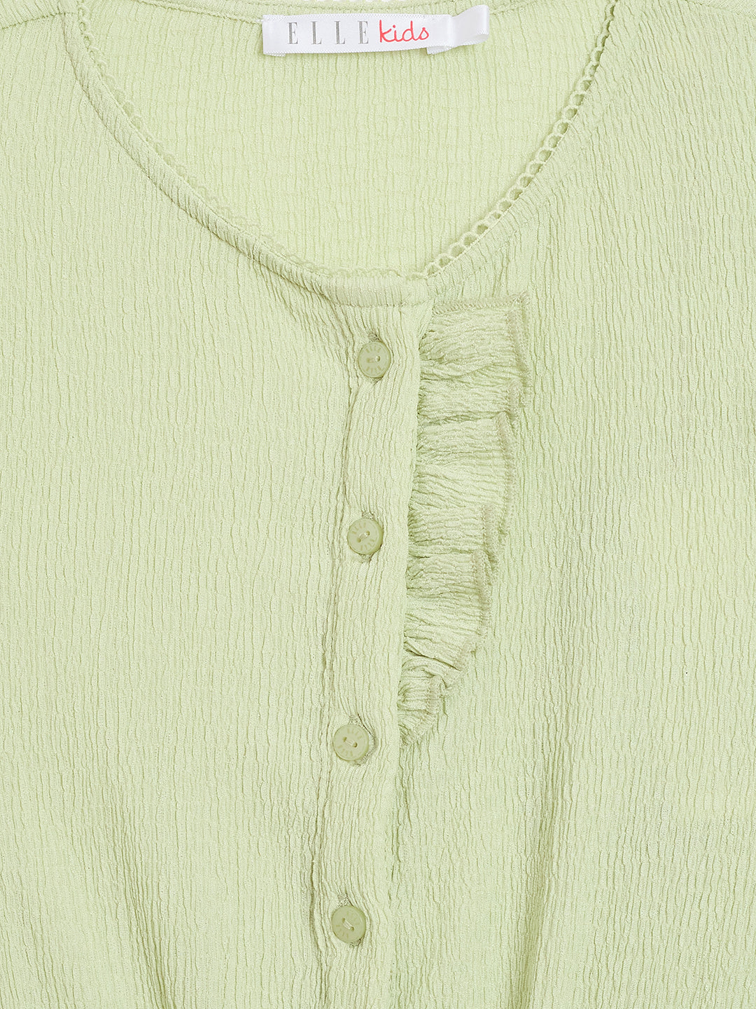 This charming green playsuit features a relaxed fit and textured pattern, perfect for playful days. Crafted from a soft polyester blend, it offers a sleeveless design and a classic round neck. The convenient button closure ensures easy wear, making it an ideal choice for stylish comfort in any girl's wardrobe.