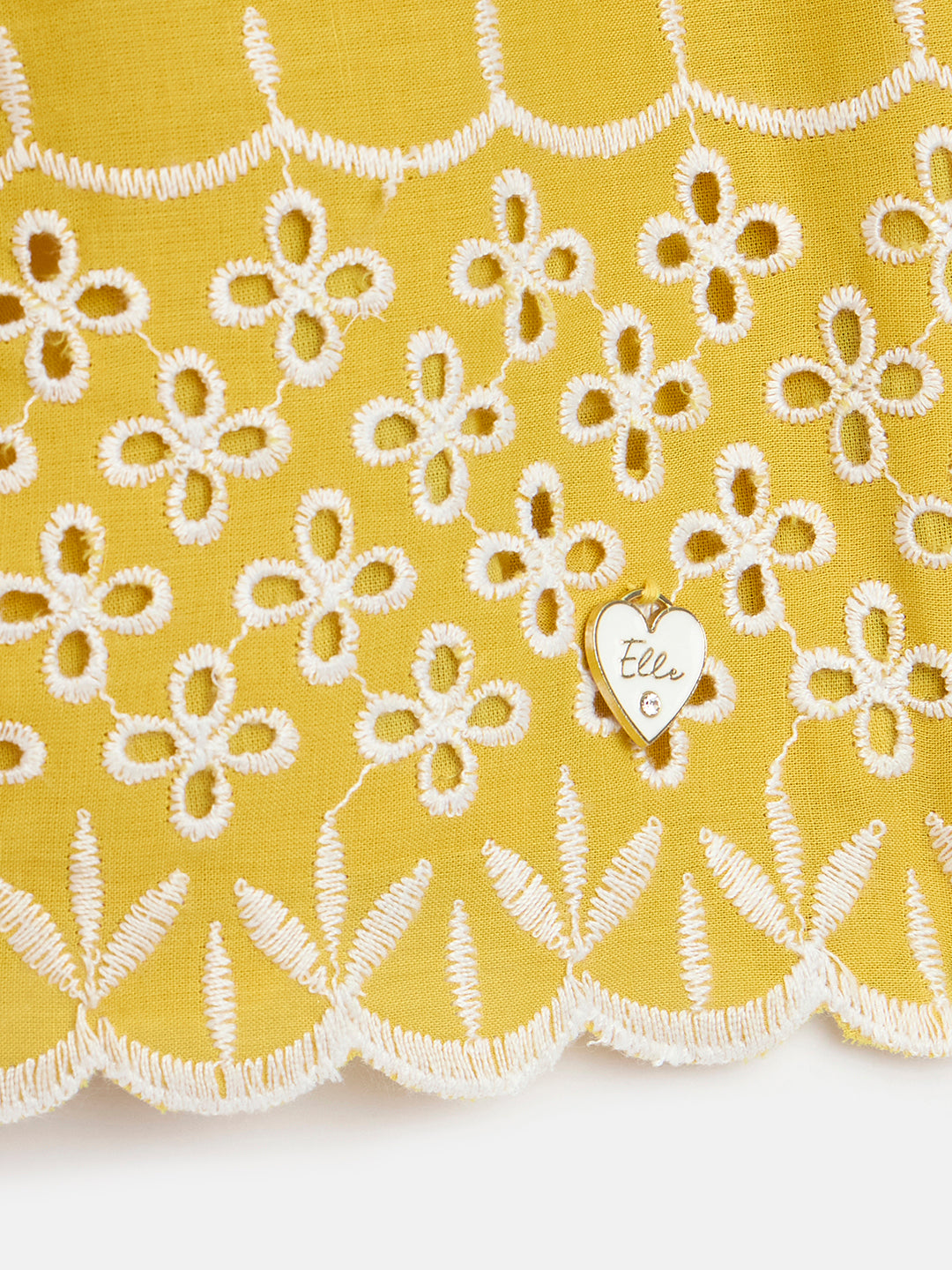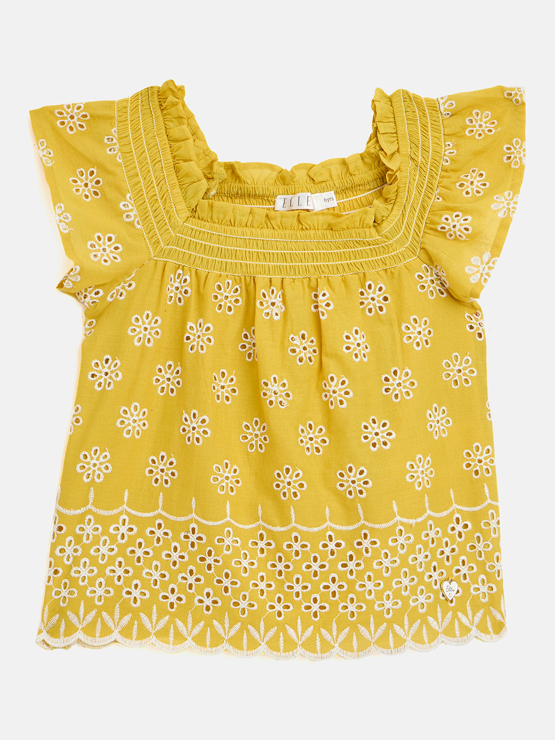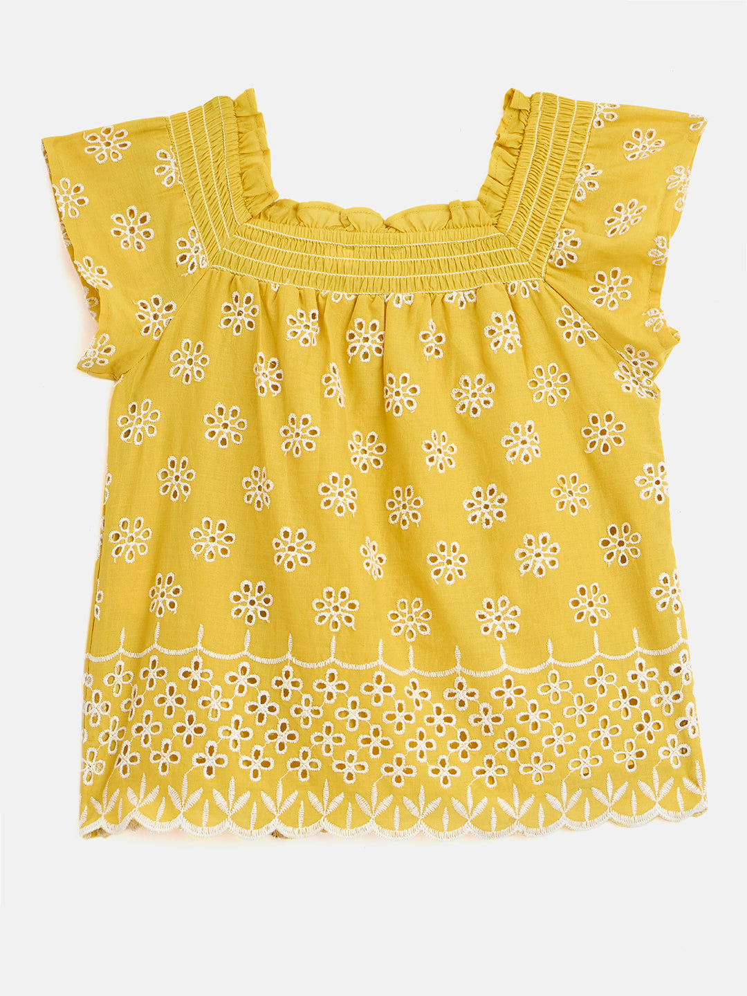 Discover the perfect blend of style and comfort with our yellow top for girls. Crafted from pure cotton, this top features a relaxed fit that ensures all-day comfort. The smocking schiffli embroidered pattern adds a touch of elegance, while the cap sleeves and square neck offer a modern twist. Designed with a convenient pull-on closure, this top is easy to wear and perfect for any occasion. Whether paired with jeans or a skirt, it's a versatile addition to any wardrobe, promising both style and ease.