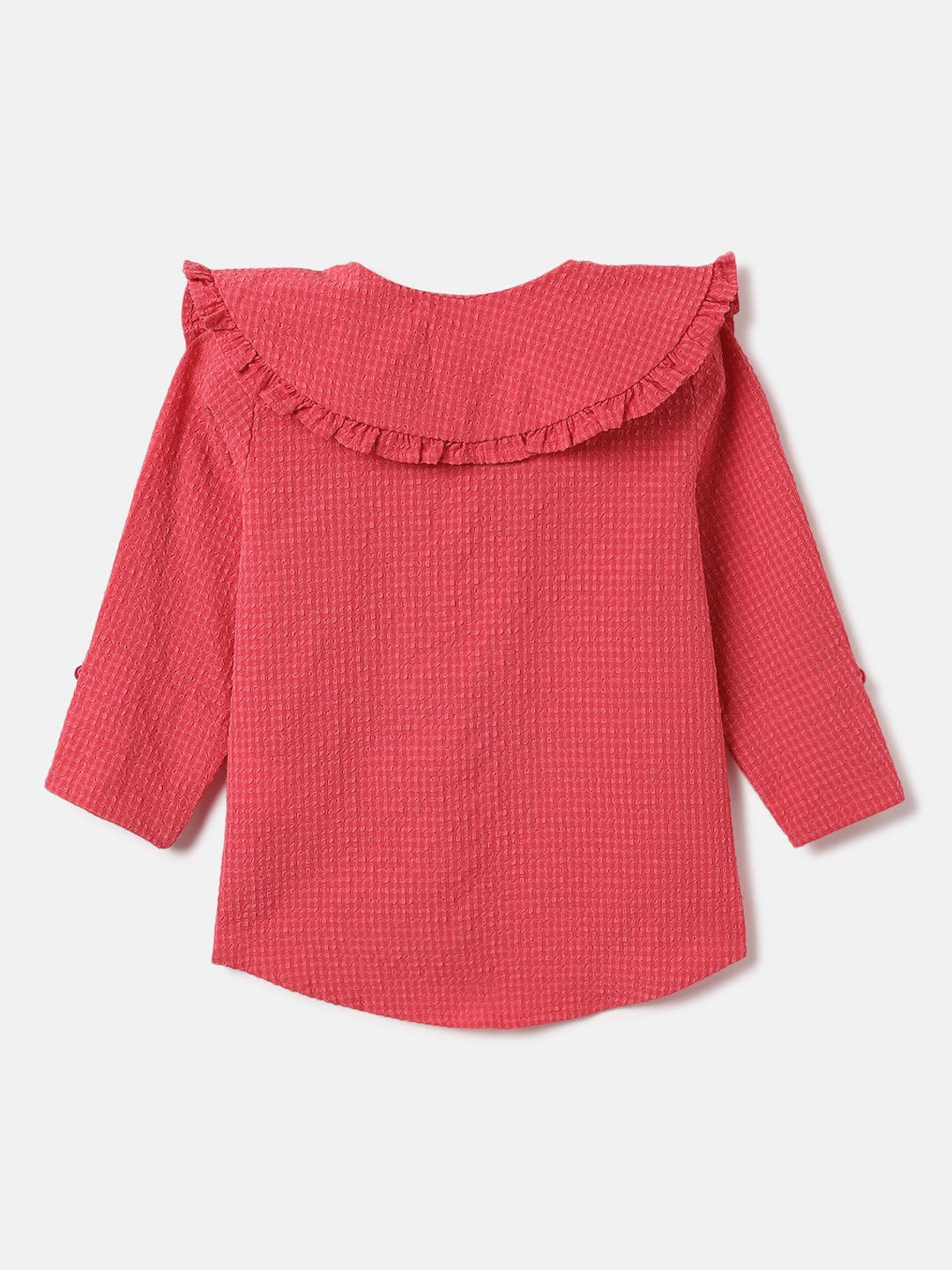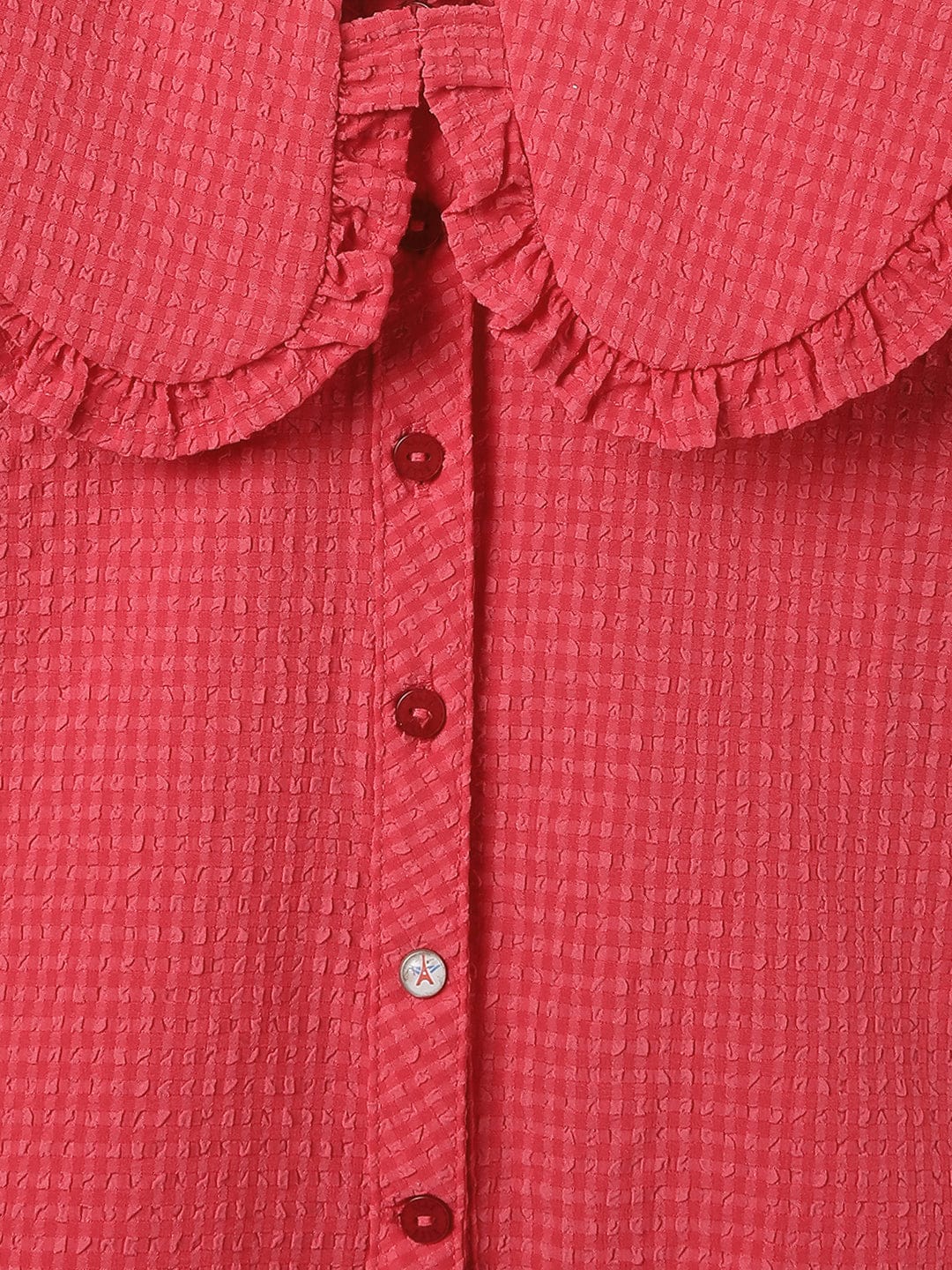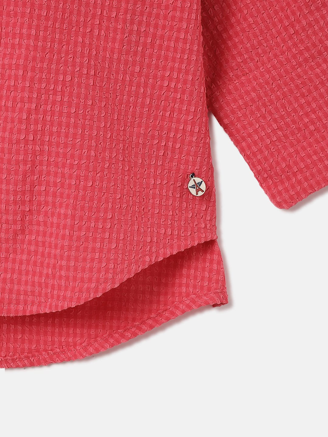This red shirt top is perfect for girls who love a relaxed fit and a touch of style. The textured pattern adds a unique touch while the 3/4th sleeves and peter pan collar create a classic look. The wide collar adds a touch of sophistication. Made from polyester fabric this shirt top is comfortable and easy to care for. The button closure makes it easy to put on and take off.