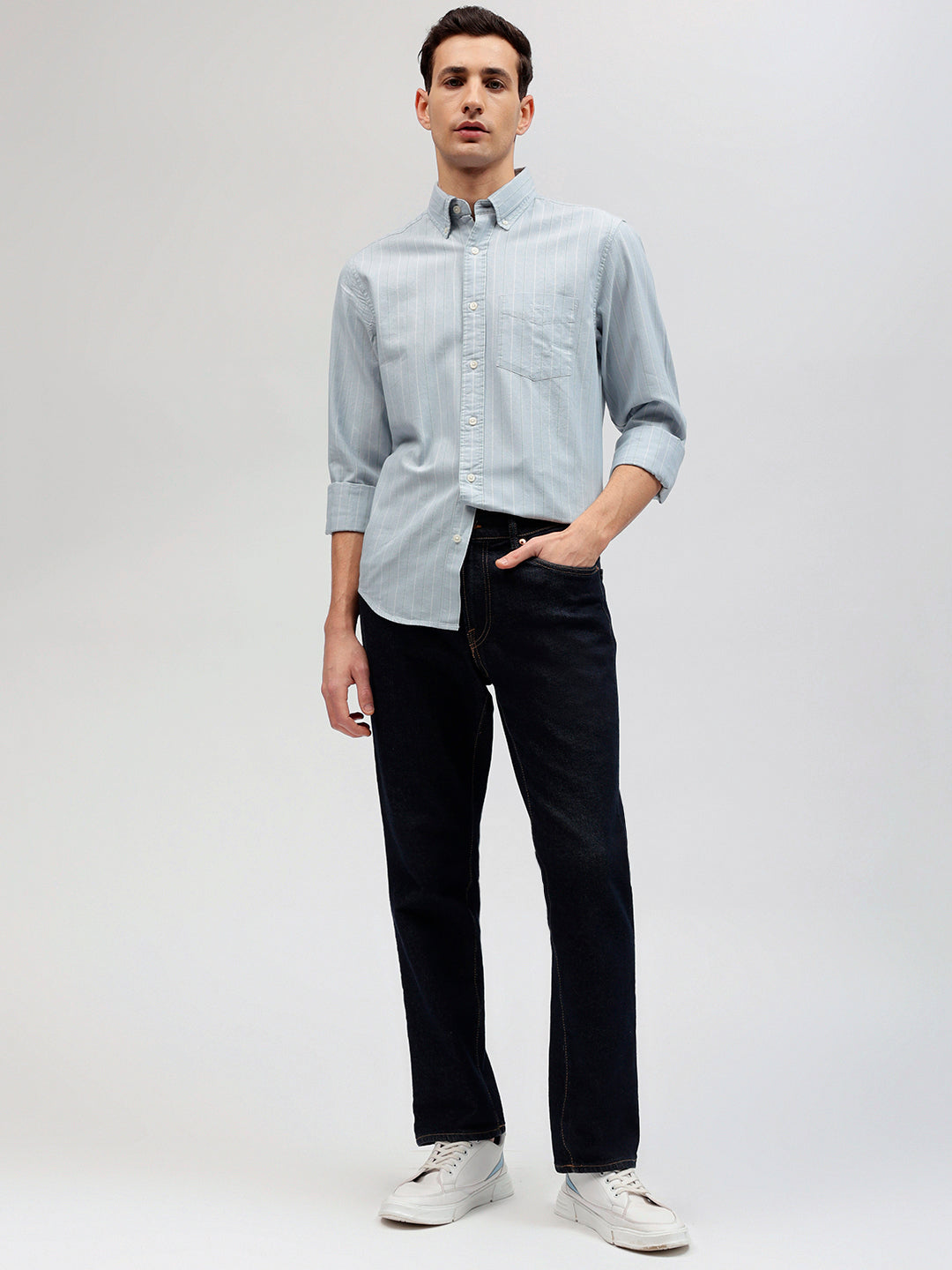 Embrace timeless style with our blue striped shirt for men. Crafted from premium organic cotton, this shirt features a regular fit and full sleeves for ultimate comfort. The button-down collar adds a touch of sophistication, while the button closure ensures a secure and polished look. Elevate your wardrobe with this versatile and effortlessly stylish piece.