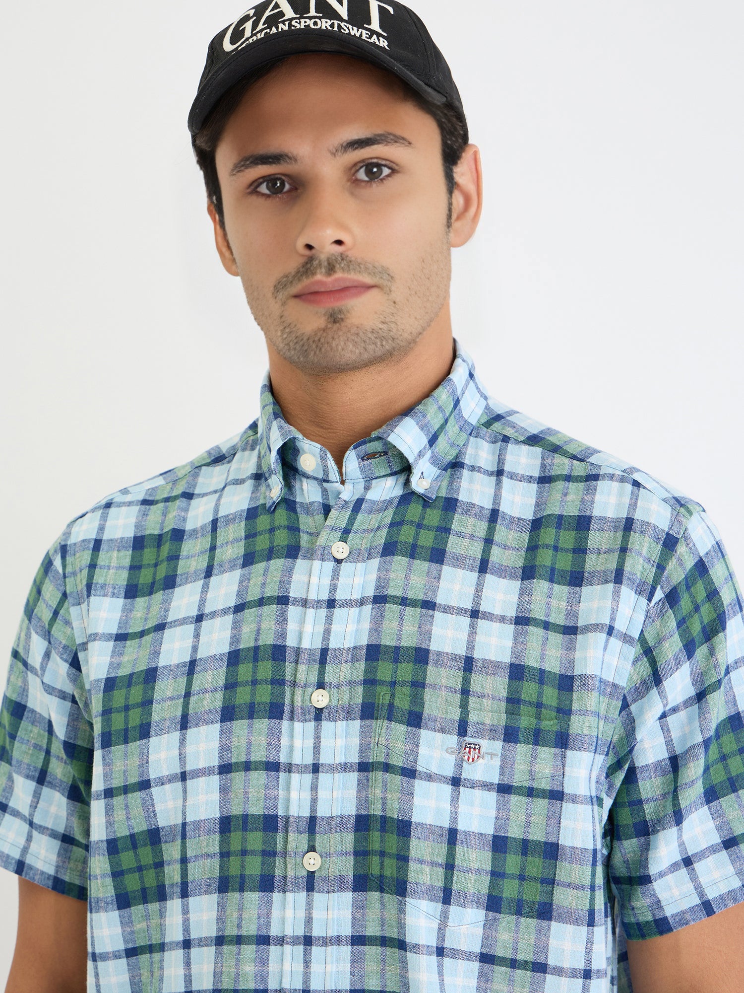 Embrace effortless style with this breezy linen blend shirt. Crafted in a classic green check pattern, it features a comfortable regular fit, short sleeves, and a button-down collar. The linen blend fabric offers breathability and a soft feel, while the button closure ensures a secure fit. Perfect for casual outings, weekend adventures, or adding a touch of sophistication to your everyday look.