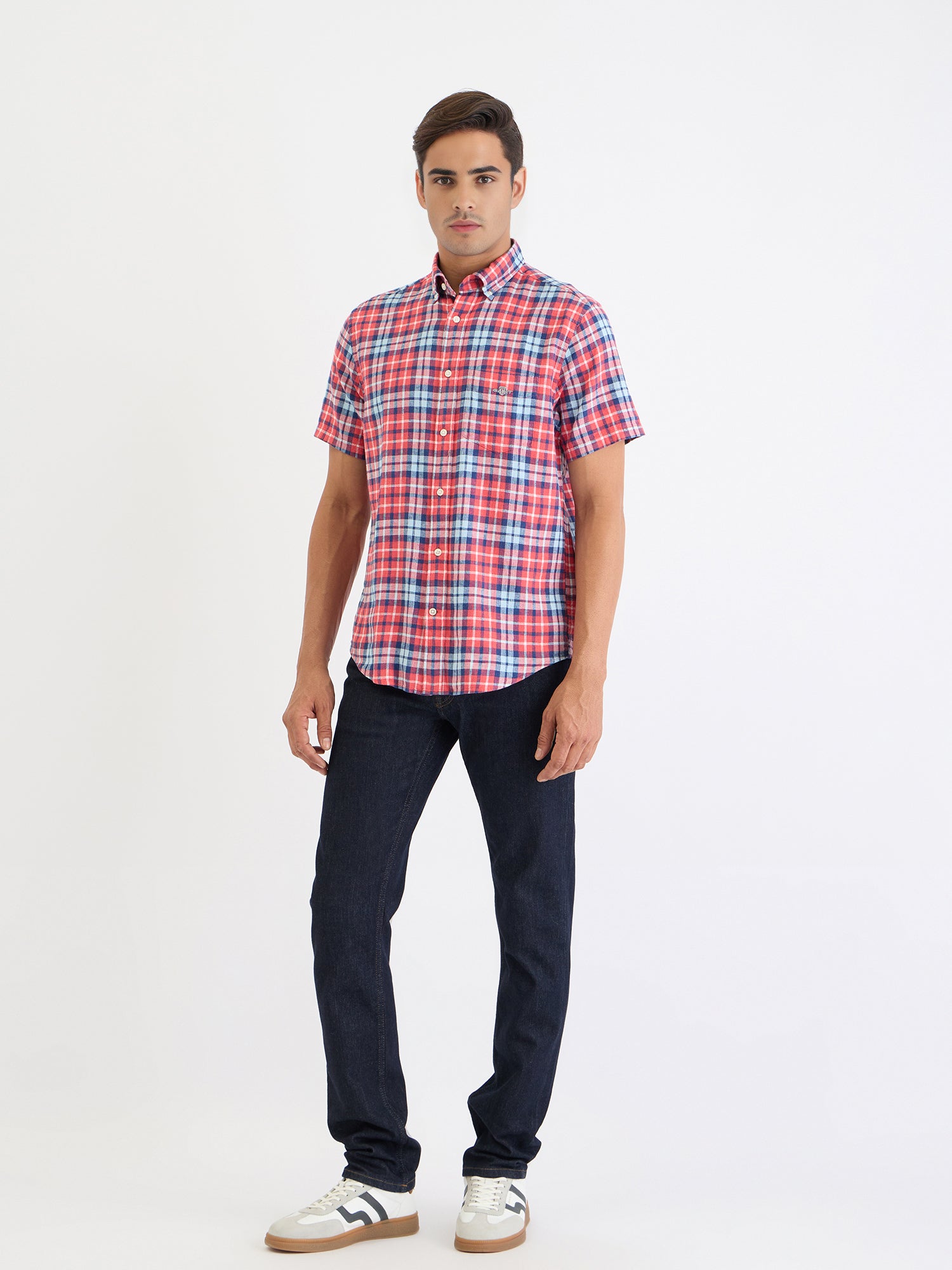 Embrace effortless style with this classic red checked shirt. Crafted from a breathable linen blend, it offers comfort and sophistication. The regular fit ensures a flattering silhouette, while the short sleeves and button-down collar provide a timeless appeal. Perfect for casual outings or smart casual occasions, this shirt is a versatile addition to your wardrobe.