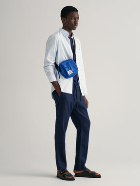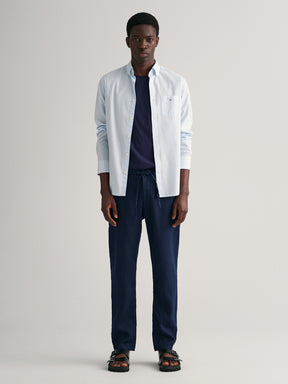 Step out in style with the iconic GANT Men Blue Solid Relaxed Fit Trouser. Crafted with 100% linen, this breathable and wicking pant is perfect for hot summer days.