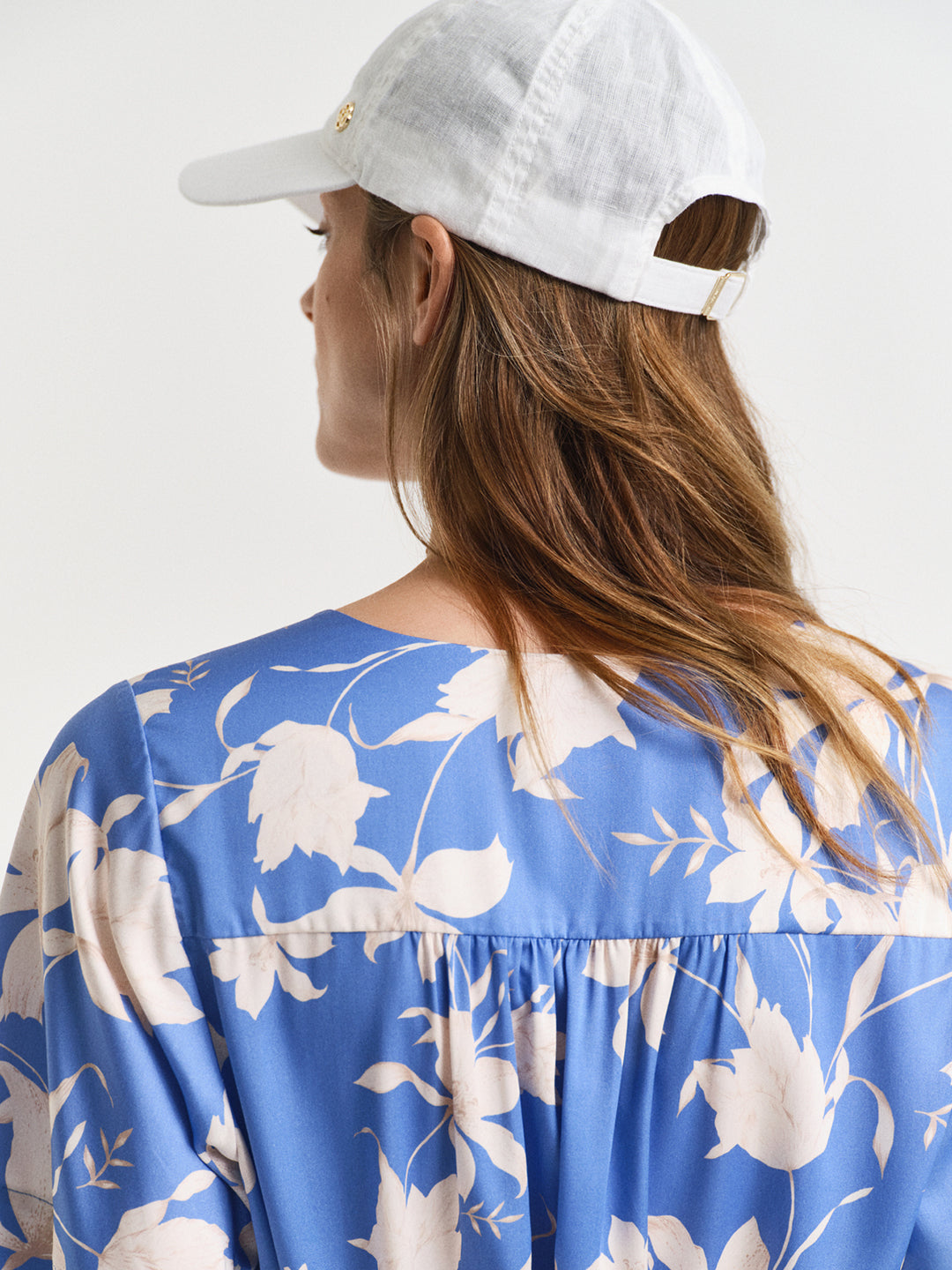 Embrace effortless elegance in this breezy A-line dress. Crafted from a soft viscose blend, it drapes beautifully with a relaxed fit that flatters every figure. The vibrant blue print adds a touch of whimsy, while the V-neckline and short sleeves offer a flattering and comfortable silhouette. Perfect for casual days, weekend adventures, or a relaxed evening out, this dress is a versatile wardrobe essential.