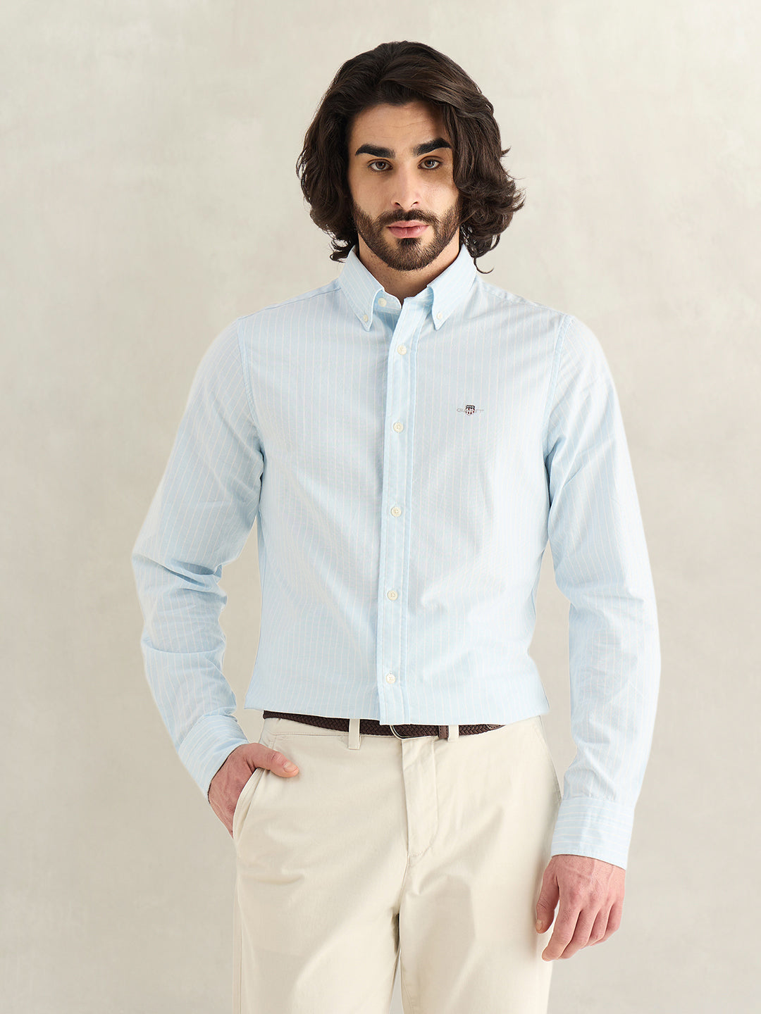 Elevate your wardrobe with the GANT Men's Sky Blue Striped Shirt. This classic yet stylish shirt features a sophisticated sky blue color with subtle stripes, making it perfect for any occasion. Crafted from high-quality materials, this shirt offers both comfort and durability. Whether you are dressing up for a formal event or keeping it casual for a weekend outing, this versatile shirt is sure to make you stand out. Upgrade your style with the GANT Men's Sky Blue Striped Shirt today.
