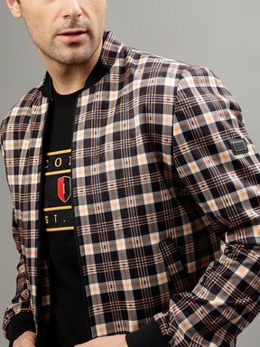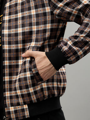 Men Checked Stand Collar Full Sleeves Bomber Jacket