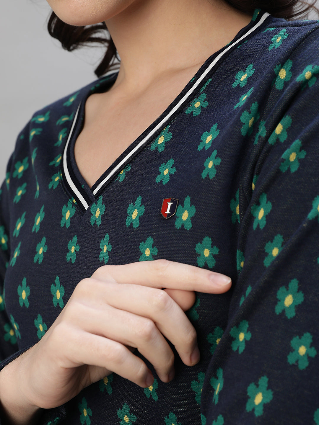 Iconic Women Navy Blue Printed V-Neck Full Sleeves Dress