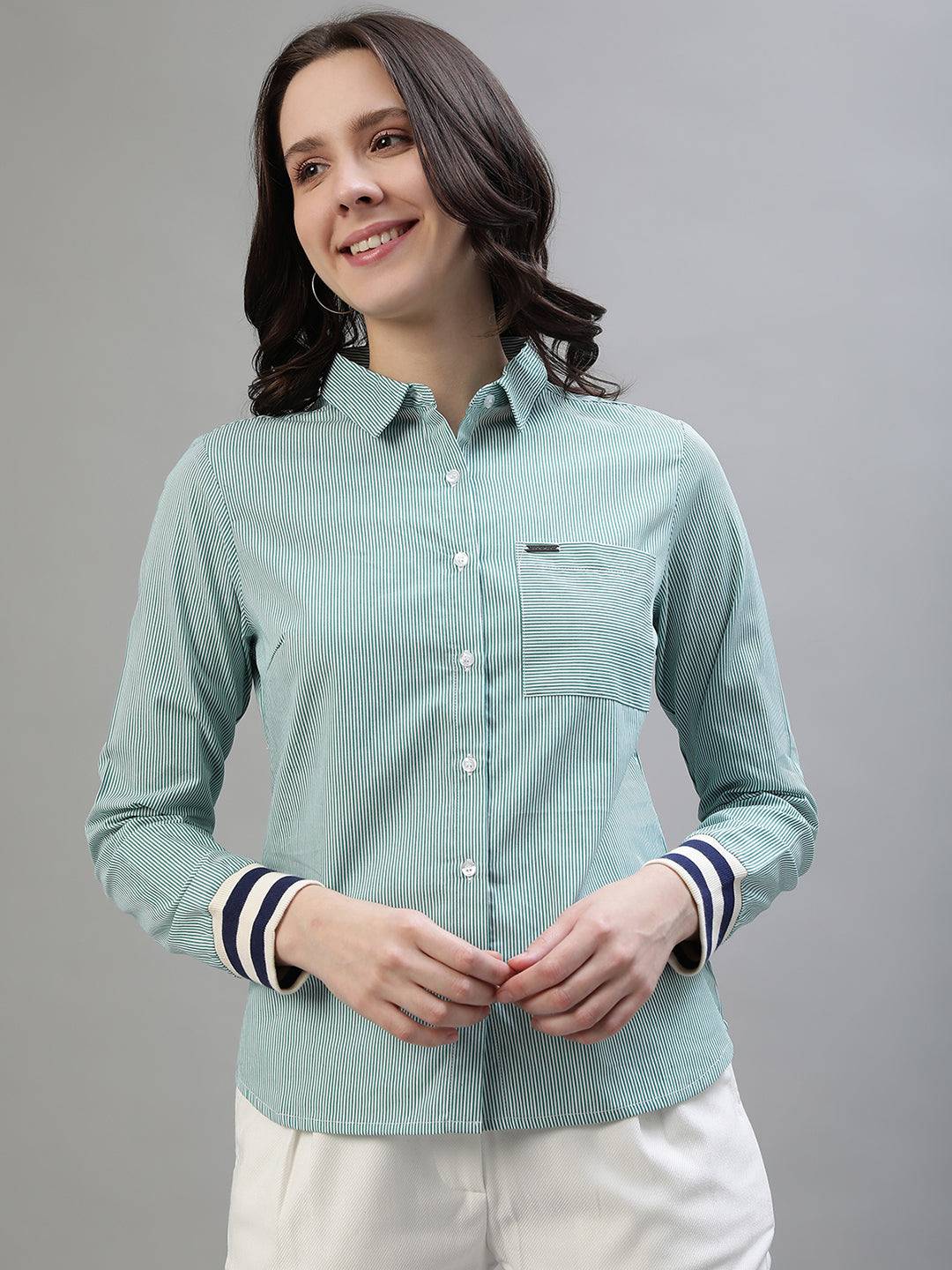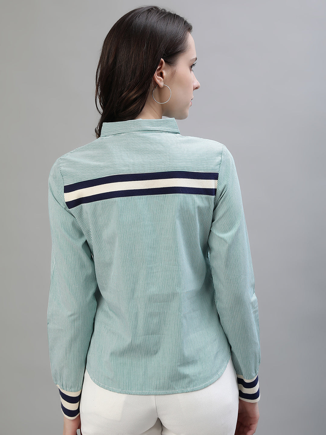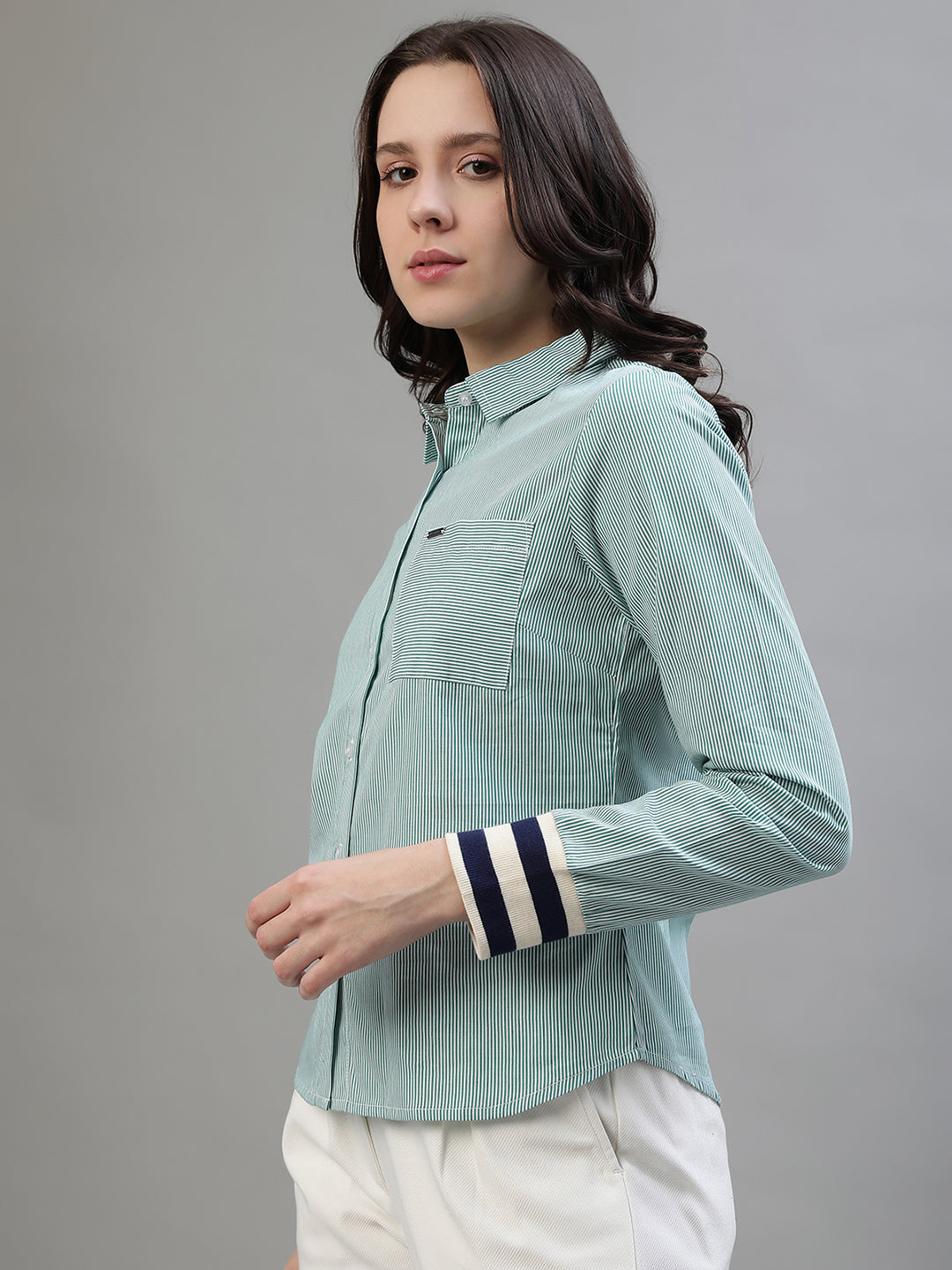 Women Green Striped Spread Collar Full Sleeves Shirt