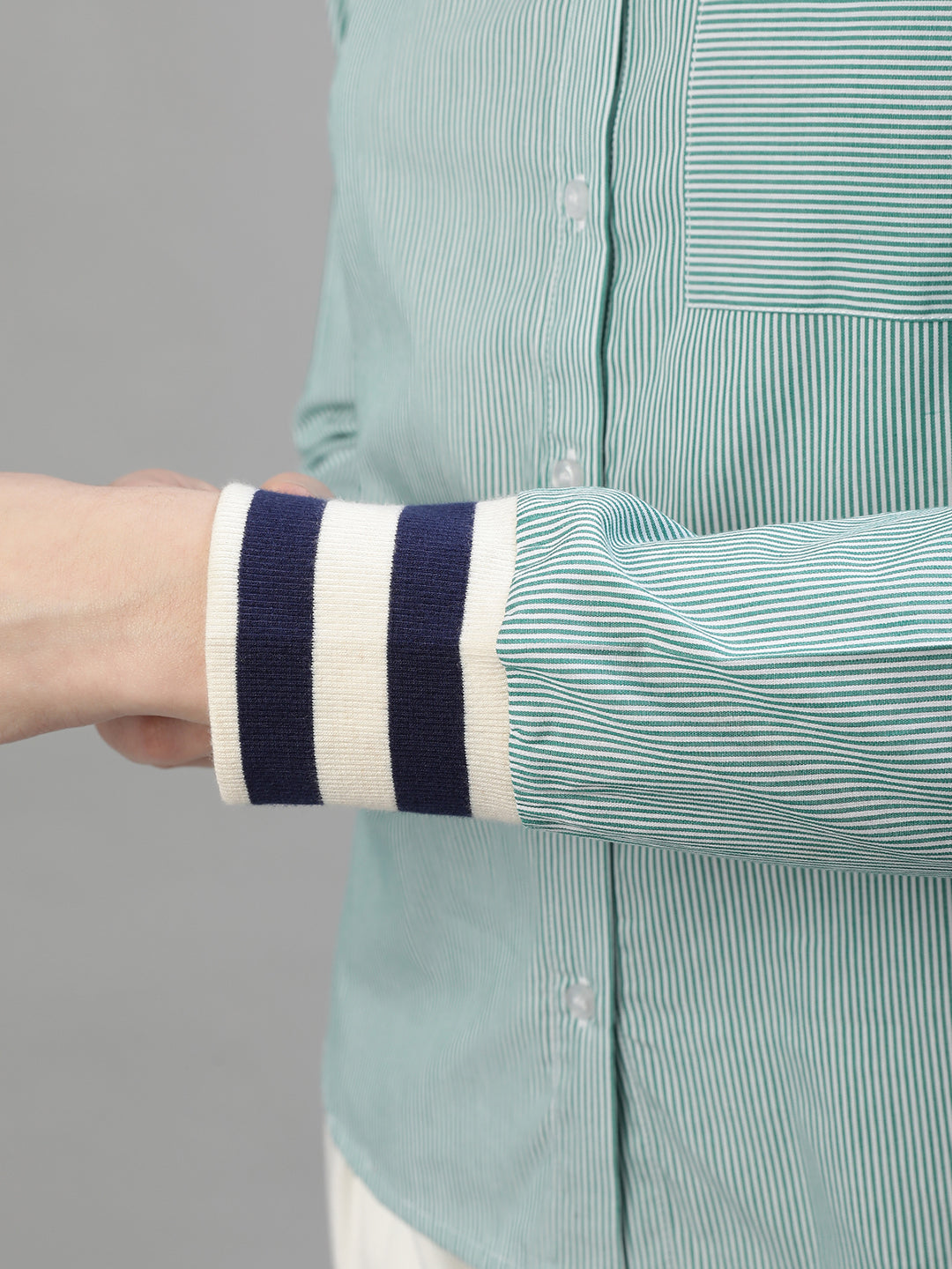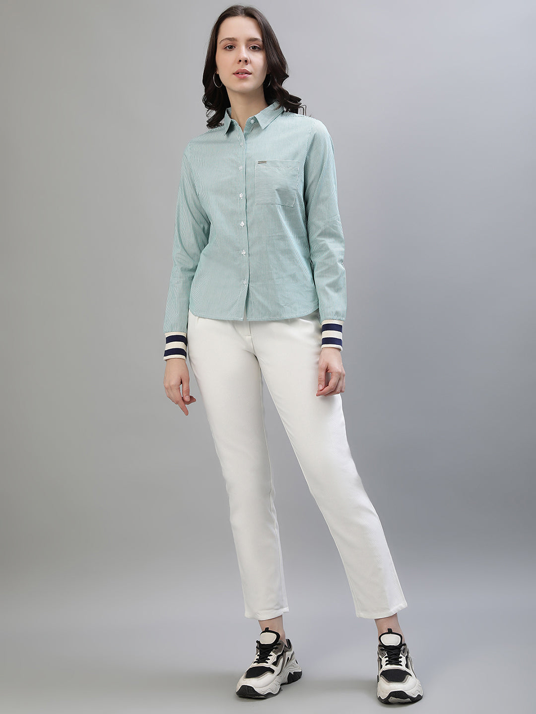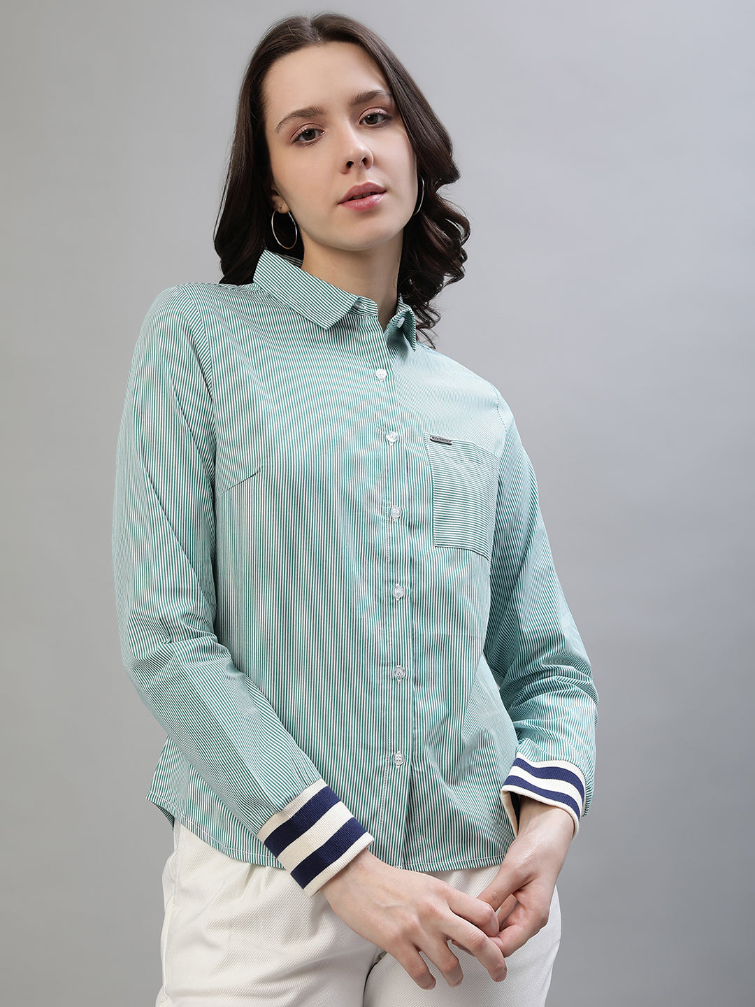 Women Green Striped Spread Collar Full Sleeves Shirt