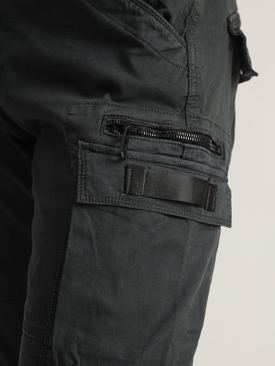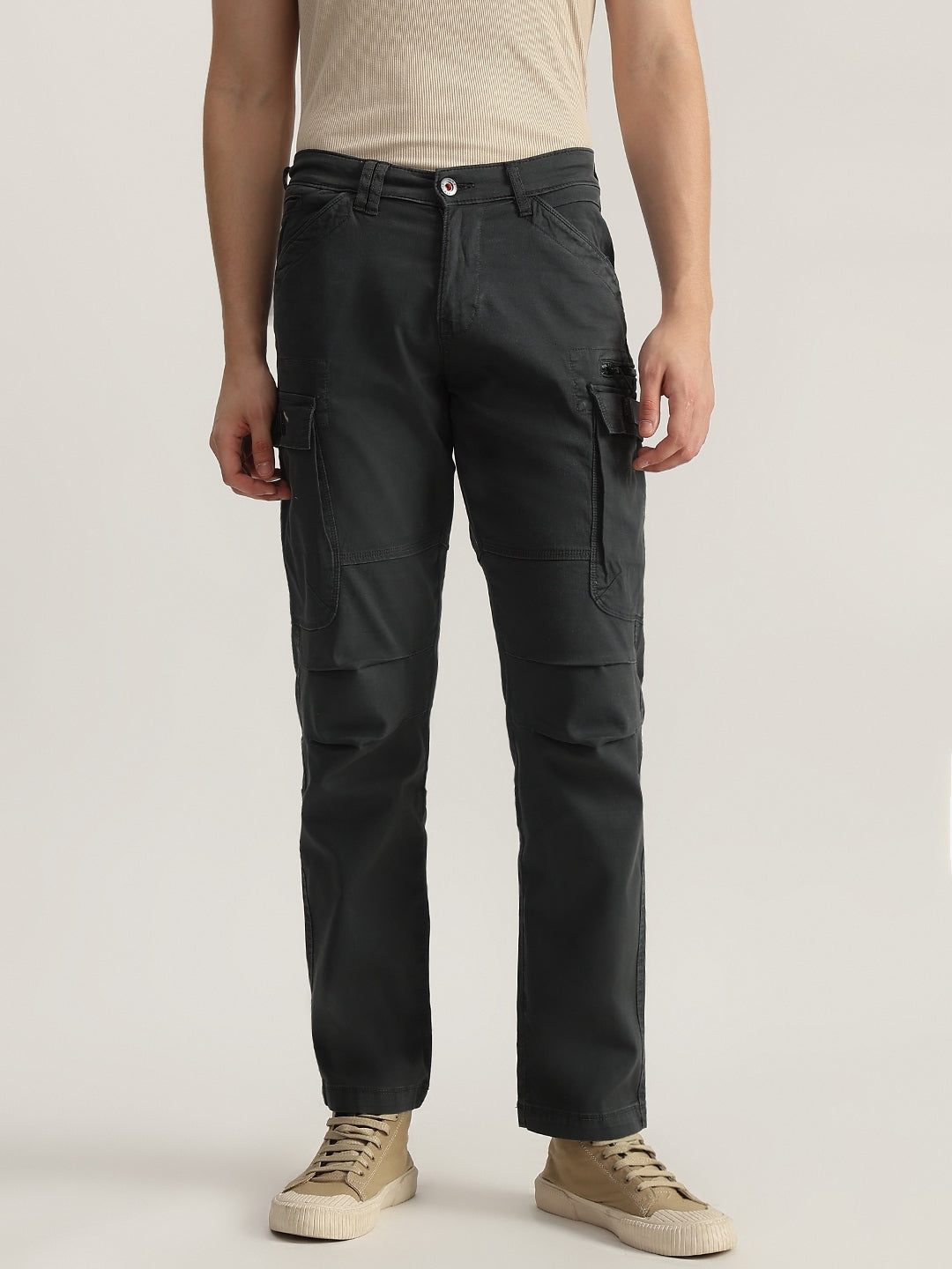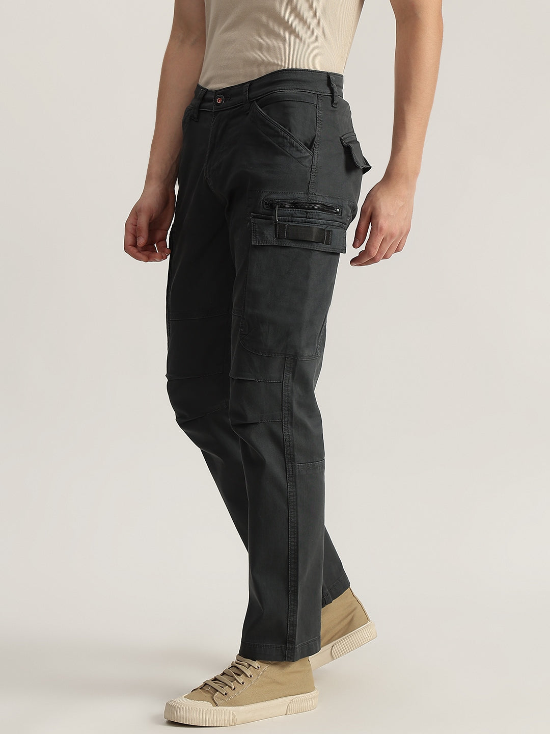 Elevate your casual style with these grey cargo trousers. Crafted from 100% cotton, they feature an oversized fit, mid-rise waist, button and zip closure, and multiple functional pockets. Perfect for everyday wear.