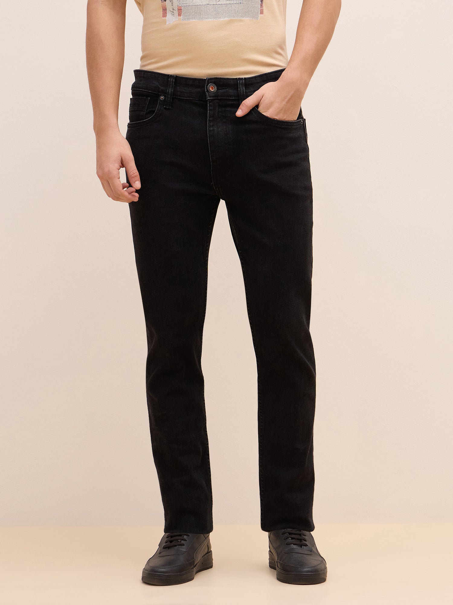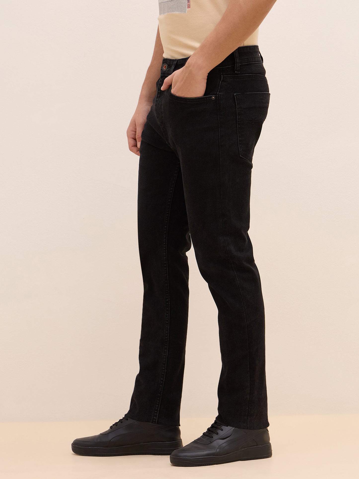 Black Slim Fit Jeans for Men. Crafted from a comfortable poly cotton blend these jeans offer a sleek and modern look. The mid-rise waist provides a flattering fit while the button and zipper closure ensures a secure fit. The solid pattern and slim fit make these jeans perfect for any occasion.