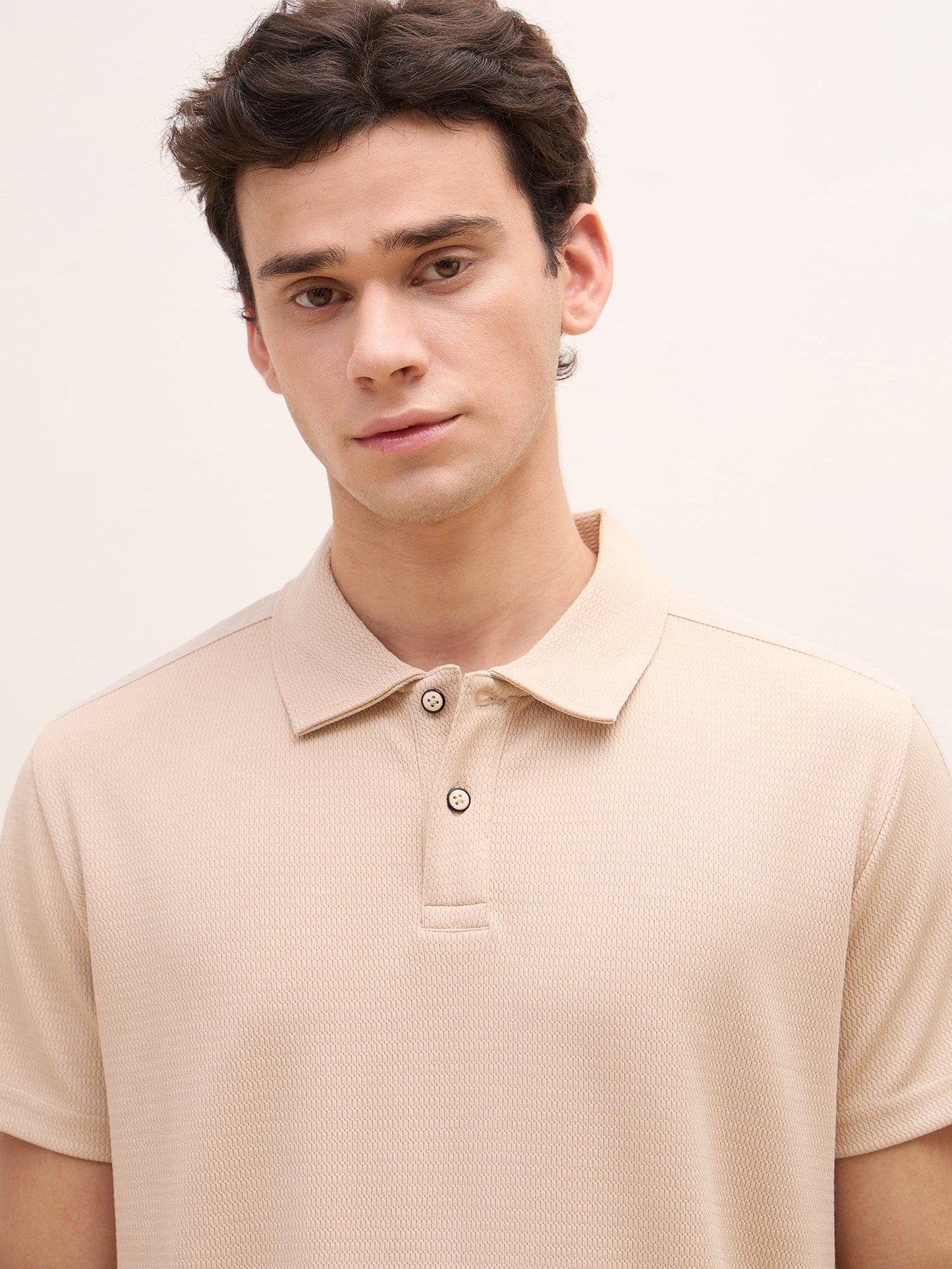 Elevate your casual style with this beige textured polo shirt. Crafted from a comfortable polyester blend, this regular-fit shirt features a classic polo collar, short sleeves, and a button closure. The textured pattern adds a touch of sophistication, making it perfect for both casual and semi-formal occasions.
