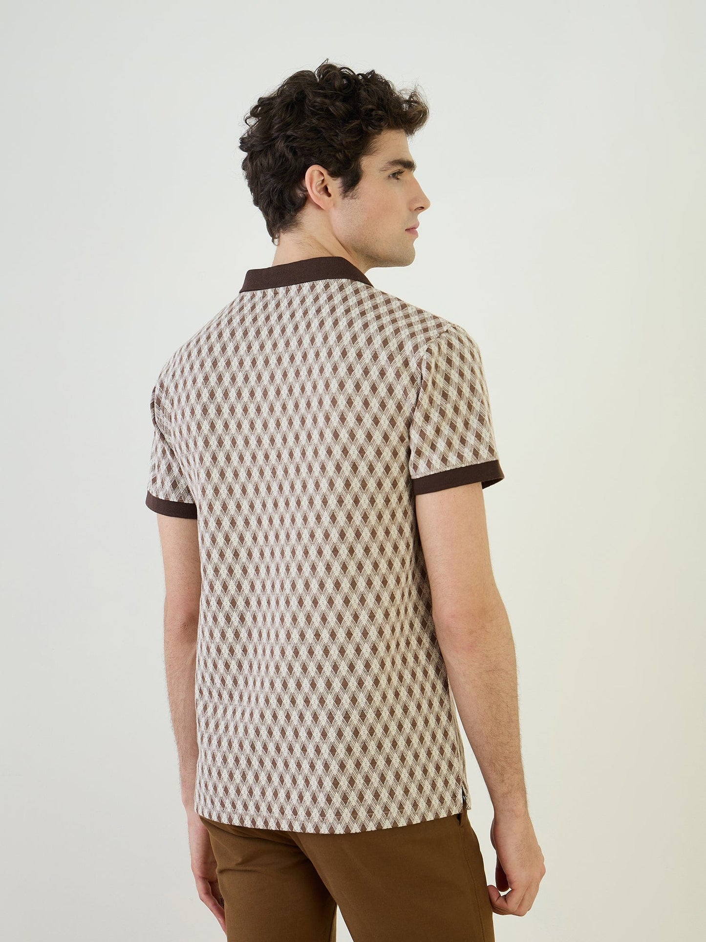 Discover the perfect blend of style and comfort with our men's brown polo t-shirt. Featuring a regular fit and eye-catching geometric pattern, this short-sleeve shirt is designed for the modern man. The classic polo collar and button closure add a touch of sophistication, while the stretchable polyester fabric ensures ease of movement and all-day comfort. Ideal for casual outings or a relaxed day at the office, this versatile polo t-shirt effortlessly elevates your wardrobe. Experience the perfect balance of fashion and functionality today.