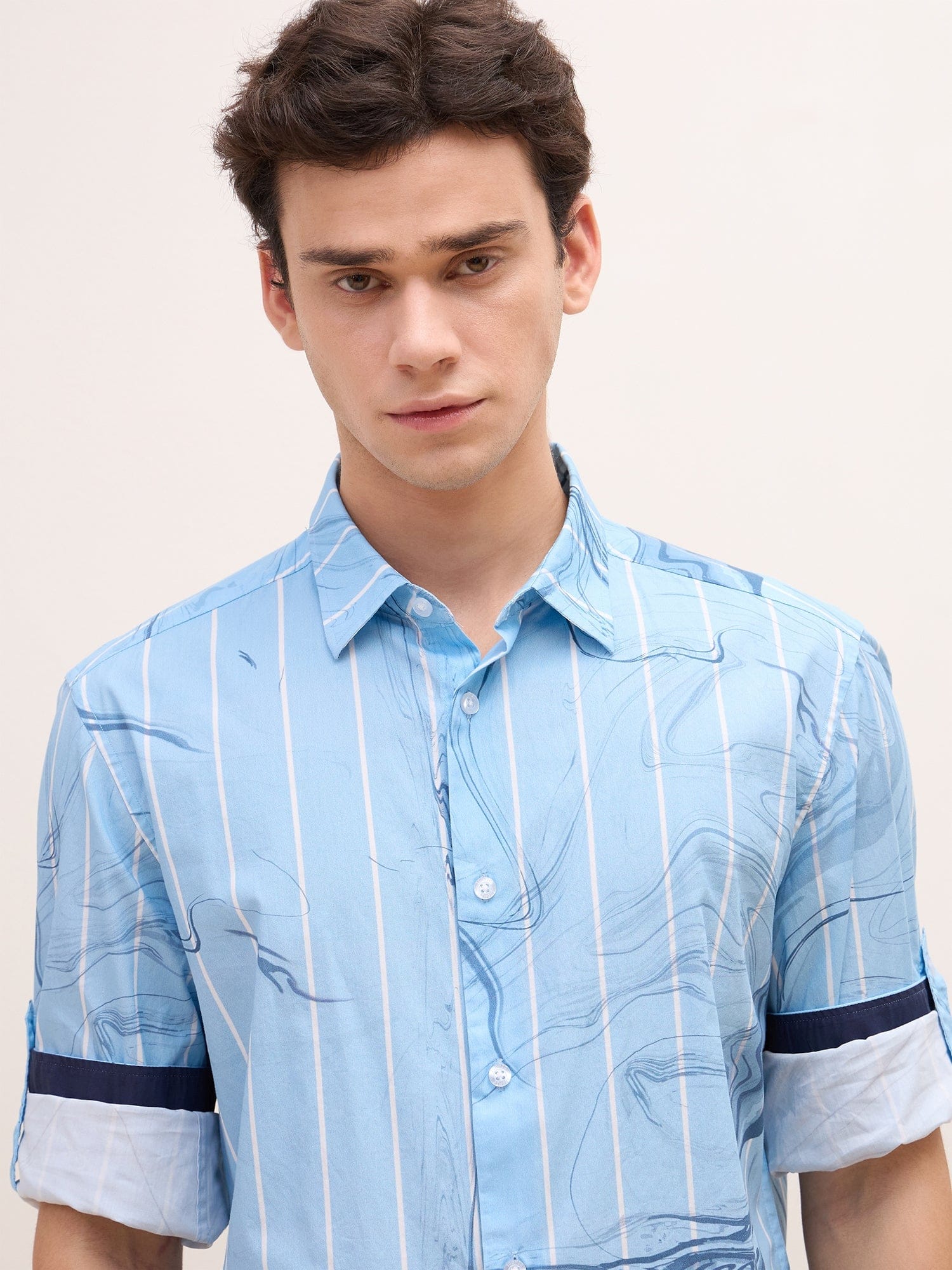 Embrace effortless style with this sky blue striped shirt. Crafted from soft cotton, it features a classic spread collar, full sleeves, and a comfortable regular fit. The subtle stripes add a touch of sophistication, while the button closure ensures a clean and polished look. Perfect for casual outings or smart casual events, this versatile shirt is a must-have for any man's wardrobe.