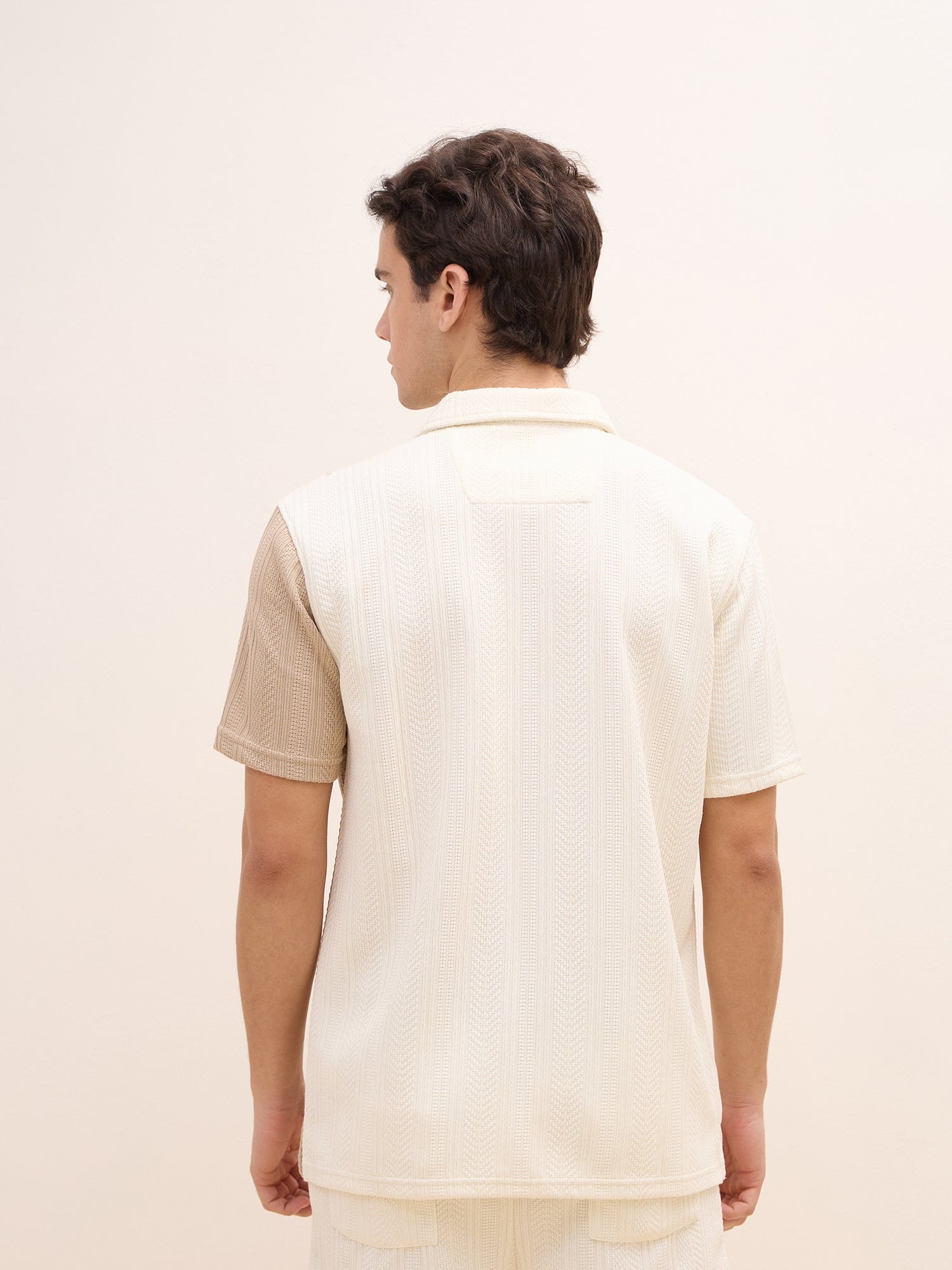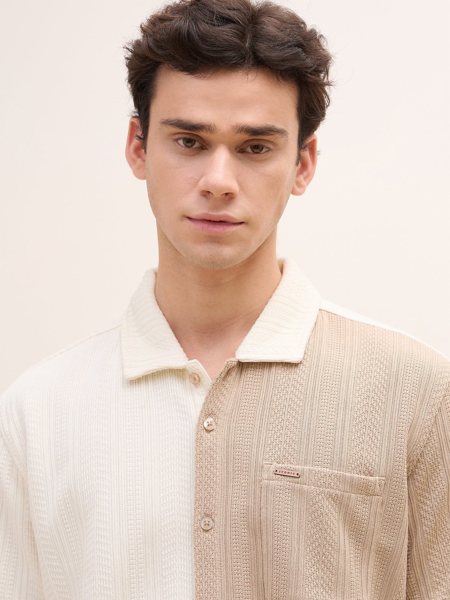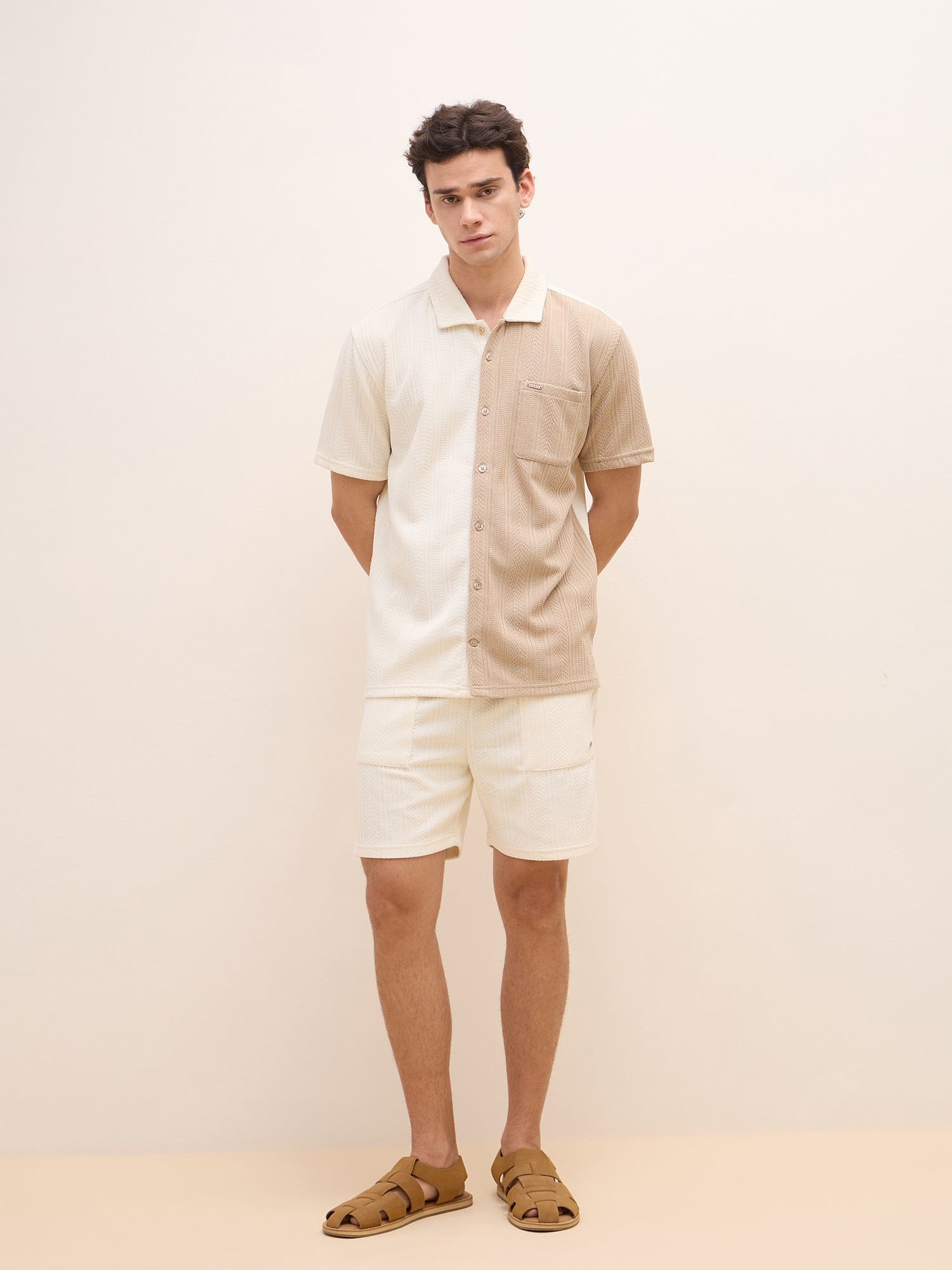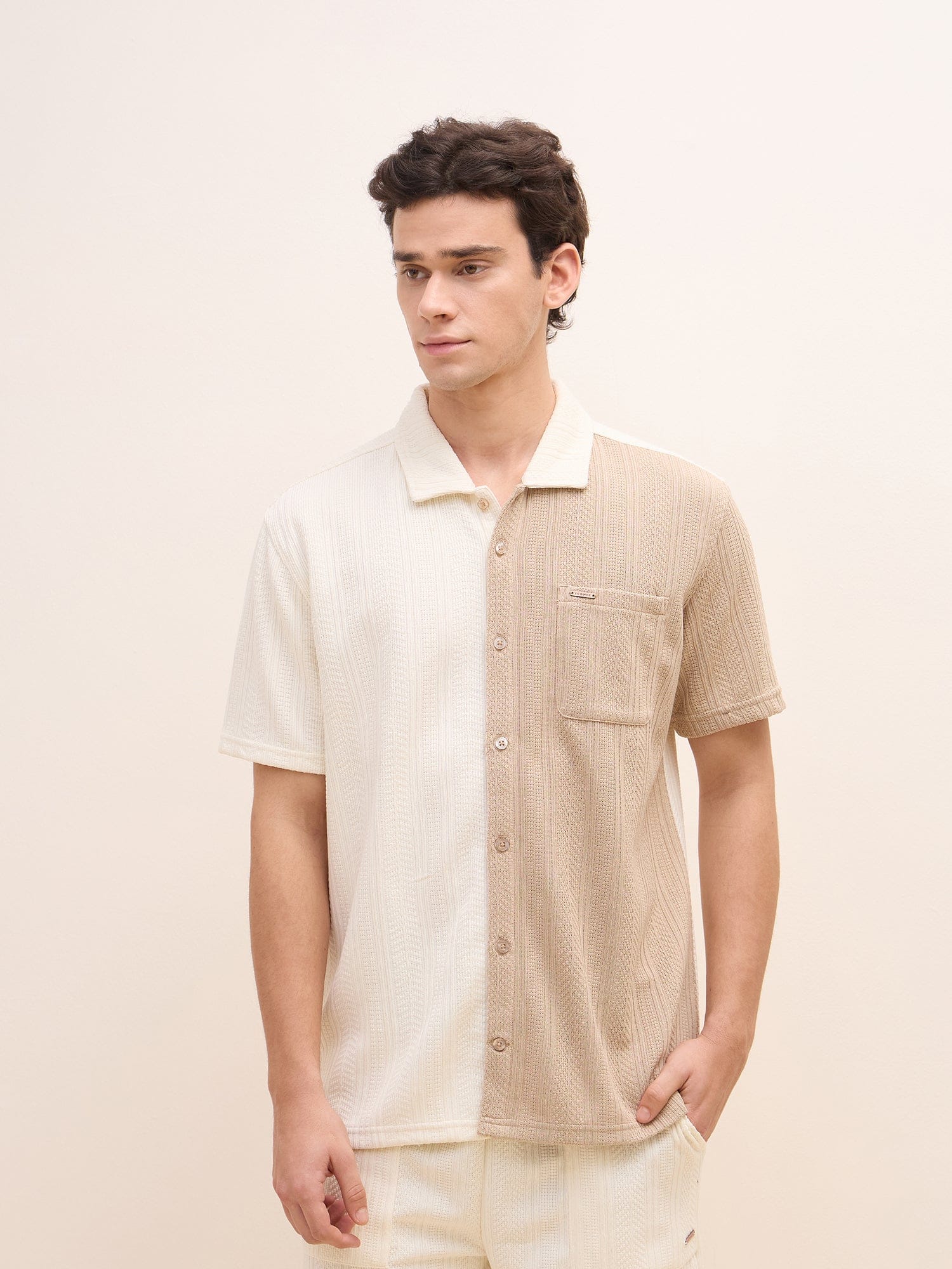 This beige men's shirt features a stylish colorblock pattern, offering a modern twist on a classic design. Crafted from a comfortable polyester blend fabric, it boasts a regular fit for a relaxed yet polished look. The short sleeves and spread collar provide a breezy and versatile feel, perfect for both casual and semi-formal occasions. The button closure ensures a secure and comfortable fit.
