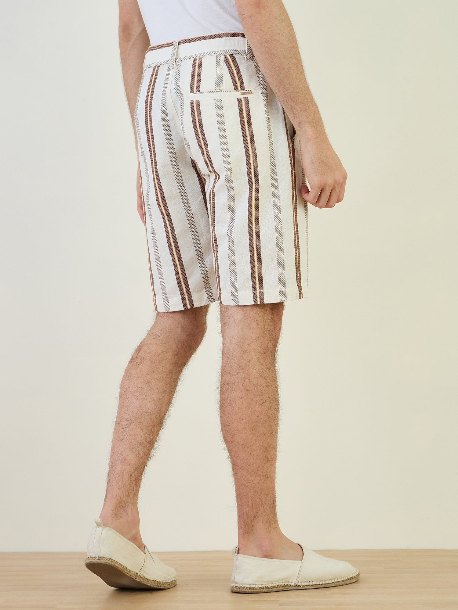 Discover the perfect blend of style and comfort with our men's casual shorts in a versatile beige color. Crafted from pure cotton, these shorts offer a soft and breathable feel, ideal for warm weather. The regular fit and mid-rise design ensure a comfortable and flattering silhouette. Featuring a textured pattern with yard-dyed stripes, these shorts add a touch of sophistication to your casual wardrobe. The button and drawstring closure provide a secure fit, making them perfect for any laid-back occasion.